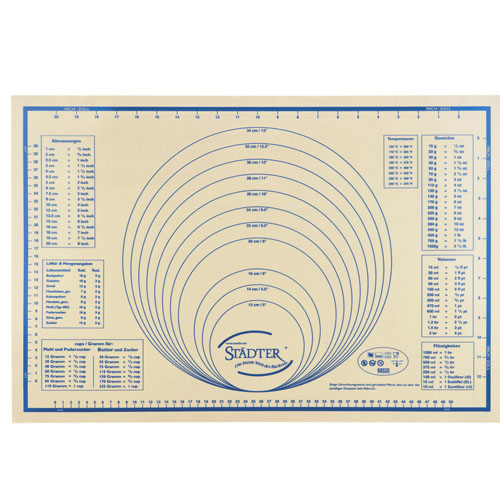 Ausrollmatte, Backmatte und Frostermatte mit Silikonbeschichtung. Mit der Antihaft-Oberfläche wird kein Teig, kein Marzipan kleben bleiben. Sie ist rutsch- und backofenfest. Auf der Matte sind die wichtigsten Masseinheiten, die man zum Backen braucht.