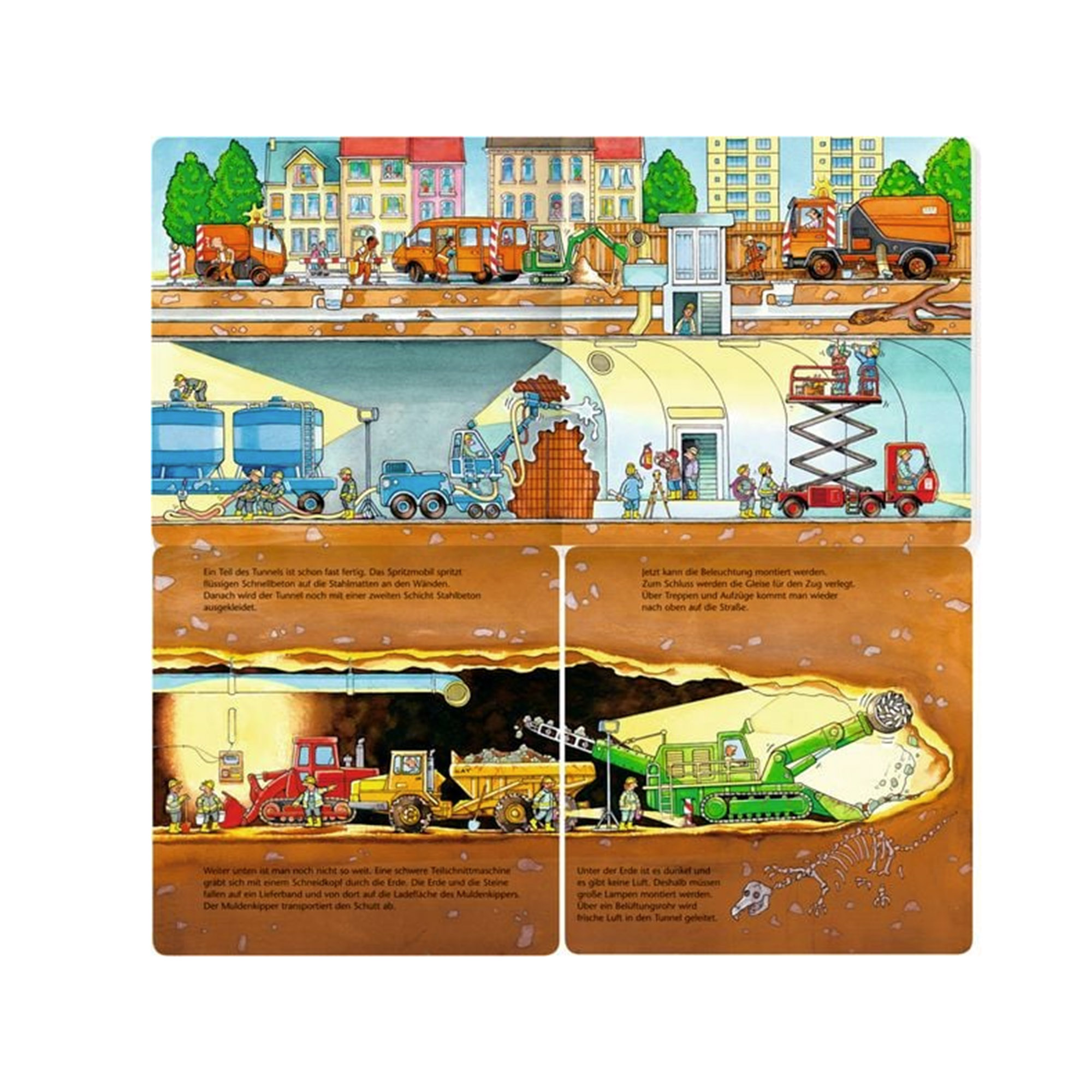 In der Stadt gibt es viele grosse Baustellen. Aber nicht alle Baustellen sind gleich. Manchmal wird sehr hoch nach oben gebaut und manchmal tief hinunter unter die Erde. Und wie bekommt man eine Brücke über den Fluss? Mit drei grossen Ausklappseiten werden die für Kinder so faszinierenden Baustellen gezeigt. Zum "Ganz-in-Ruhe-Betrachten"!