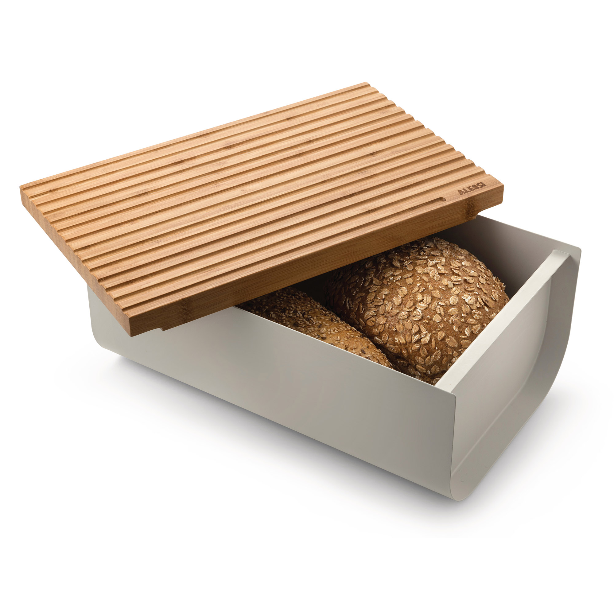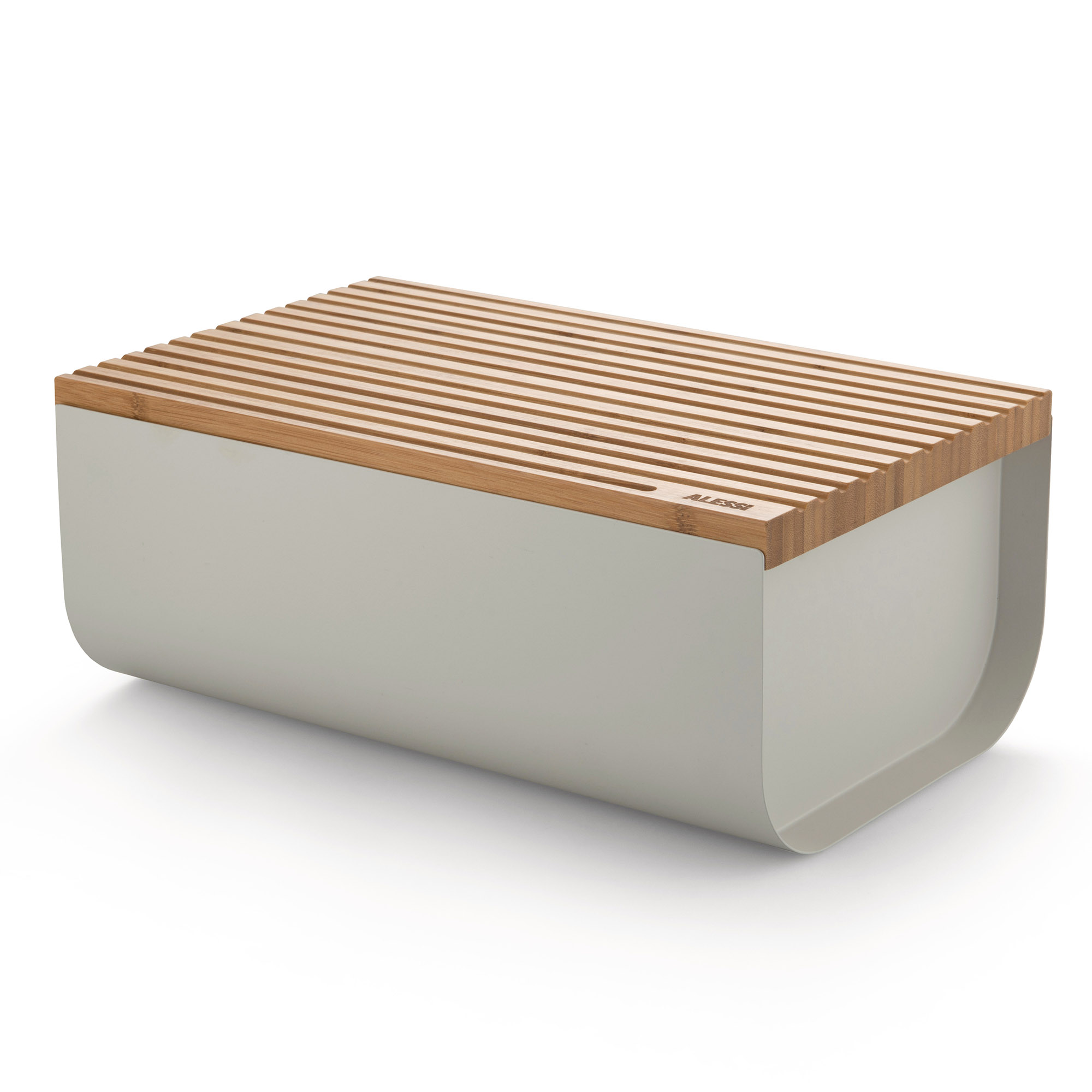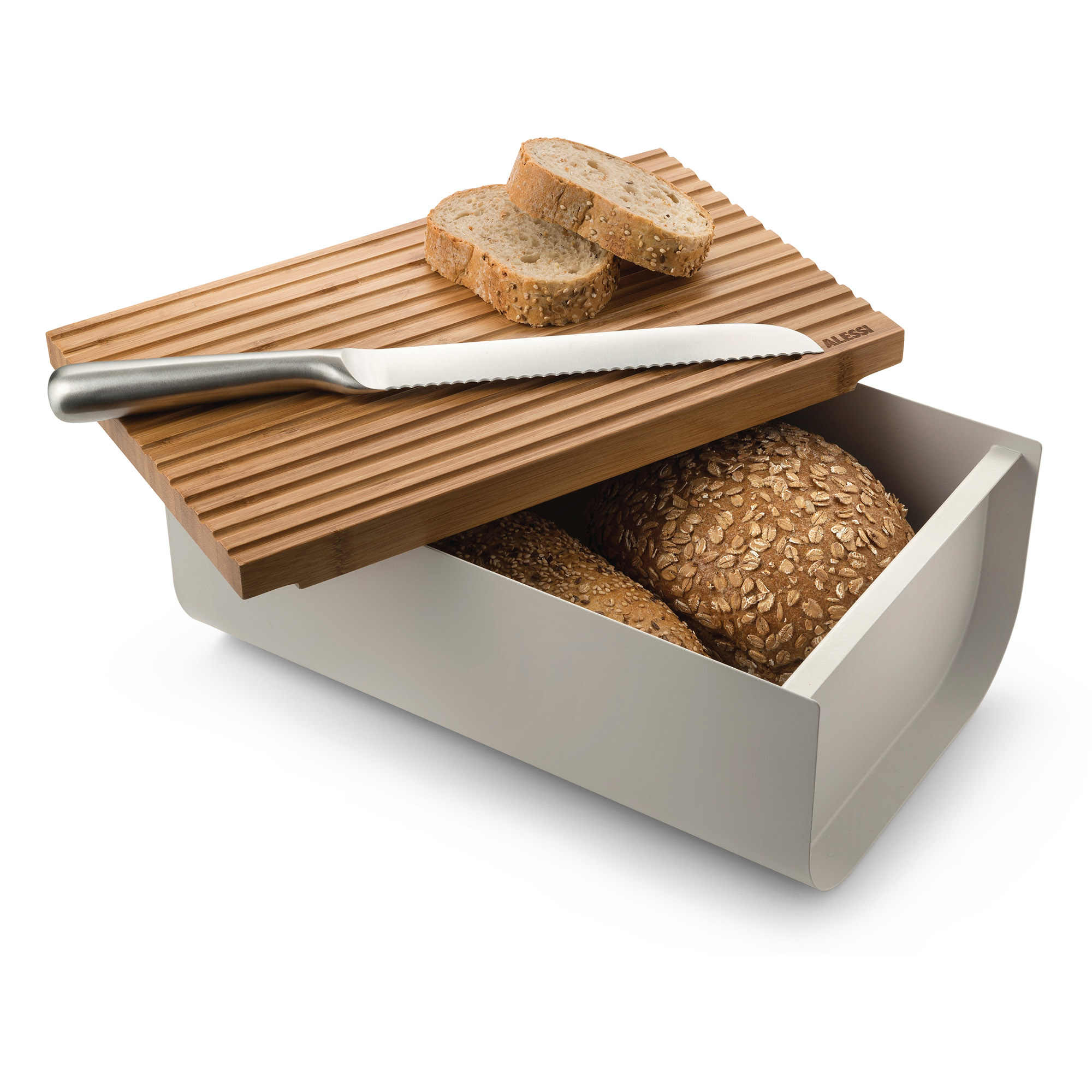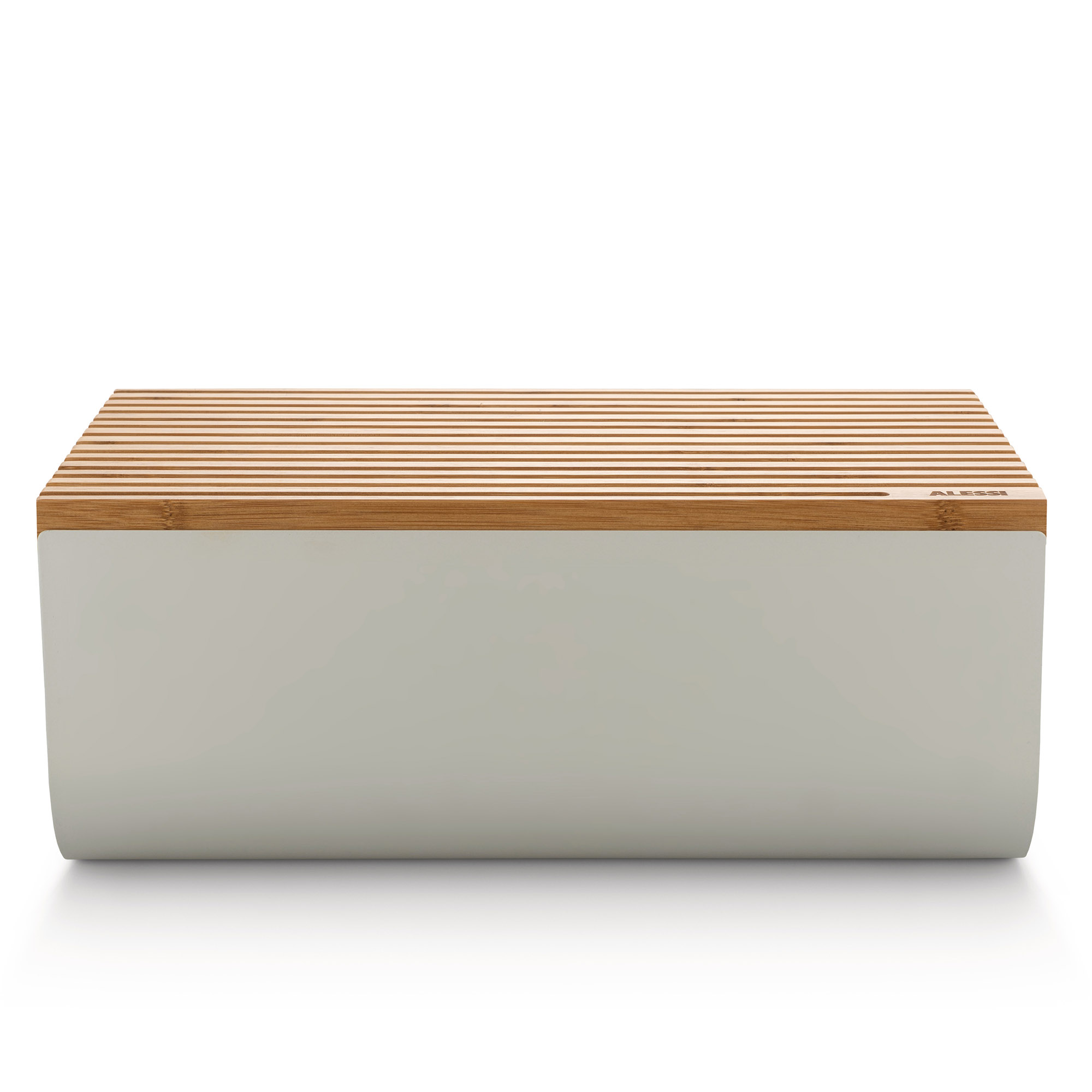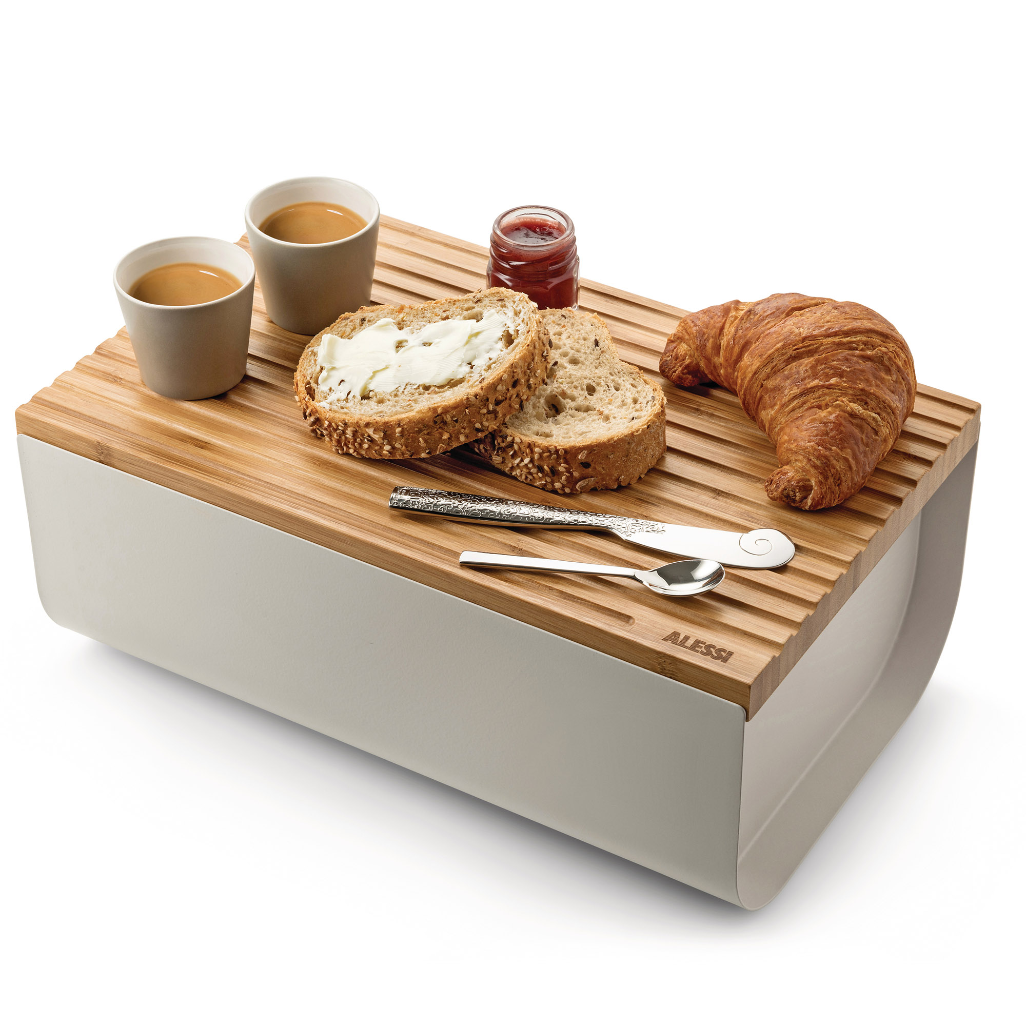 Der Brotkasten Mattina von Alessi wurde von dem Design-Trio Big-Game entworfen. Er besteht aus Stahl und hat einen Deckel aus epoxidharzlackiertem Bambusholz. Der Deckel dient gleichzeitig als Schneidebrett und ist so strukturiert, dass die Krümel sich nicht auf dem Esstisch verteilen. Durch das schlichte und zeitlose Design können Sie den Kasten auch gut zum Servieren des Brotes auf dem Frühstückstisch verwenden.