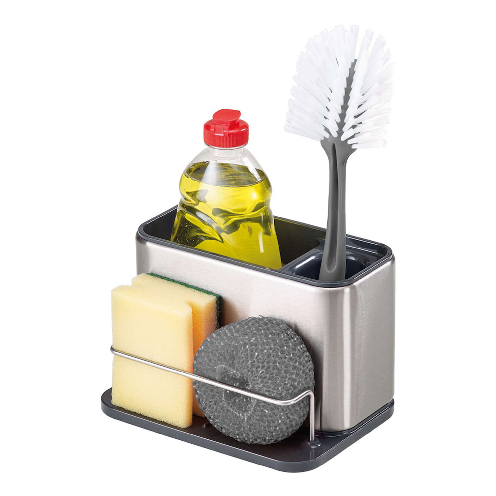 Der Organizer ist in zwei Bereiche unterteilt. Im hinteren Bereich finden die Spülbürste und das Spülmittel seinen Platz und davor Schwämme und der Scheuerlappen. Der leicht schräge Boden sammelt Wasser, welches über eine Öffnung abgelassen werden kann.