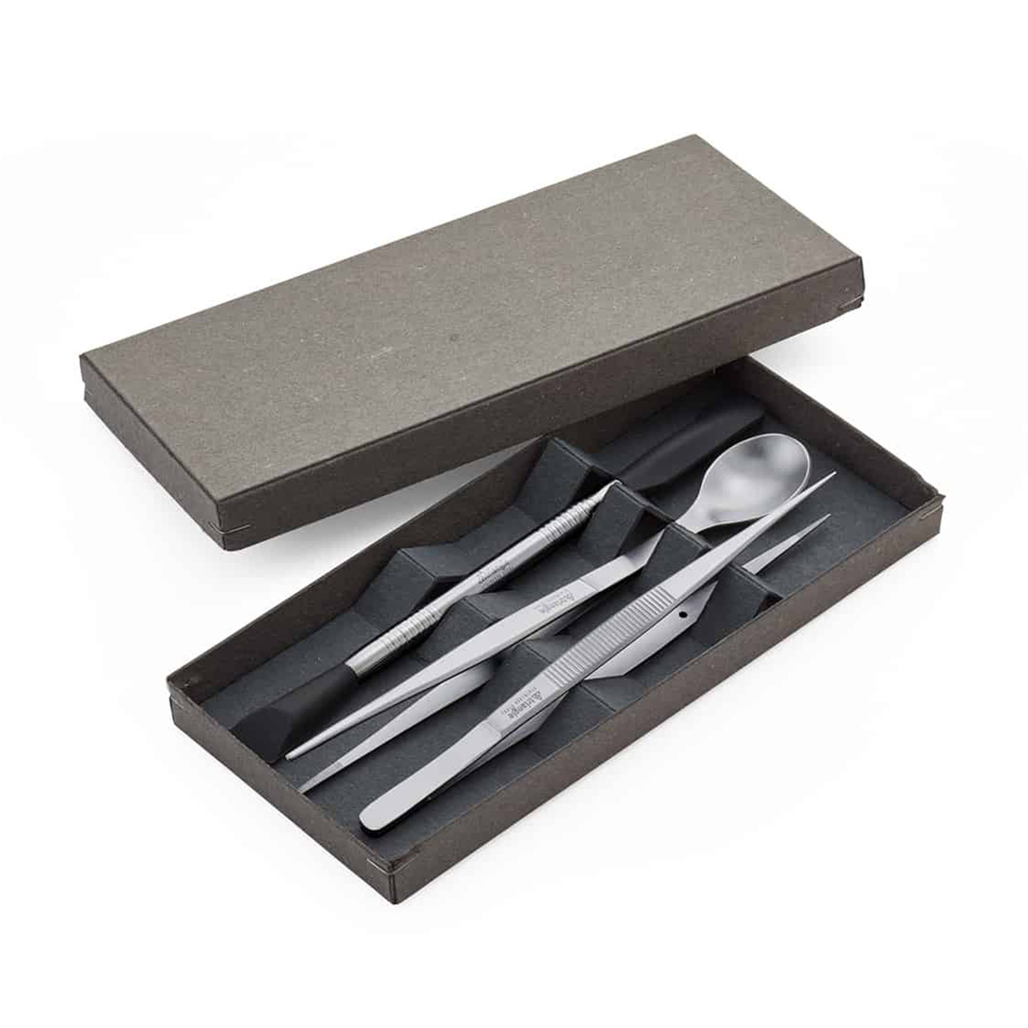 Das 3-teiliges Set besteht aus einem Probierlöffel mit integrierter Pinzette, einem Dekorierspachtel, einer 15 cm grossen Präzisionspinzette und eignet sich für den Final Touch beim Kochen und Anrichten.