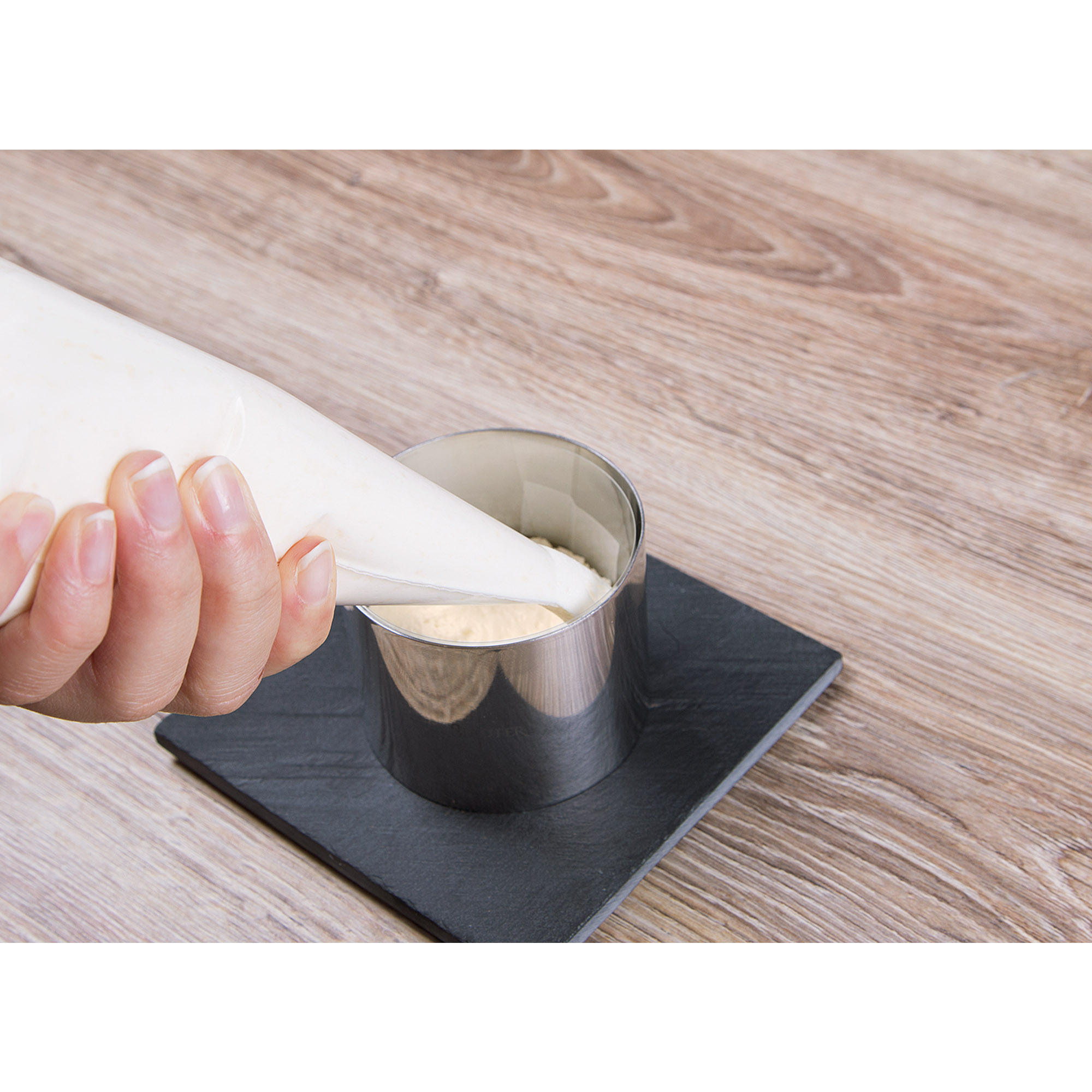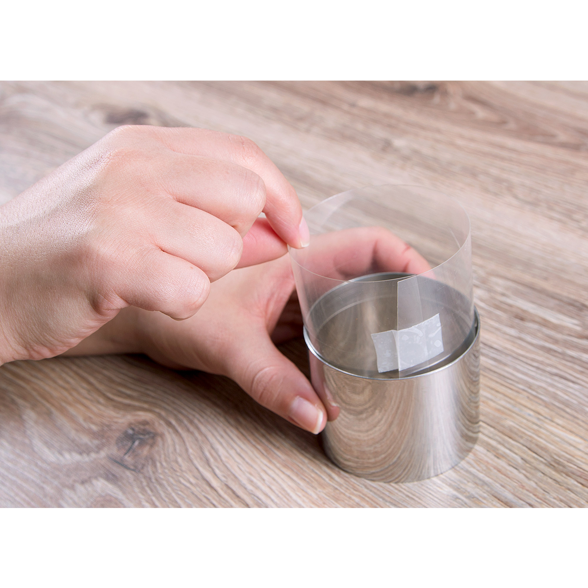 Mit einem Dessertring können viele Speisen kreiert werden. Damit dies auch zu einer sauberen Sache wird hilft diese Folie. Sie wird einfach auf die entsprechende Länge zugeschnitten, am Enden mit einem Klebstreifen fixiert und in den Dessertring gelegt.