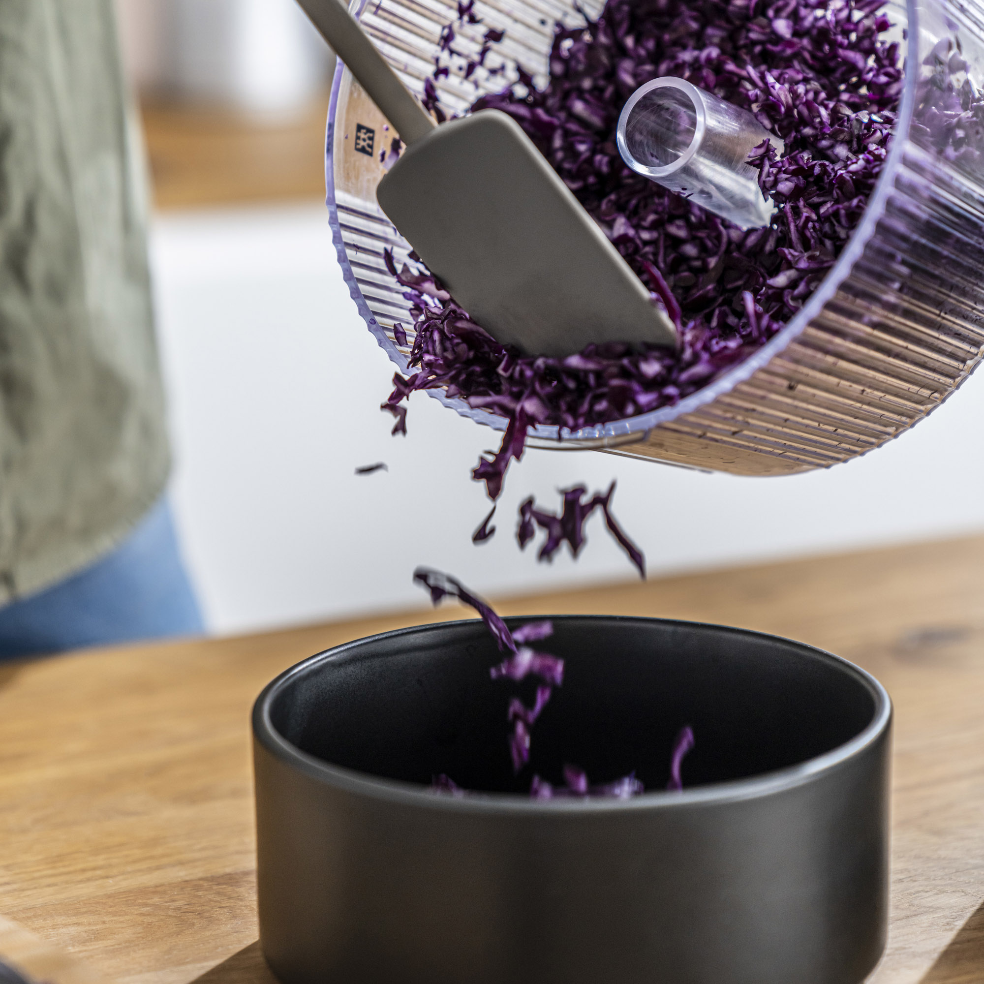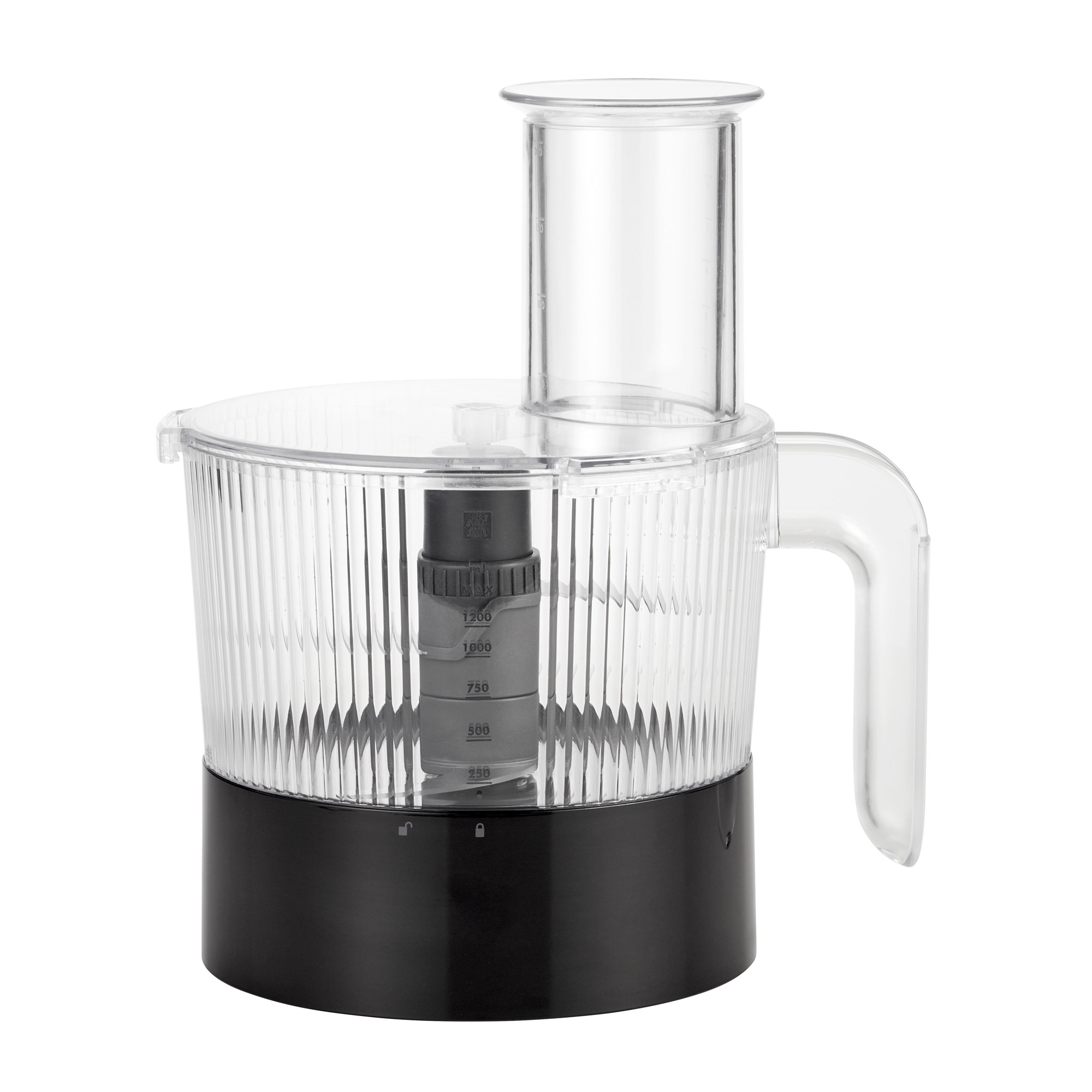Der Food Processor macht aus dem Hochleistungsstandmixer Pro einen Multifunktionsmixer. Er verfügt über ein Fassungsvermögen von 1.2 Litern und hat fünf verschiedene Aufsätze die sieben verschiedene Funktionen abdecken. So hat das Küchengerät zwei Klingenscheiben: eine grobe und eine feine. Jede Scheibe hat eine Seite zum Schneiden von Kartoffeln, Gurken oder anderem Gemüse und eine Seite zum Raspeln von Käse, Schokolade etc. Ausserdem verfügt die Küchenmaschine über einen Knethaken zum Teigrühren, ein Hackmesser zum Häckseln von Fleisch, Gemüse oder Nüssen sowie einen Rühraufsatz zum Aufschlagen von Eischnee, Sahne oder Mayonnaise.