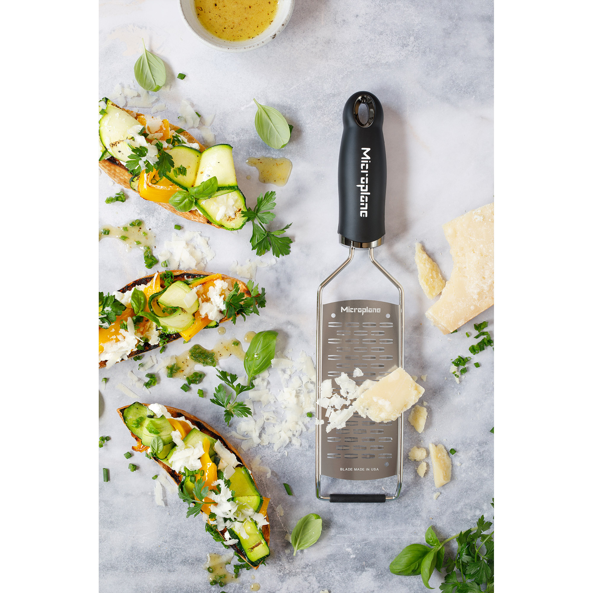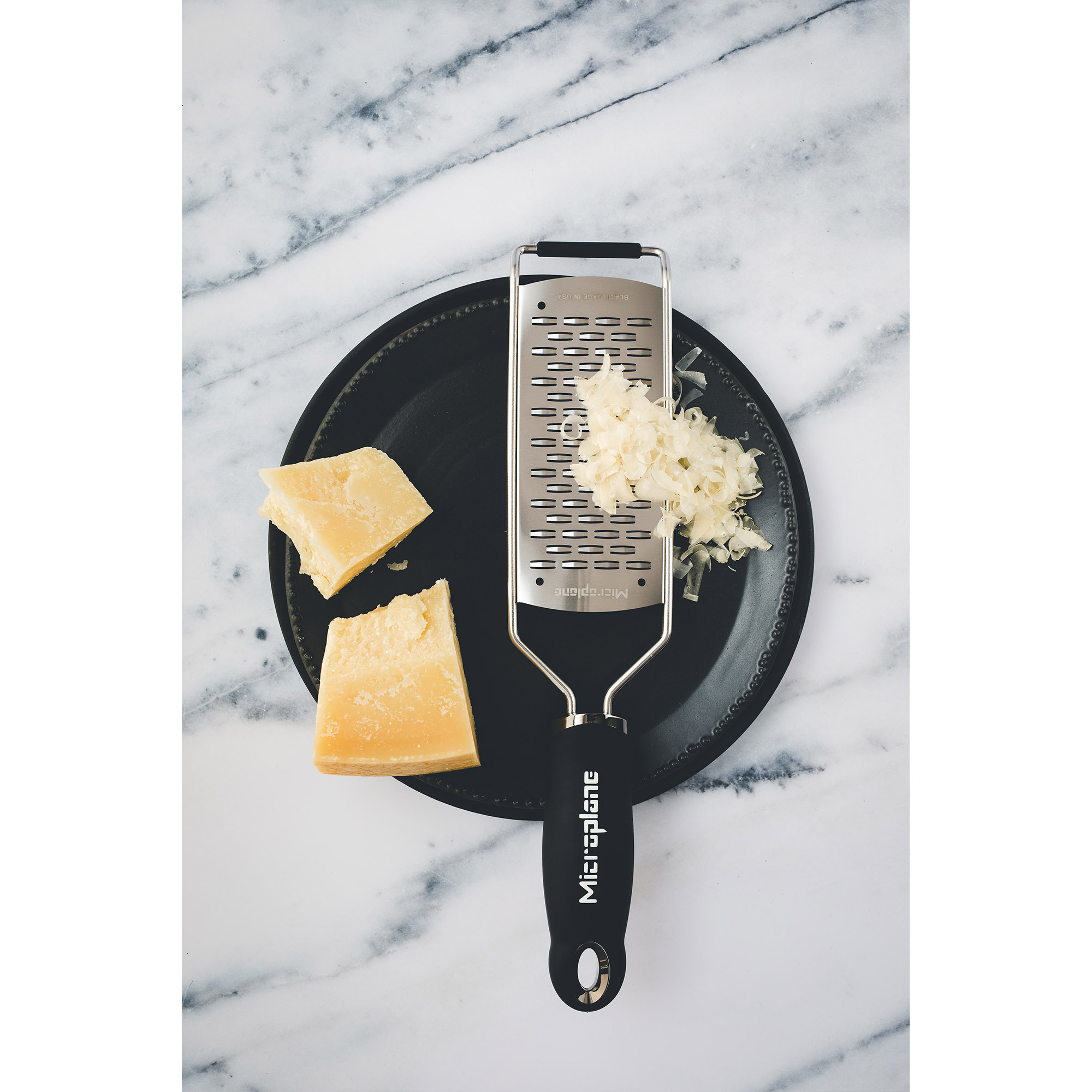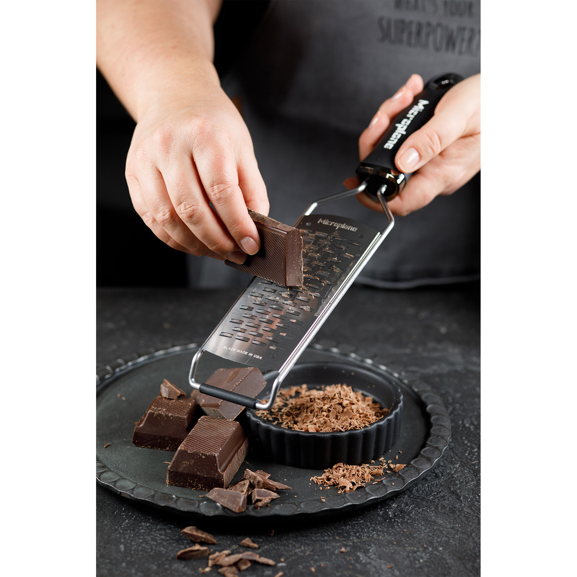 Sie erzeugt ein feines, längliches Reibresultat, das sich ideal für Käse, Schokolade, Gemüse oder Obst eignet.