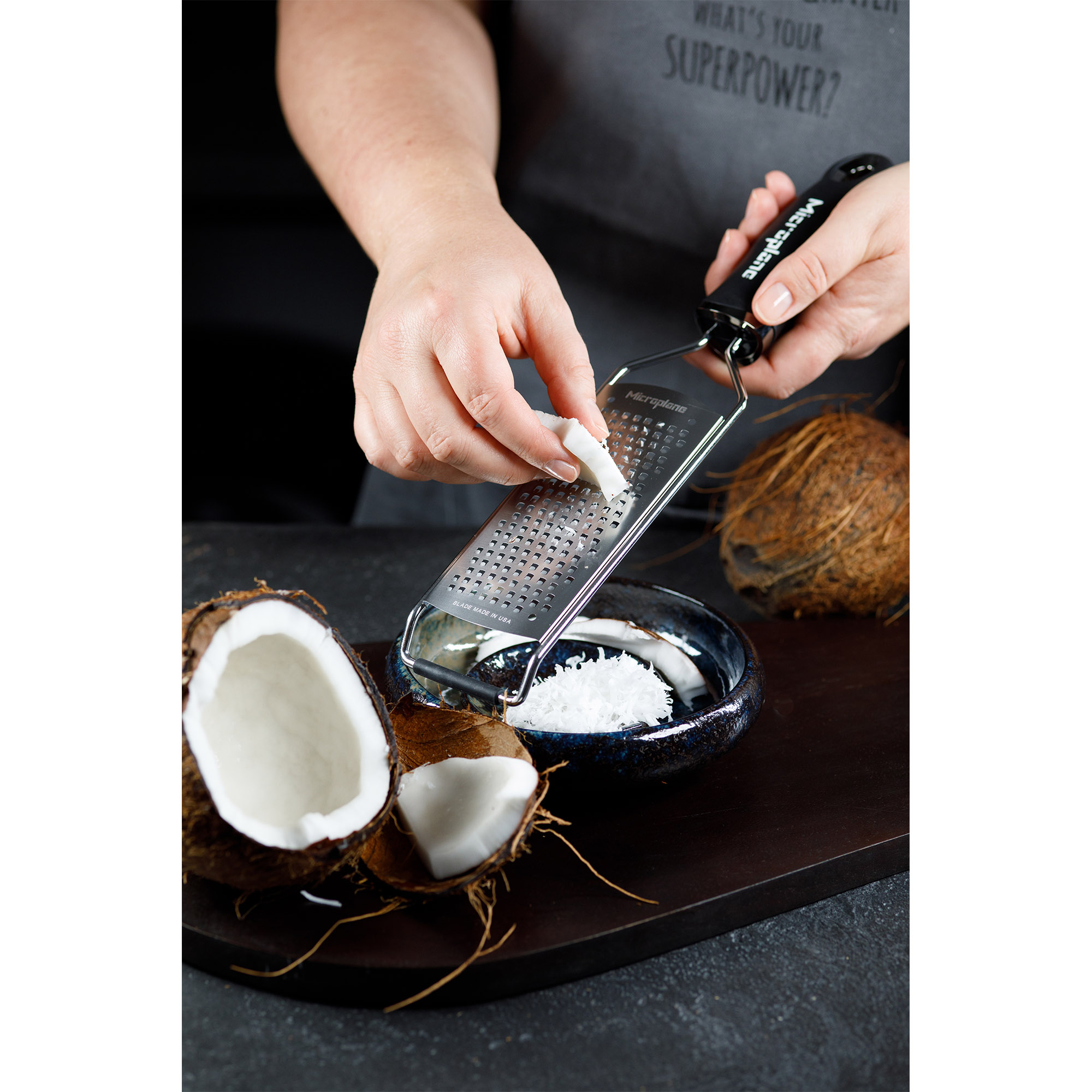 Die grobe Reibe zerkleinert Lebensmittel wie Käse, Karotten, Ingwer, Knoblauch oder Kokosnüsse mühelos.