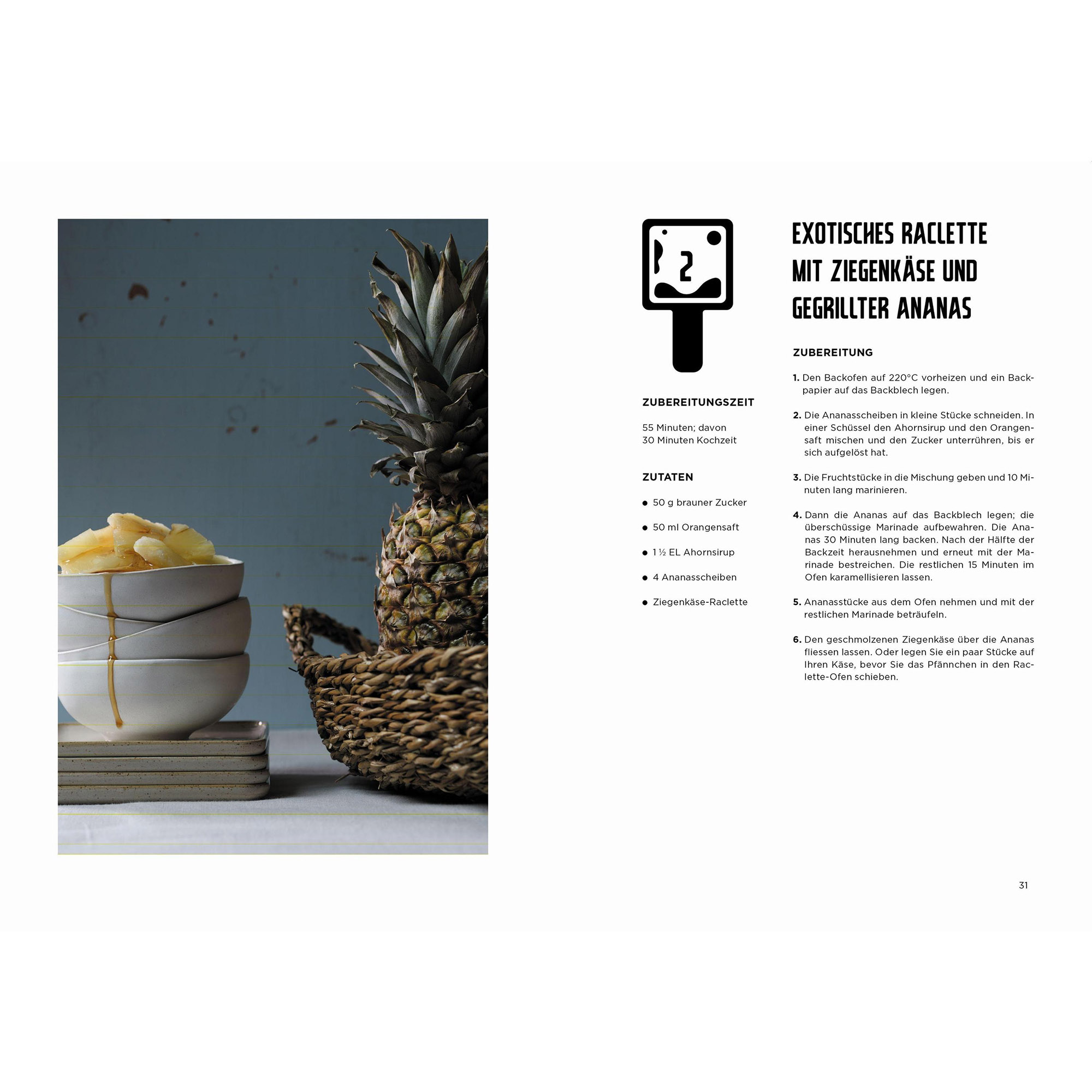 In diesem Buch bleibt der Käse im Mittelpunkt. Aber die Beilagen und Beläge sind kreativ und divers. Es ist für jeden Geschmack und für jede Jahreszeit etwas dabei: Entscheiden Sie sich für eine Sommerkreation mit eingelegten Paprikaschoten, ein Herbst-Raclette mit Kastanien und getrocknetem Fleisch oder lassen Sie sich von der Kombination von Ziegenkäse und gegrillter Ananas überraschen. Wagemutigere versuchen ein »japanisches« Raclette mit Wasabi und mariniertem Ingwer: Szenenwechsel garantiert!