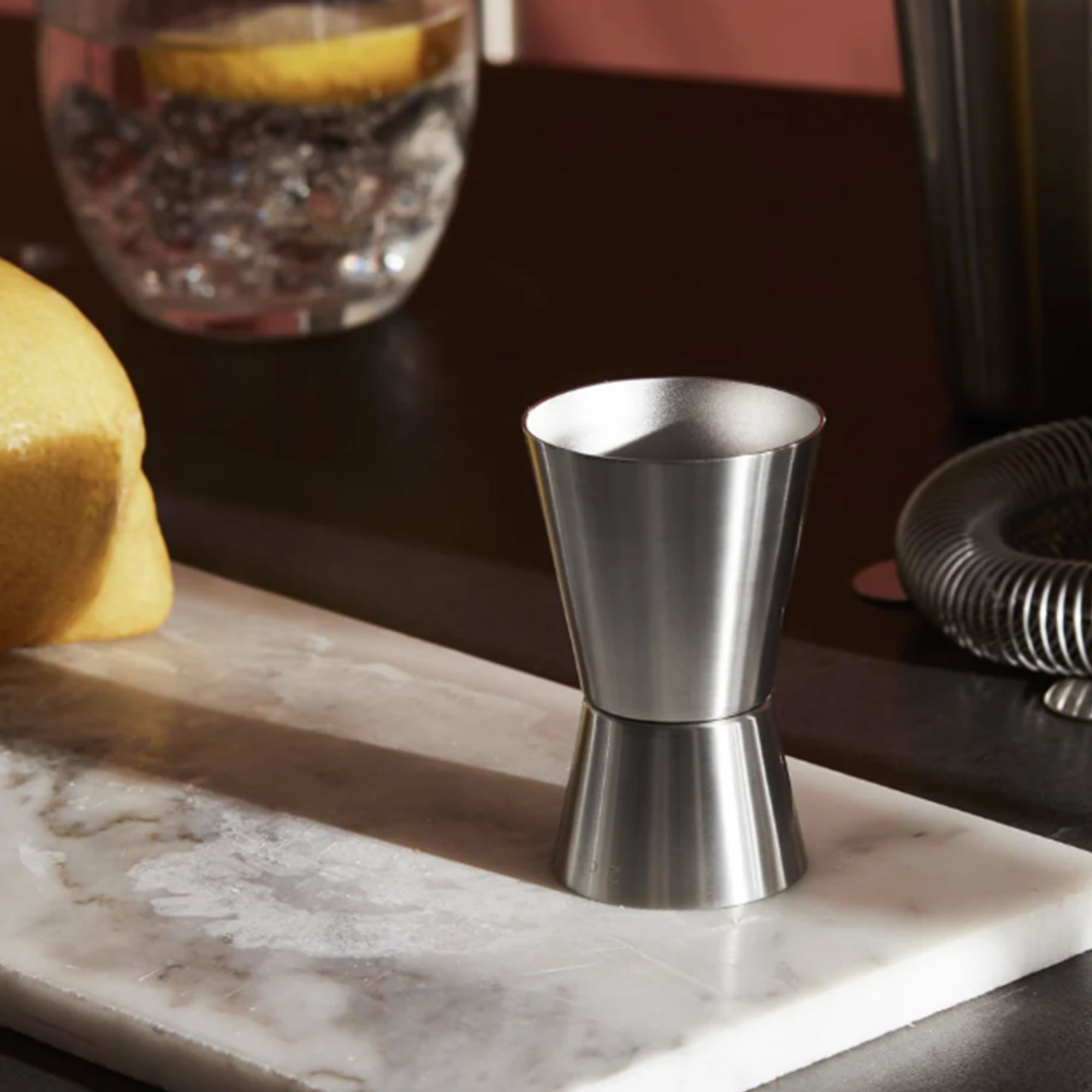 Dieser edle Messbecher aus glänzend poliertem Edelstahl ist das perfekte Werkzeug für alle, die Cocktails mit Liebe zum Detail zubereiten. Ob Wodka, Sirup oder Soda – mit ihm lassen sich Zutaten mühelos und präzise abmessen. So wird das Mixen zum echten Vergnügen.