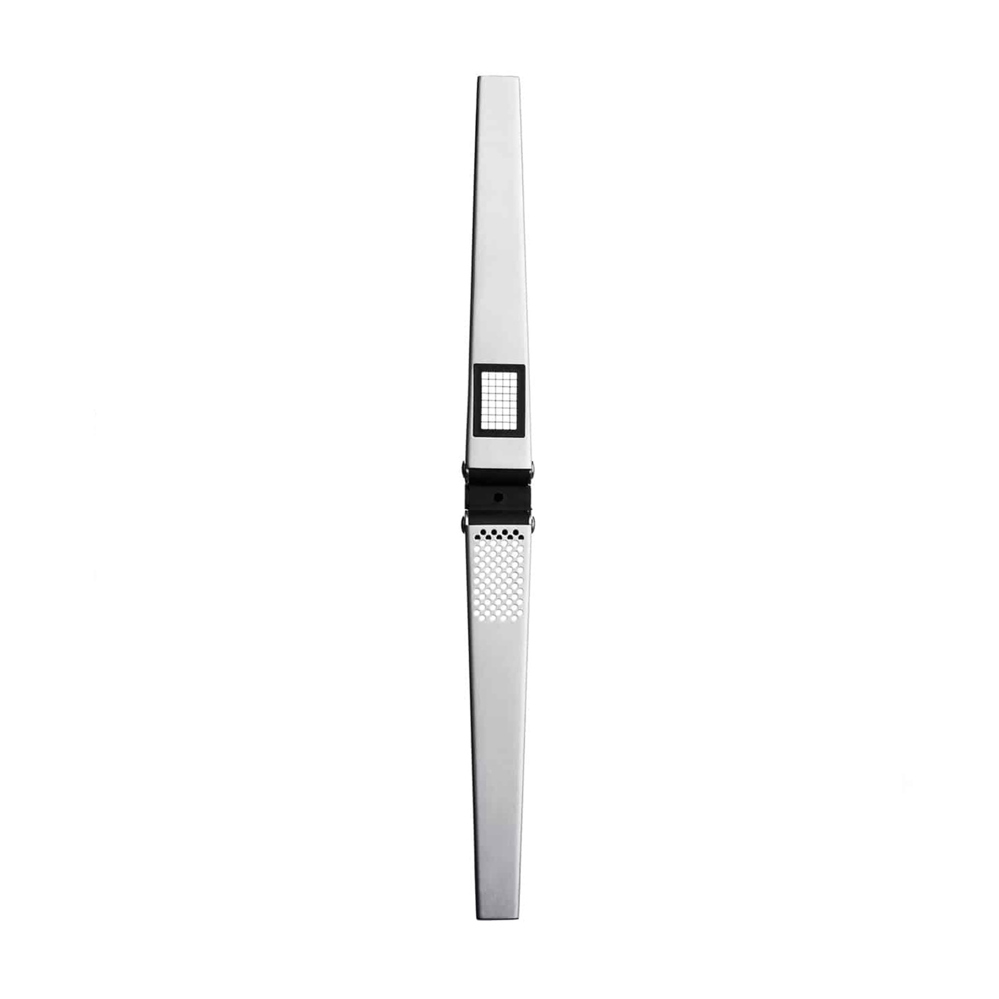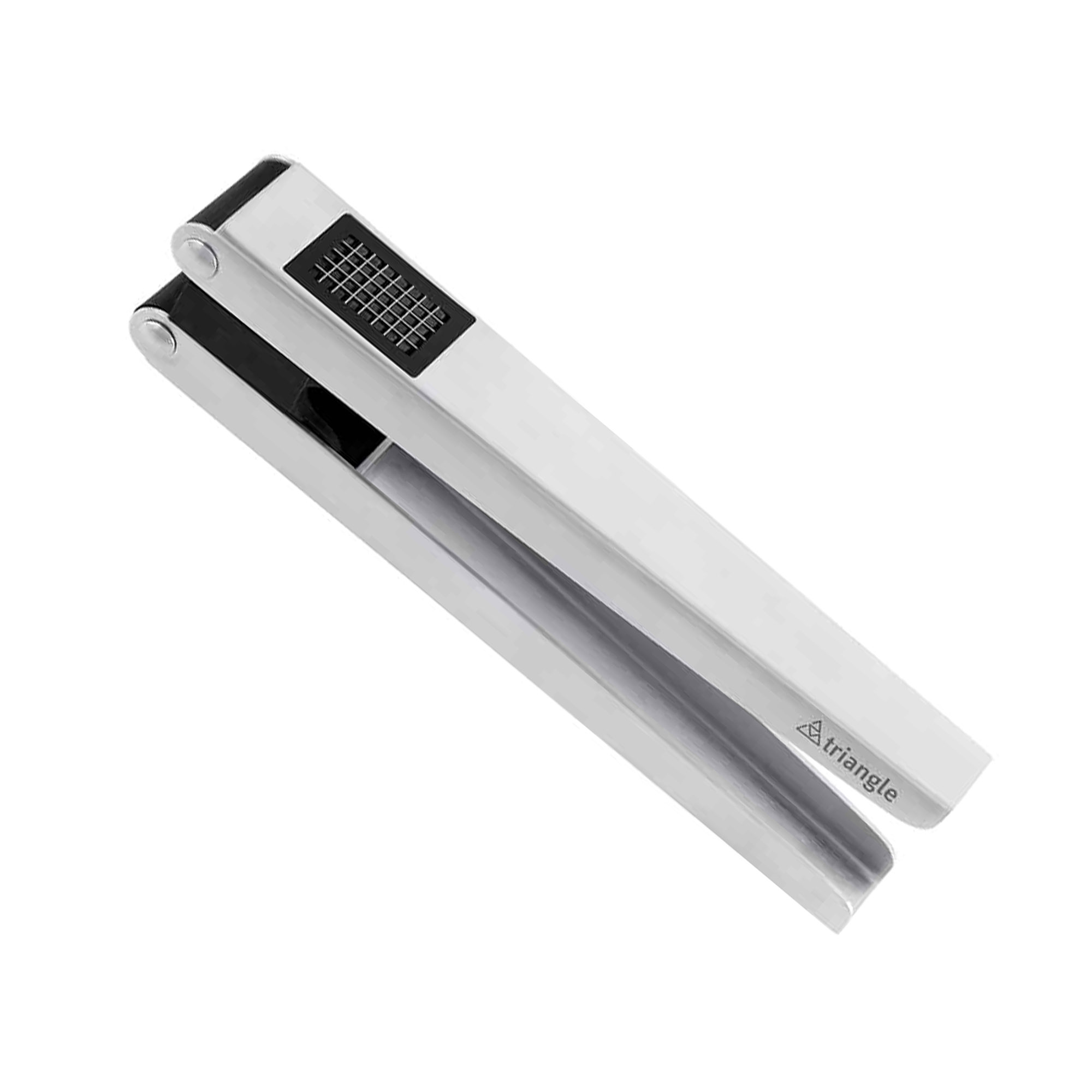 Dies ist eine Knoblauchpresse und Knoblauchschneider in einem Werkzeug. Eine klassische Knoblauchpresse auf der einen Seite, ein durchdachter Knoblauchschneider auf der anderen. Auf der Schneideseite wird die Knoblauchzehe durch ein scharfes Gitter von 3 x 3 mm gepresst, so dass feine Stifte entstehen. Fährt man während des Pressens mit einem Messer am Schneidgitter entlang, entstehen beliebig feine oder auch grobe Würfel.