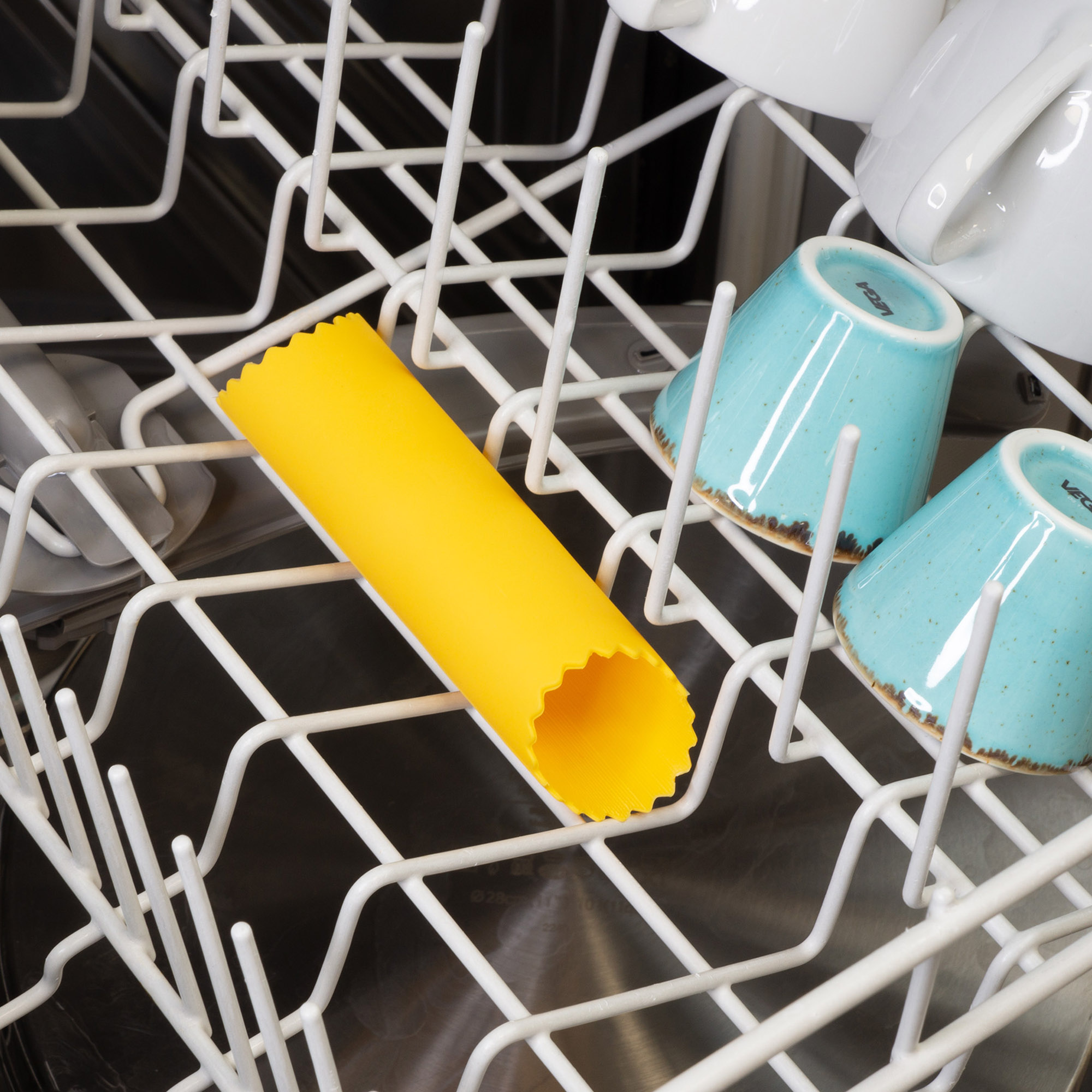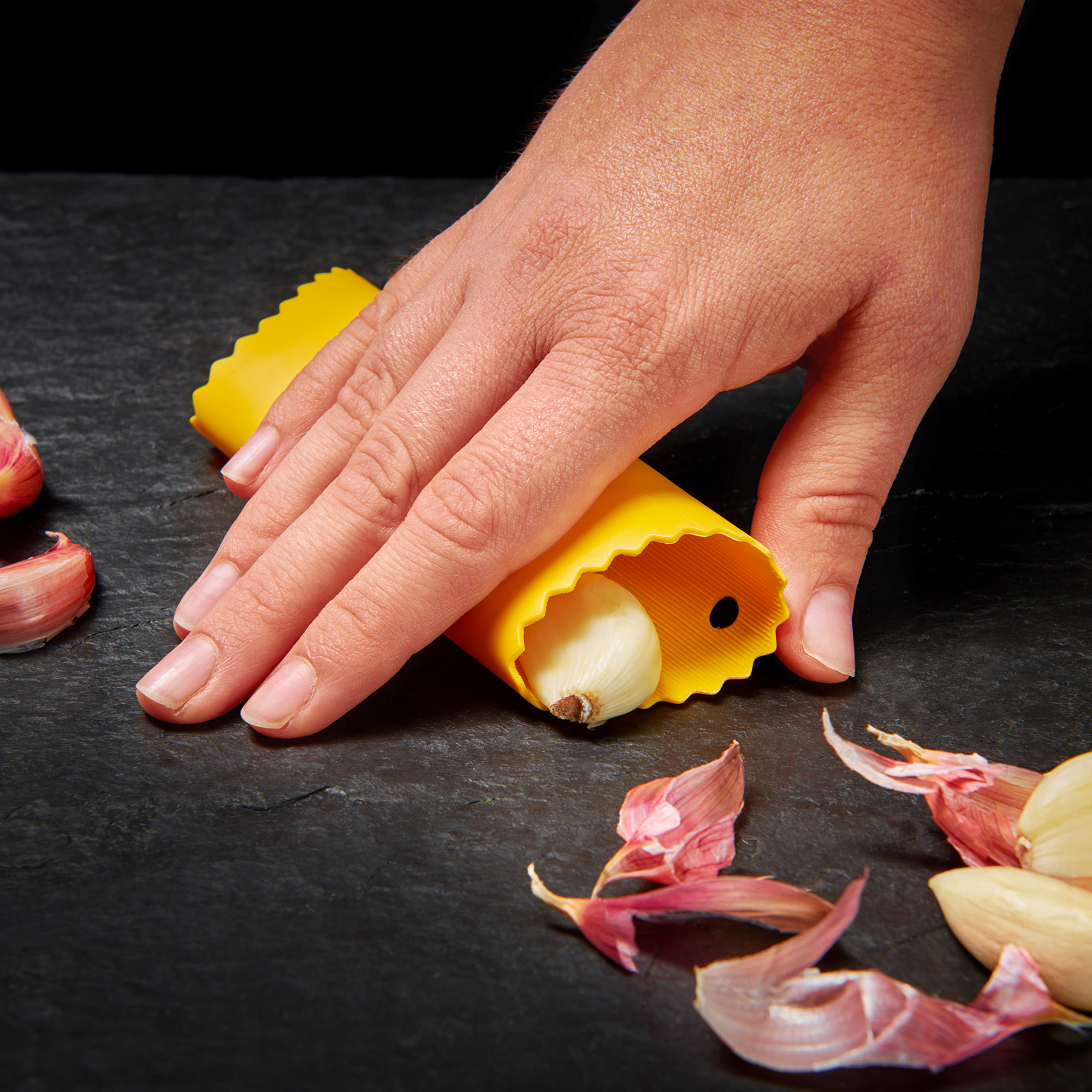 Dazu legst du die Zehe in die Silikonrolle und bewegst sie hin und her. So wird die Zehe geschält, ohne dass du sie lange in der Hand halten musst.