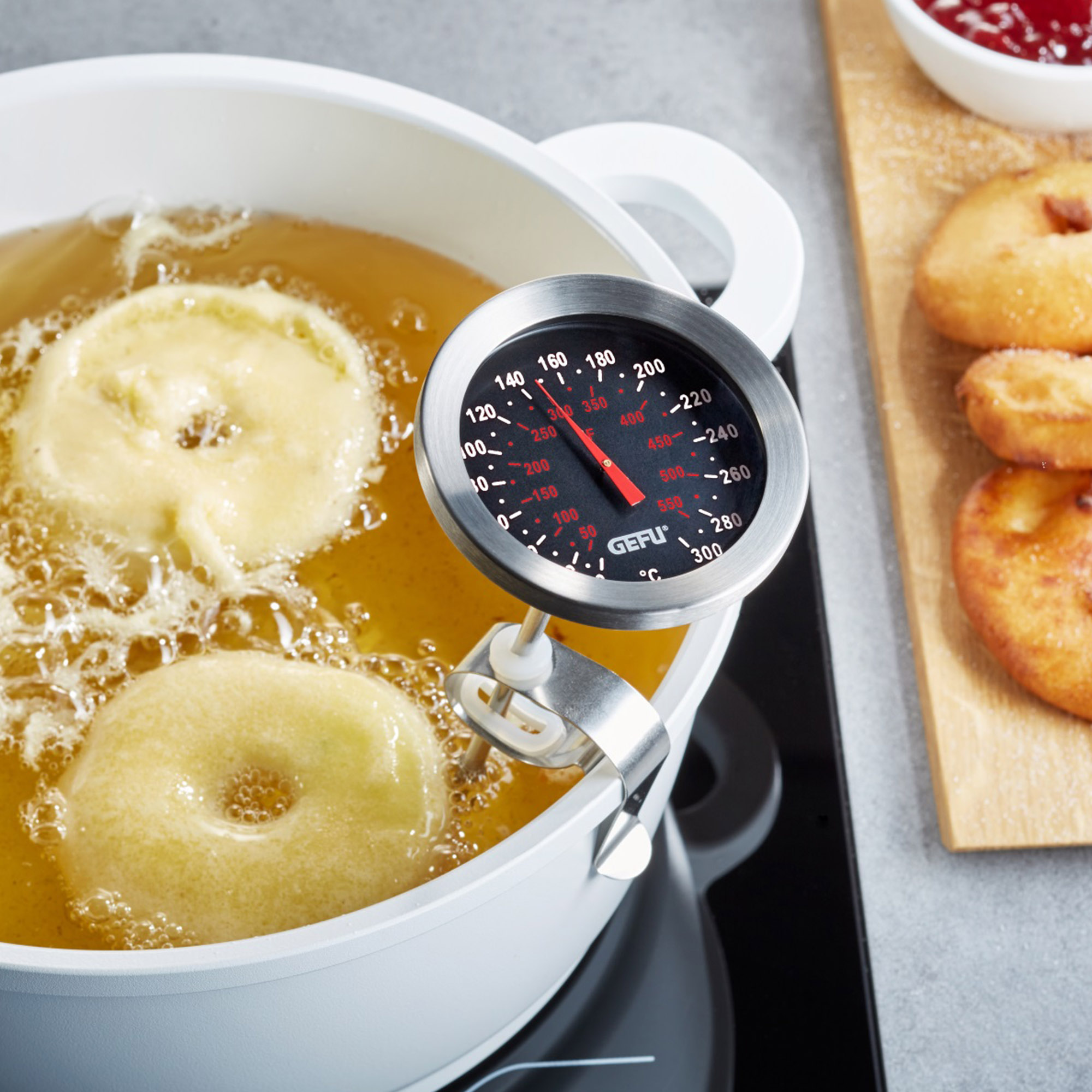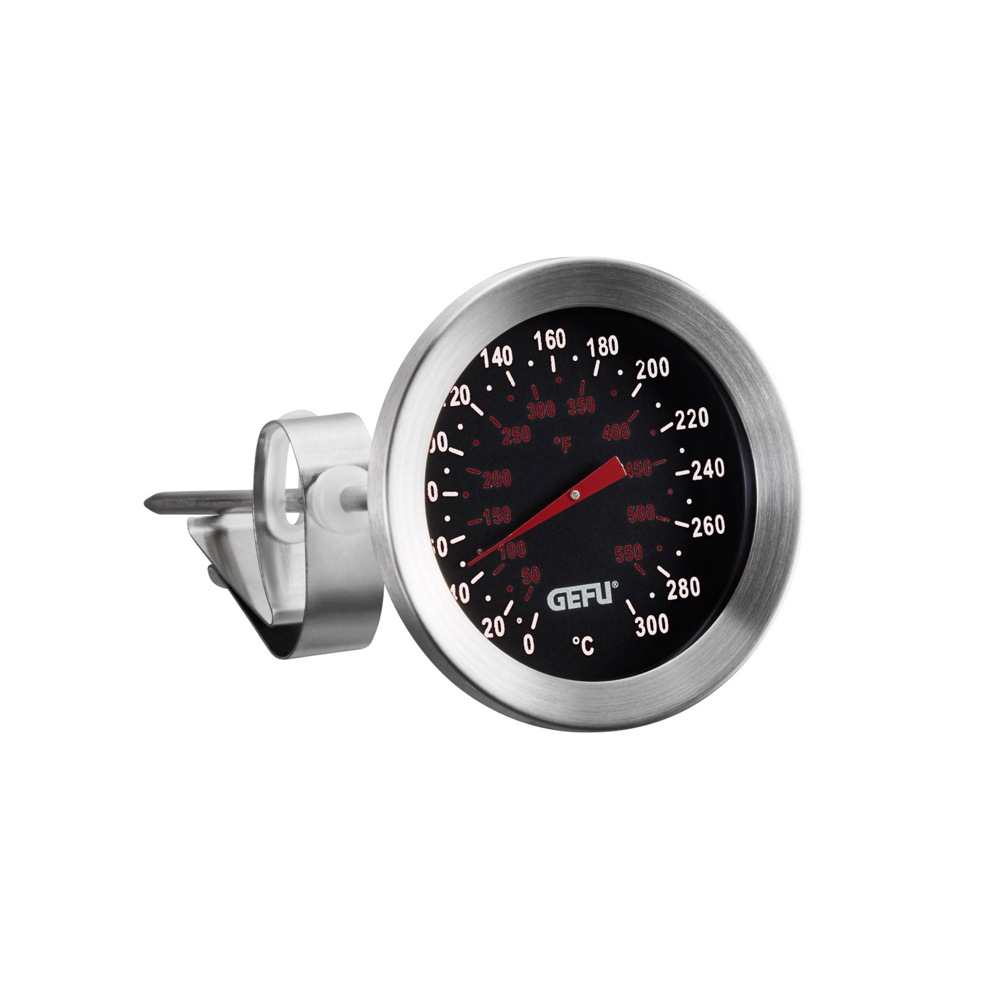 Der perfekt gegarte Braten, der optimale Schmelzpunkt für Kuvertüre, die ideale Frittierfett-Temperatur: Das Küchenthermometer liefert dafür die Gradzahlen – in Celsius und Fahrenheit. Durch eine praktische Klammer kann das Thermometer einfach am Topfrand fixiert werden.
