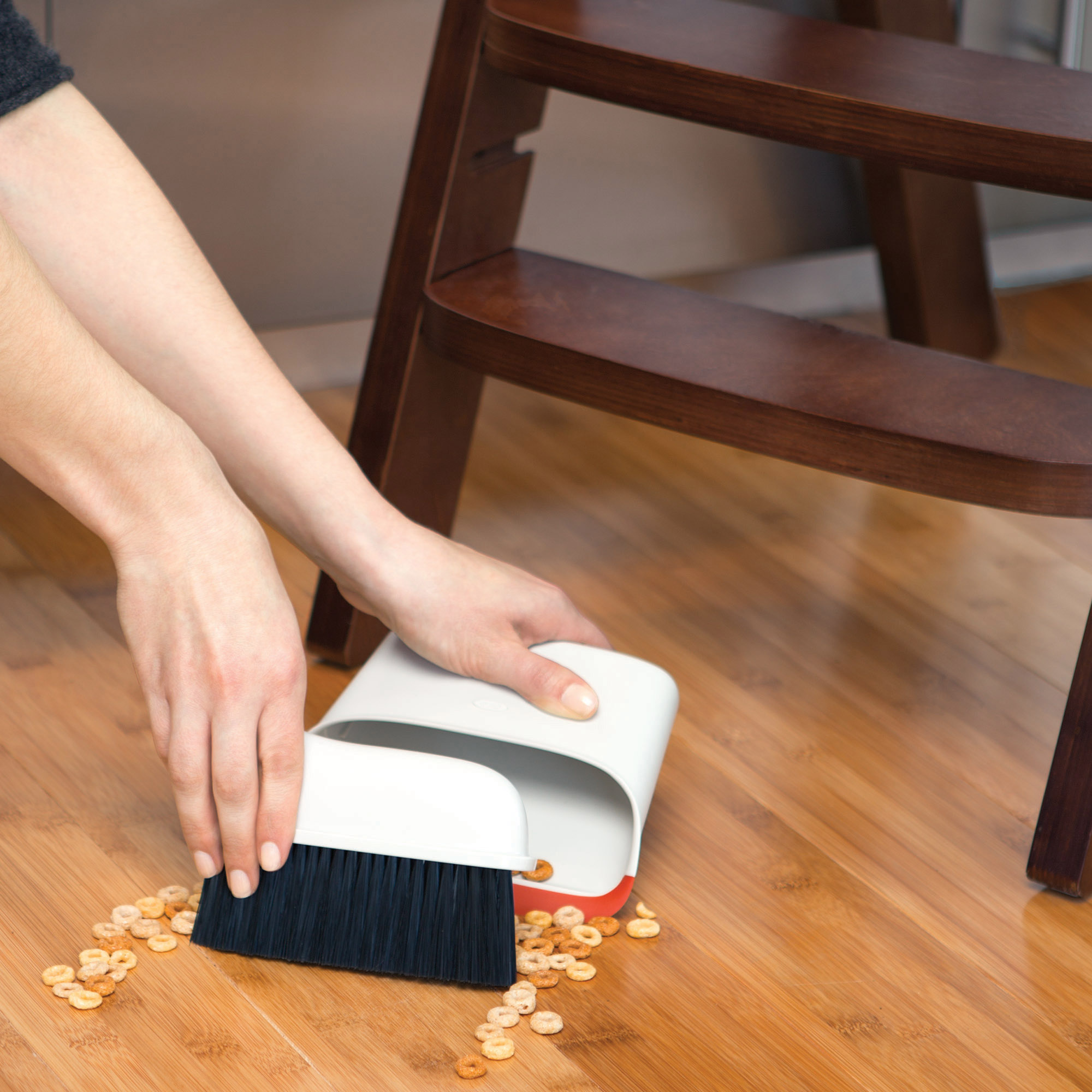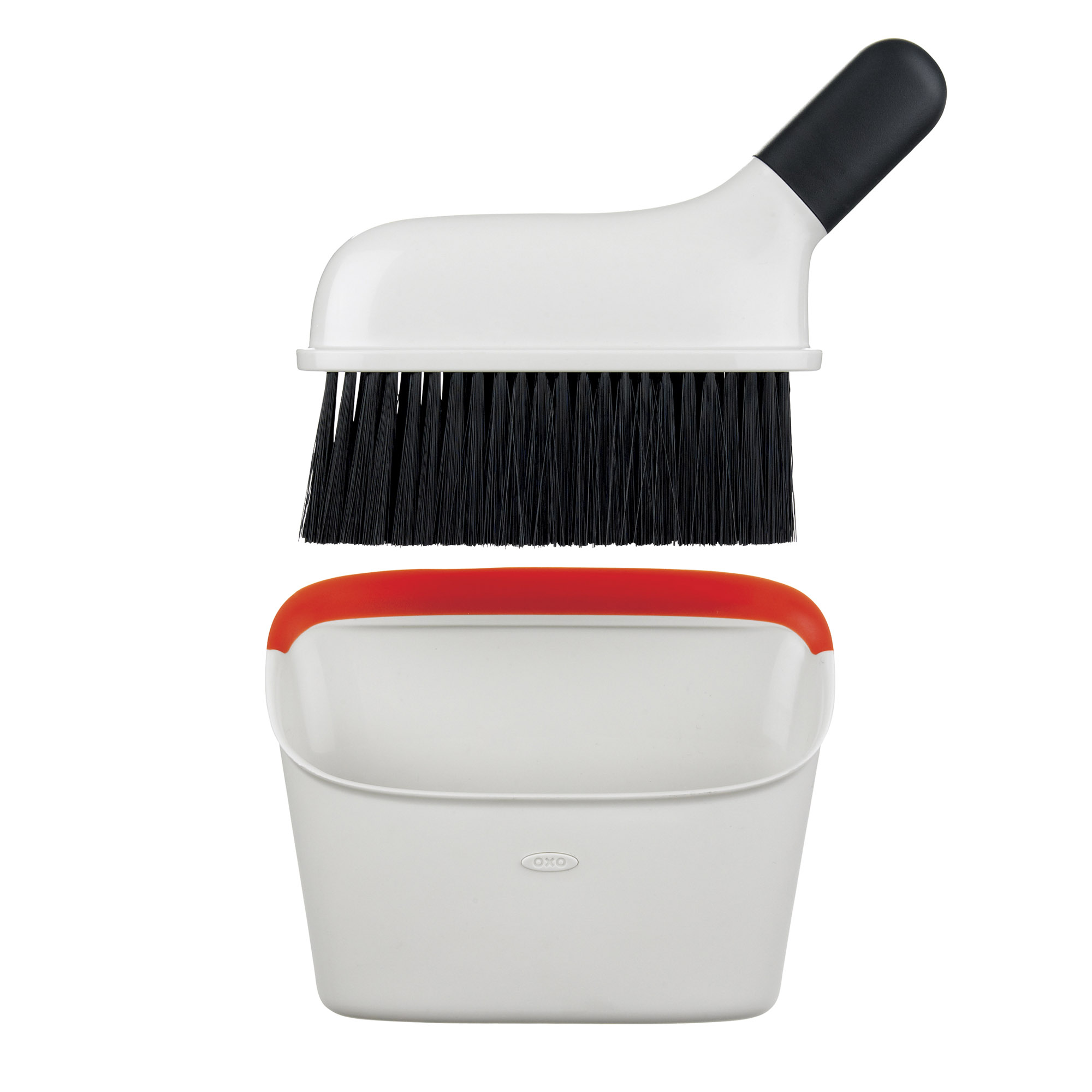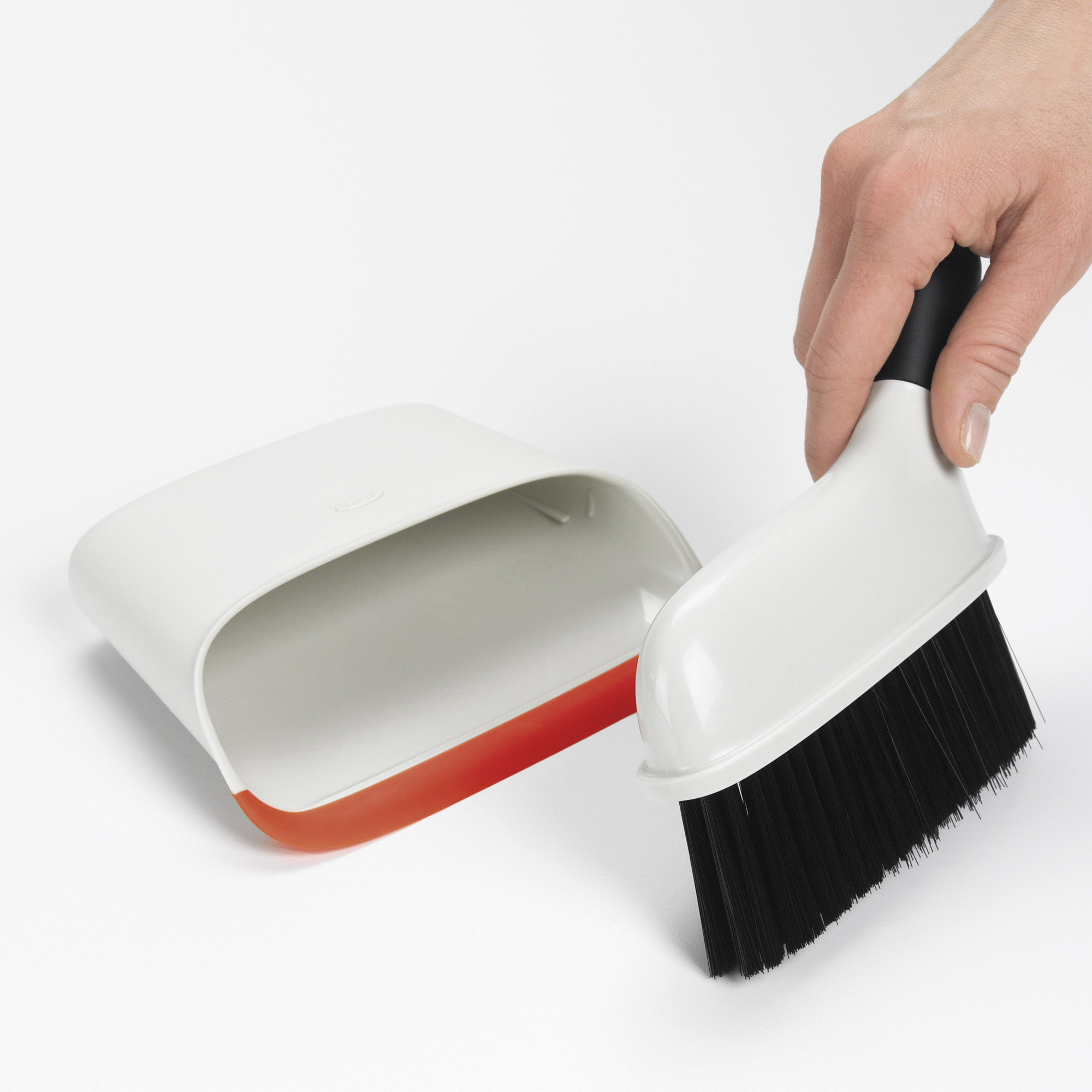Ein kompakter kleiner Handfeger. Die Gummilippe an der vorderen Kante der Kehrschaufel ermöglicht eine effiziente Reinigung. Nach dem Gebrauch wird die Bürste in der Kehrschaufel, wo sie einrastet, verstaut.