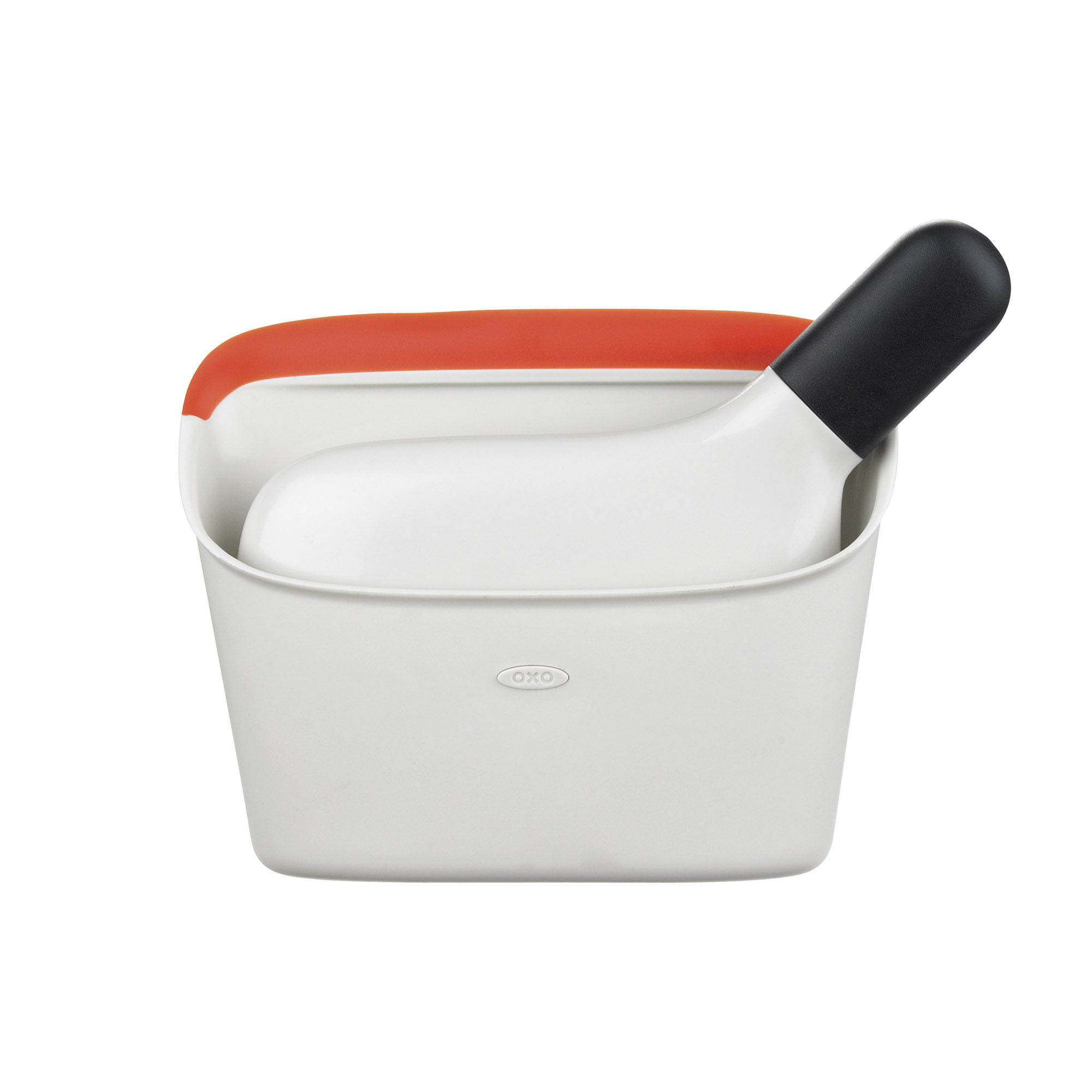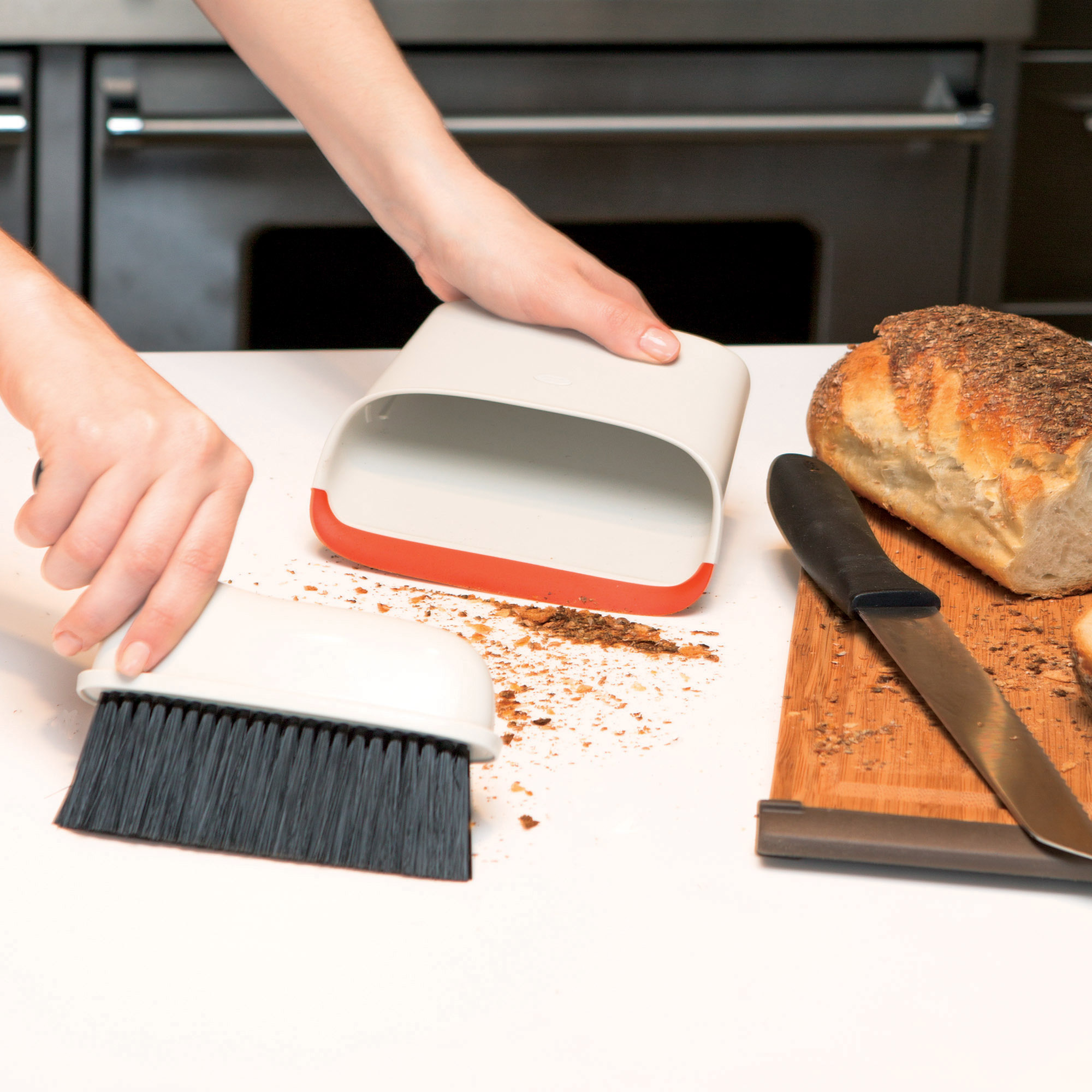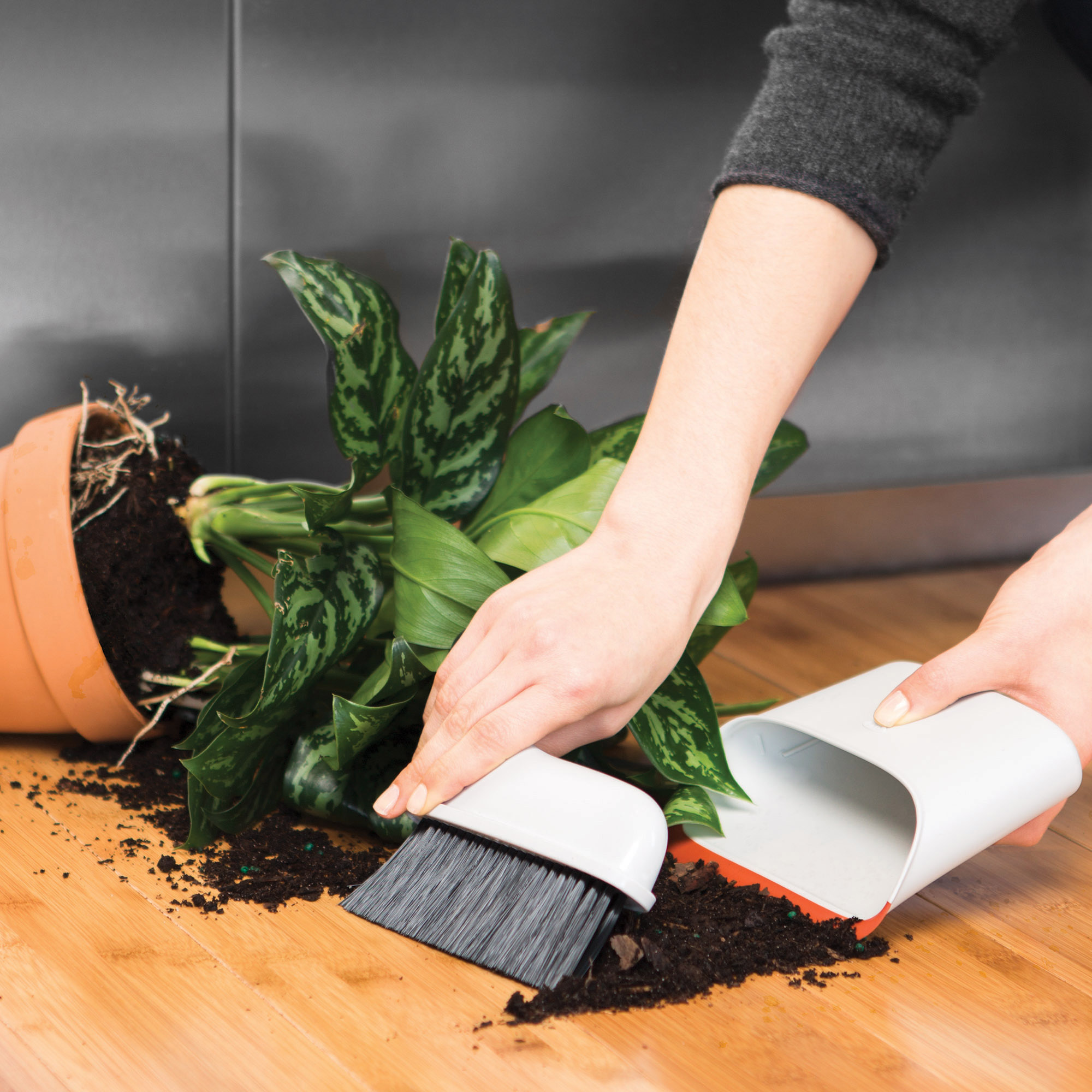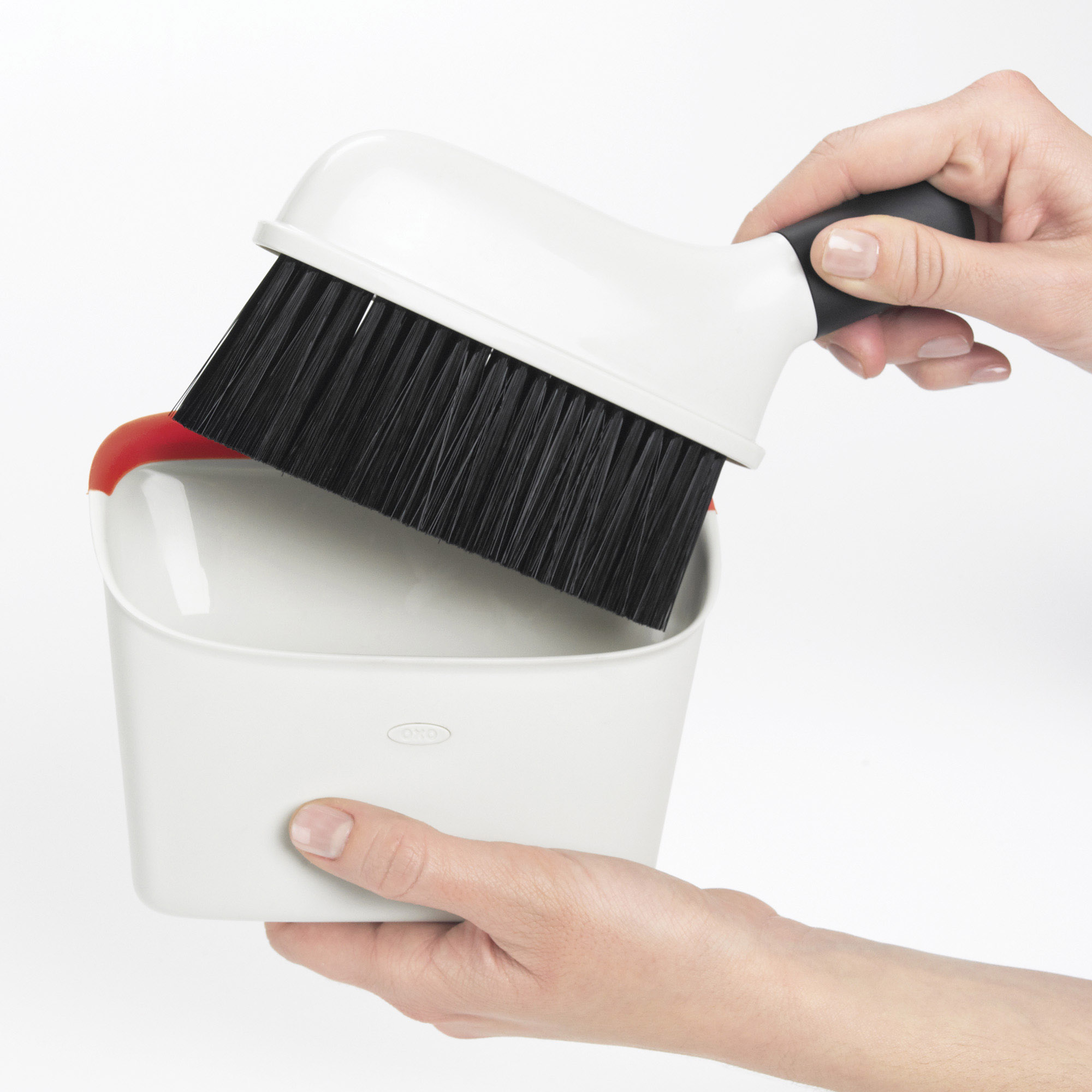 Ein kompakter kleiner Handfeger. Die Gummilippe an der vorderen Kante der Kehrschaufel ermöglicht eine effiziente Reinigung. Nach dem Gebrauch wird die Bürste in der Kehrschaufel, wo sie einrastet, verstaut.