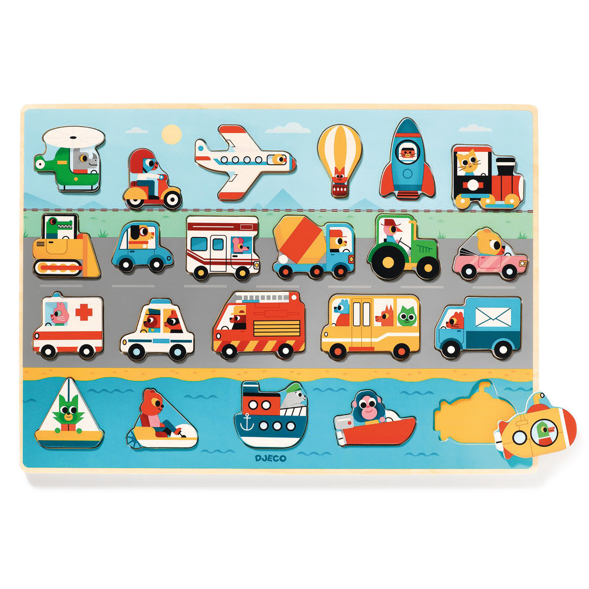 Welches Fahrzeug gehört wohin? Mit diesem farbenfrohen Holzpuzzle entdecken die Kleinen spielerisch die Welt der Fahrzeuge. Die 22 robusten Puzzleteile lassen sich dank ihrer dicken Form besonders gut greifen und fördern ganz nebenbei die Feinmotorik. Farbige Umrisse auf dem stabilen Puzzlebrett helfen dabei, die richtigen Stellen für jedes Teil zu finden und sorgen für schnelle Erfolgserlebnisse