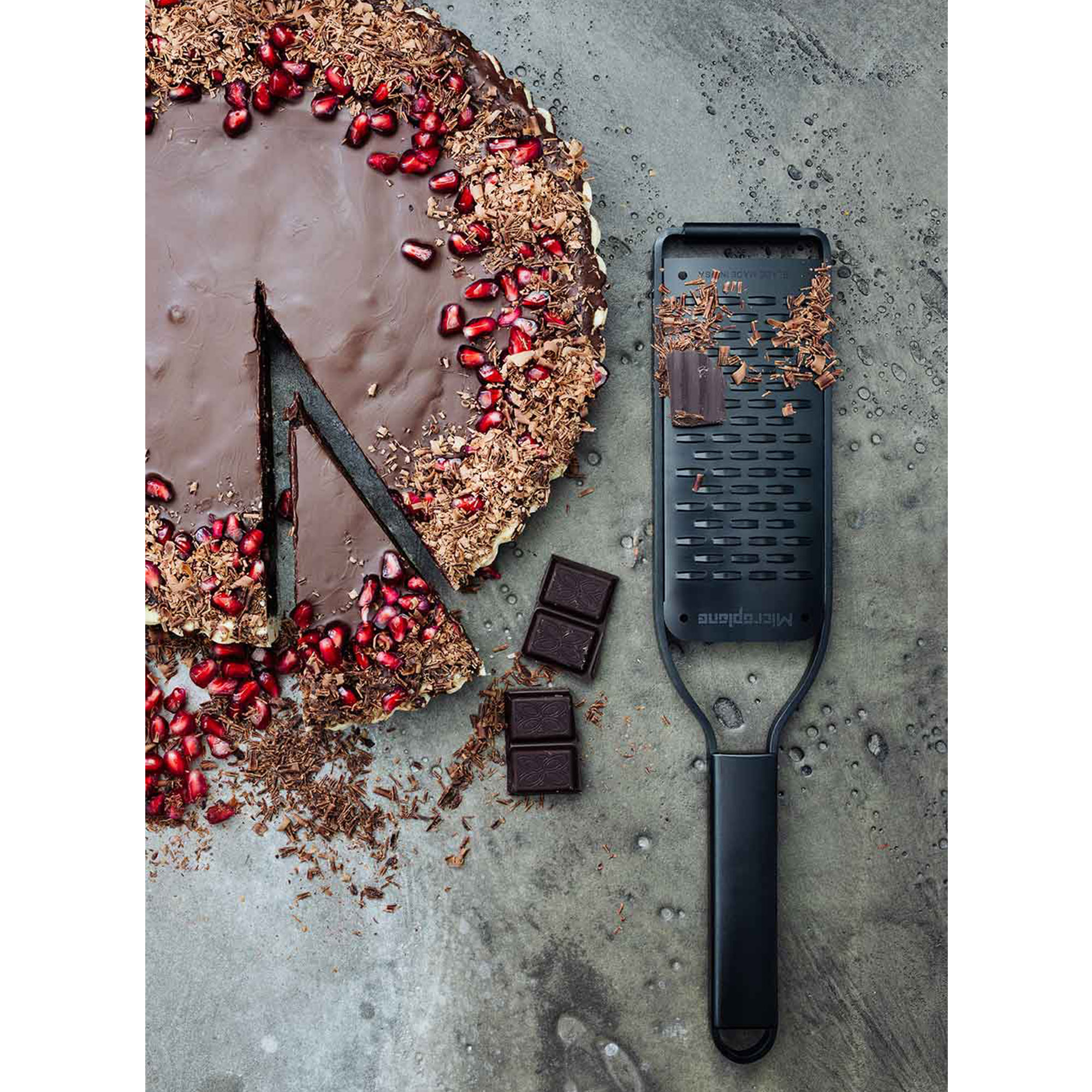 Die Reibe in schwarzer Optik hat ein mattes Finish und ist aus Edelstahl gefertigt, versehen mit einer PVD-Beschichtung für höhere Kratzfestigkeit.