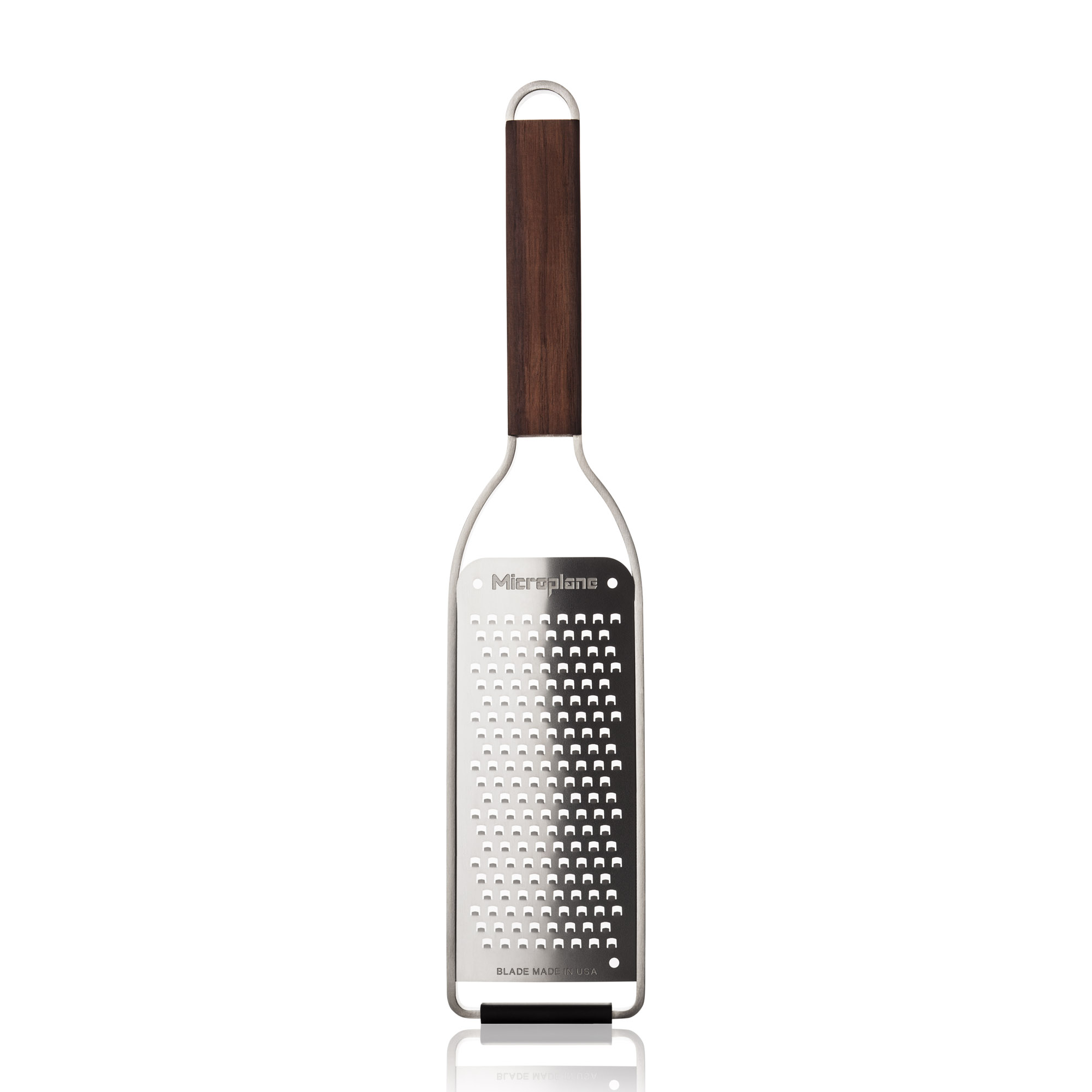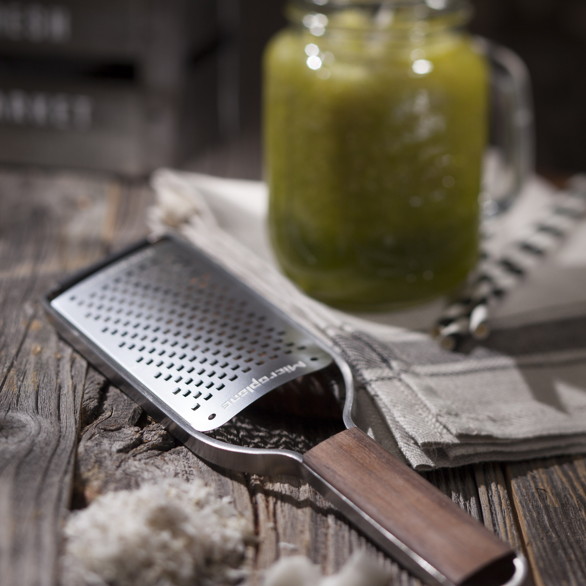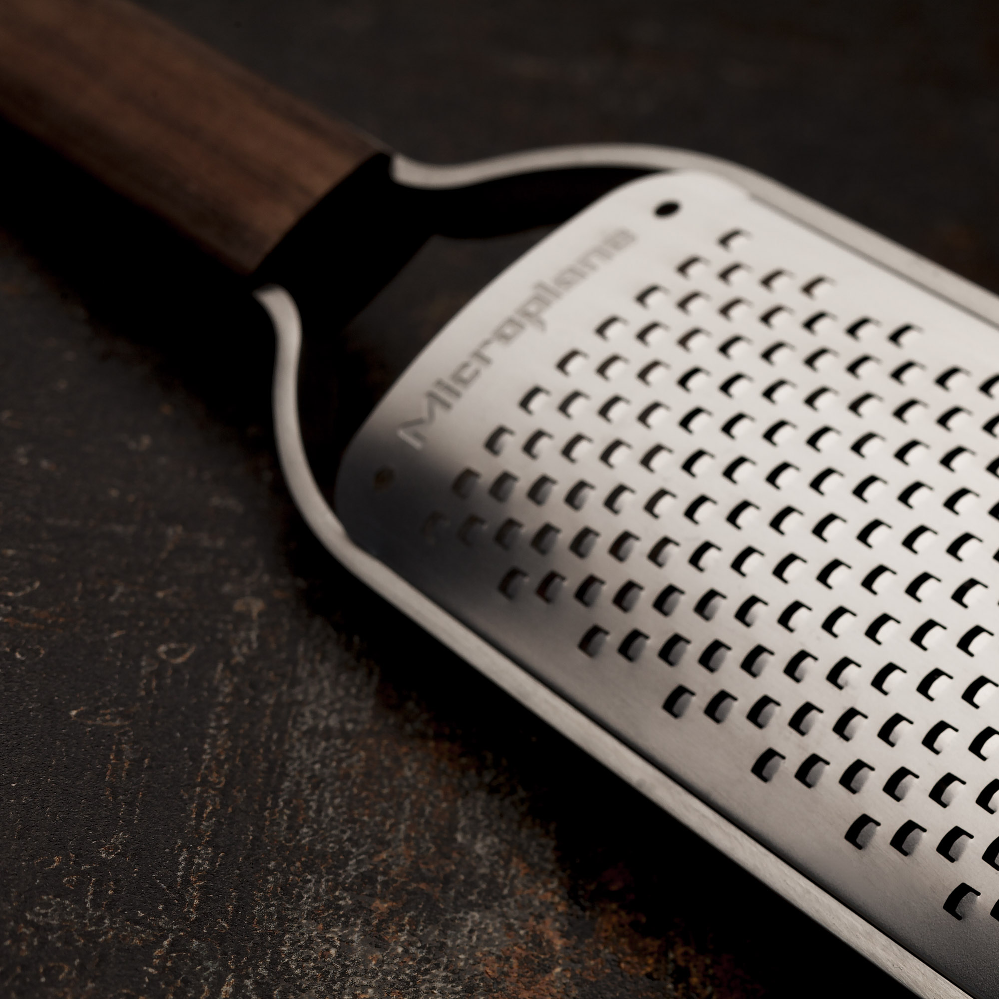 Der edle Griff aus Walnussholz macht die Reibe zu einem eleganten Küchenhelfer.