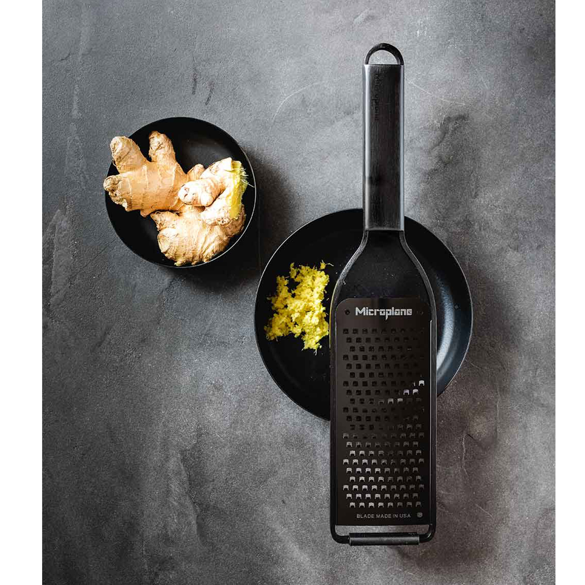 Die Reibe in schwarzer Optik hat ein mattes Finish und ist aus Edelstahl gefertigt, versehen mit einer PVD-Beschichtung für höhere Kratzfestigkeit.
