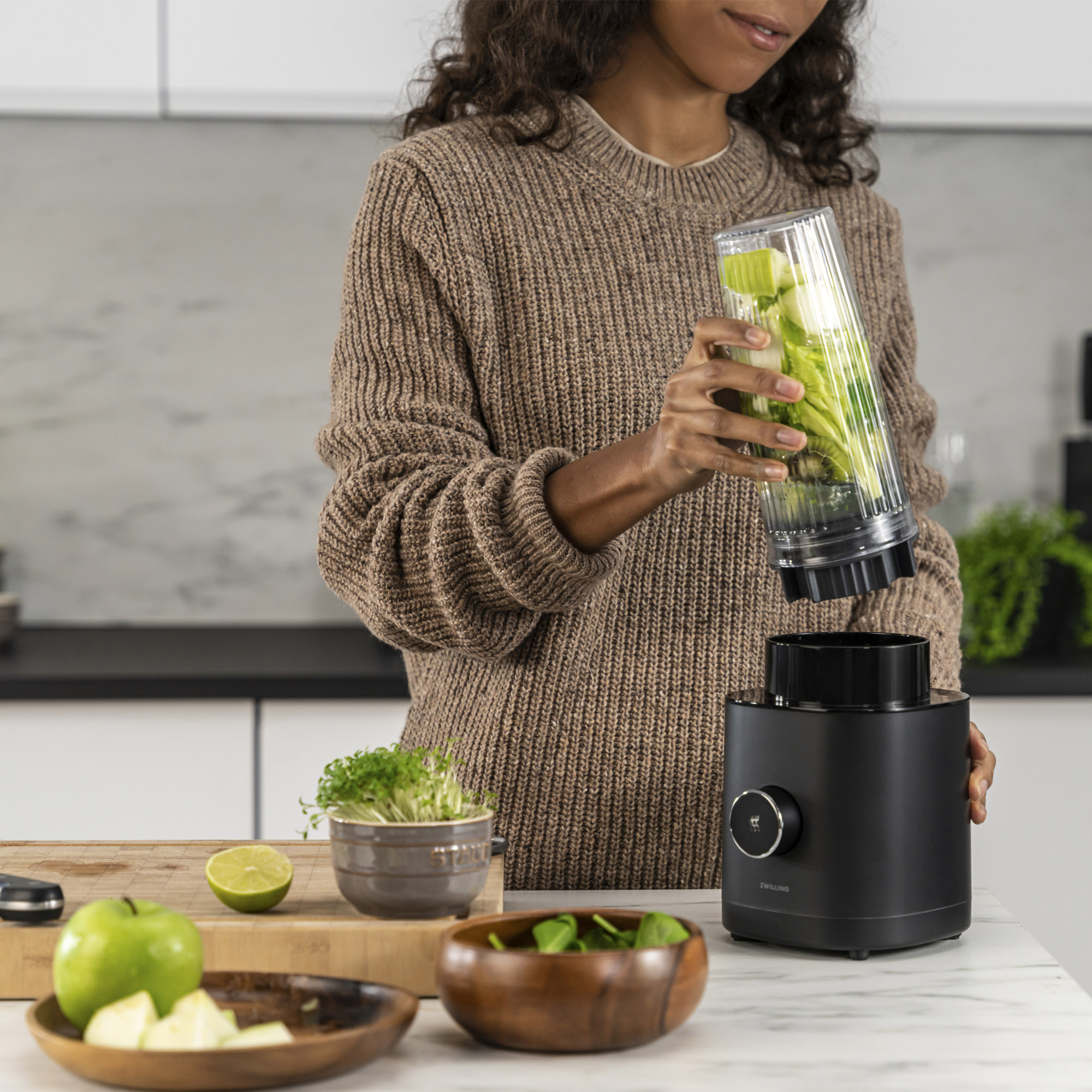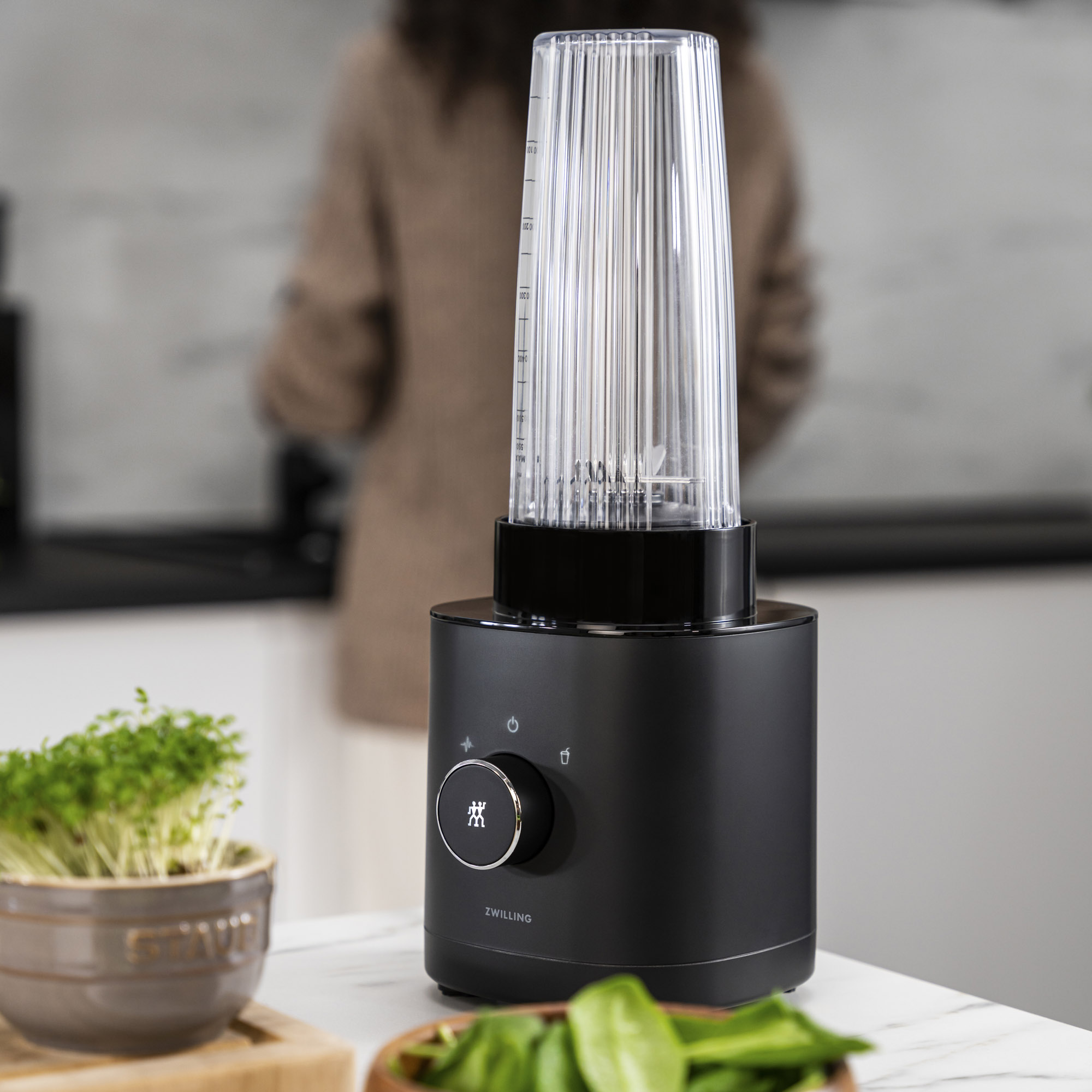 Der kleine Standmixer ist mehr als nur ein Smoothie-Maker. Mit der Original „Zwilling“ Kreuzklinge bietet der hochwertige Küchenmixer immer feinste Mixergebnisse. Sogar Nüsse und Eiswürfel lassen sich mit der Edelstahlklinge mit speziellem Wellenschliff und Piranha-Zahnung mühelos zerkleinern.