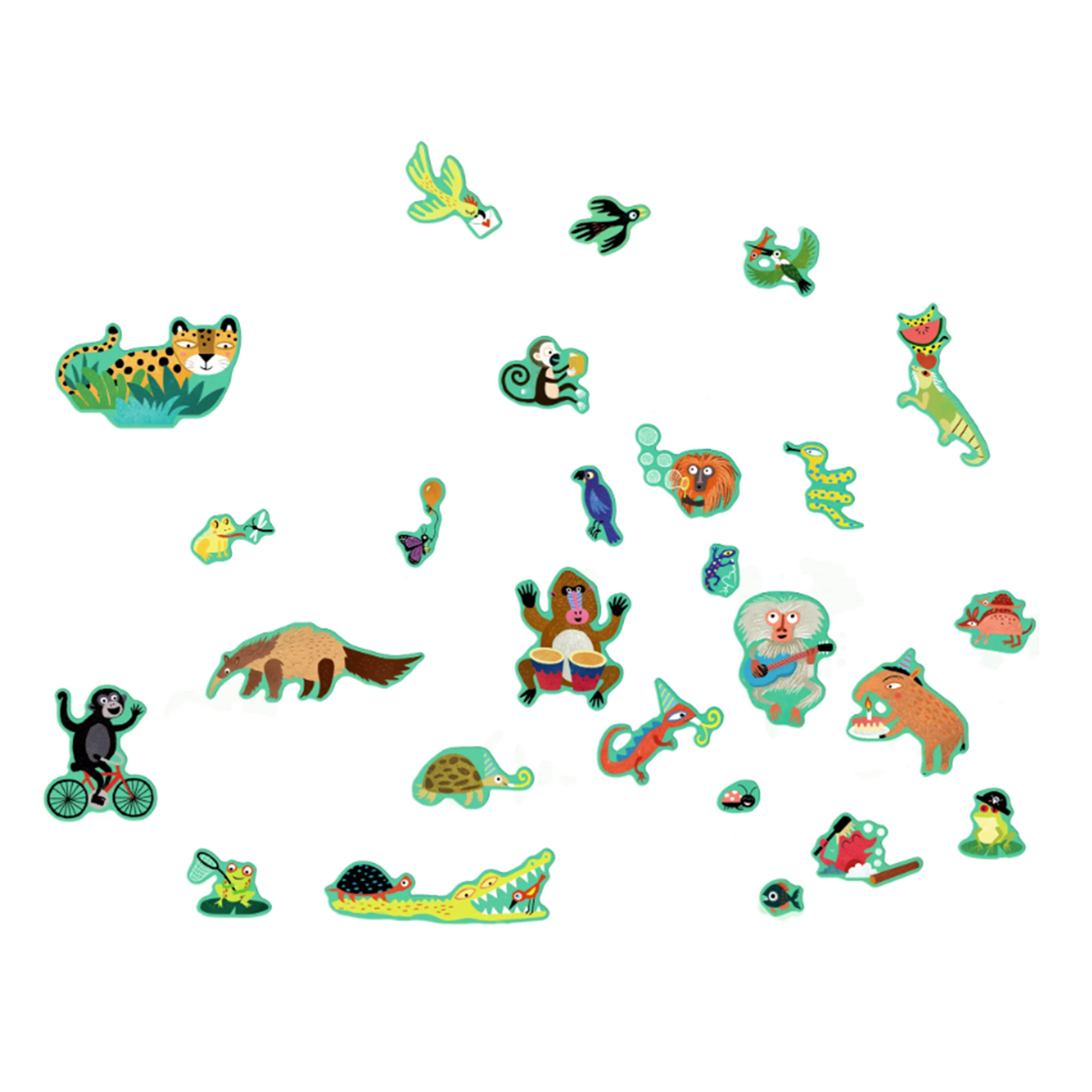 Mit diesem grossformatigen Stickerheft entdecken kleine Tierfreundinnen und Tierfreunde das bunte Leben der Dschungeltiere und können 11 Szenen mit über 300 verrückten Stickern selbst gestalten.
