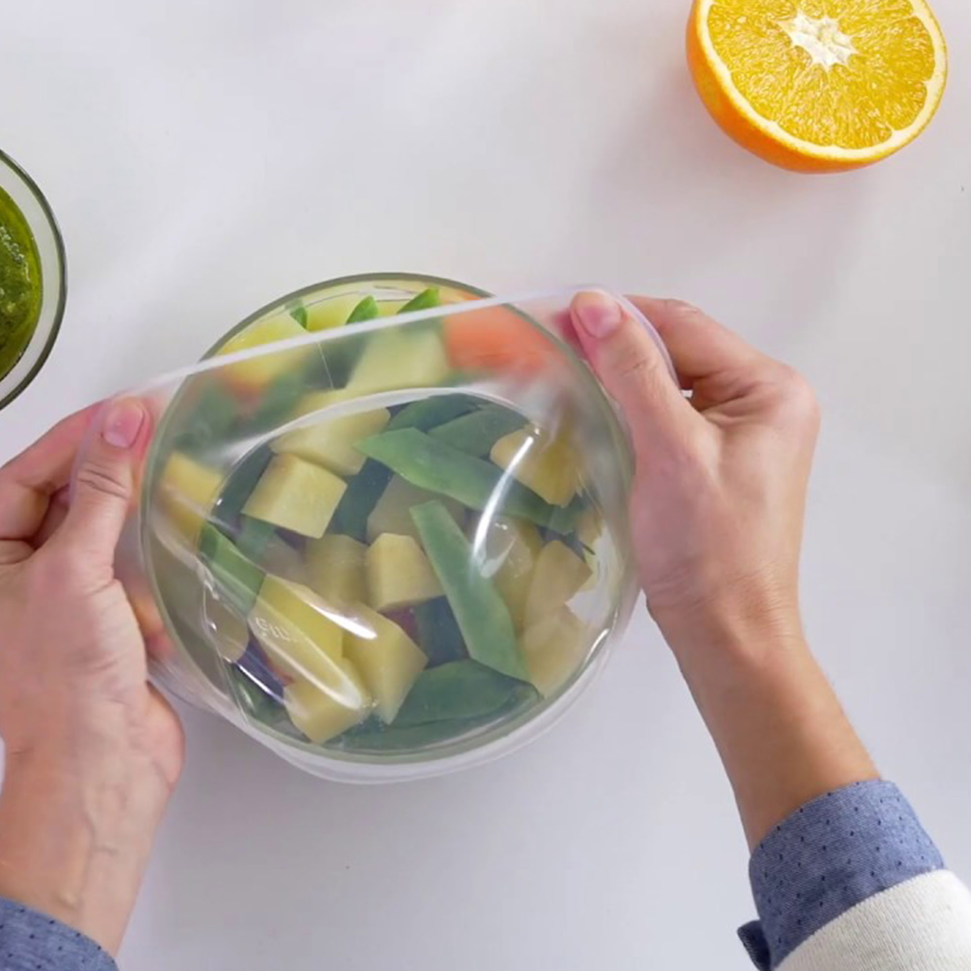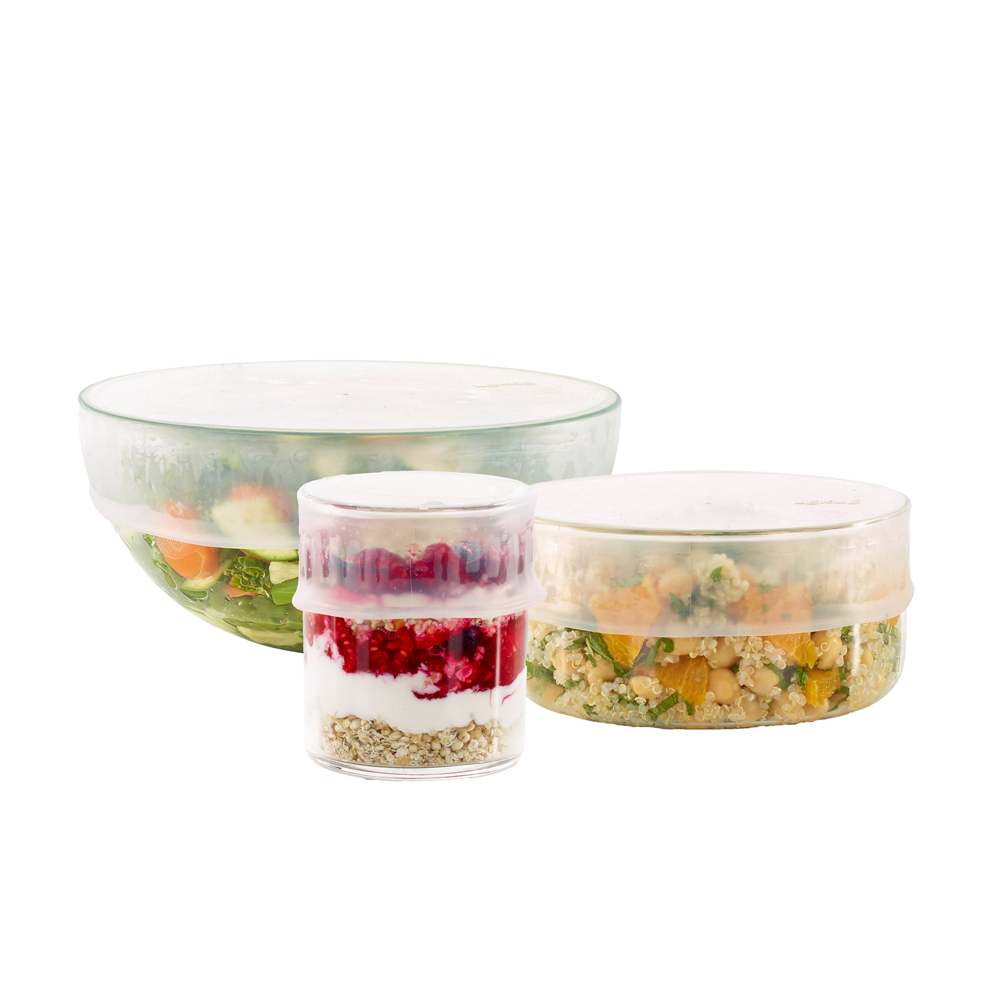 Der Stretch Deckel verschliesst verschiedenste Behälter luftdicht und sicher. Er passt sich flexibel sowohl an Behältnisse, als auch an Obst- und Gemüsehälften an. Lebensmittel werden so hygienisch sauber aufbewahrt und bleiben länger frisch. Das Produkt besteht vollständig aus Platin-Silikon und ist spülmaschinenfest.