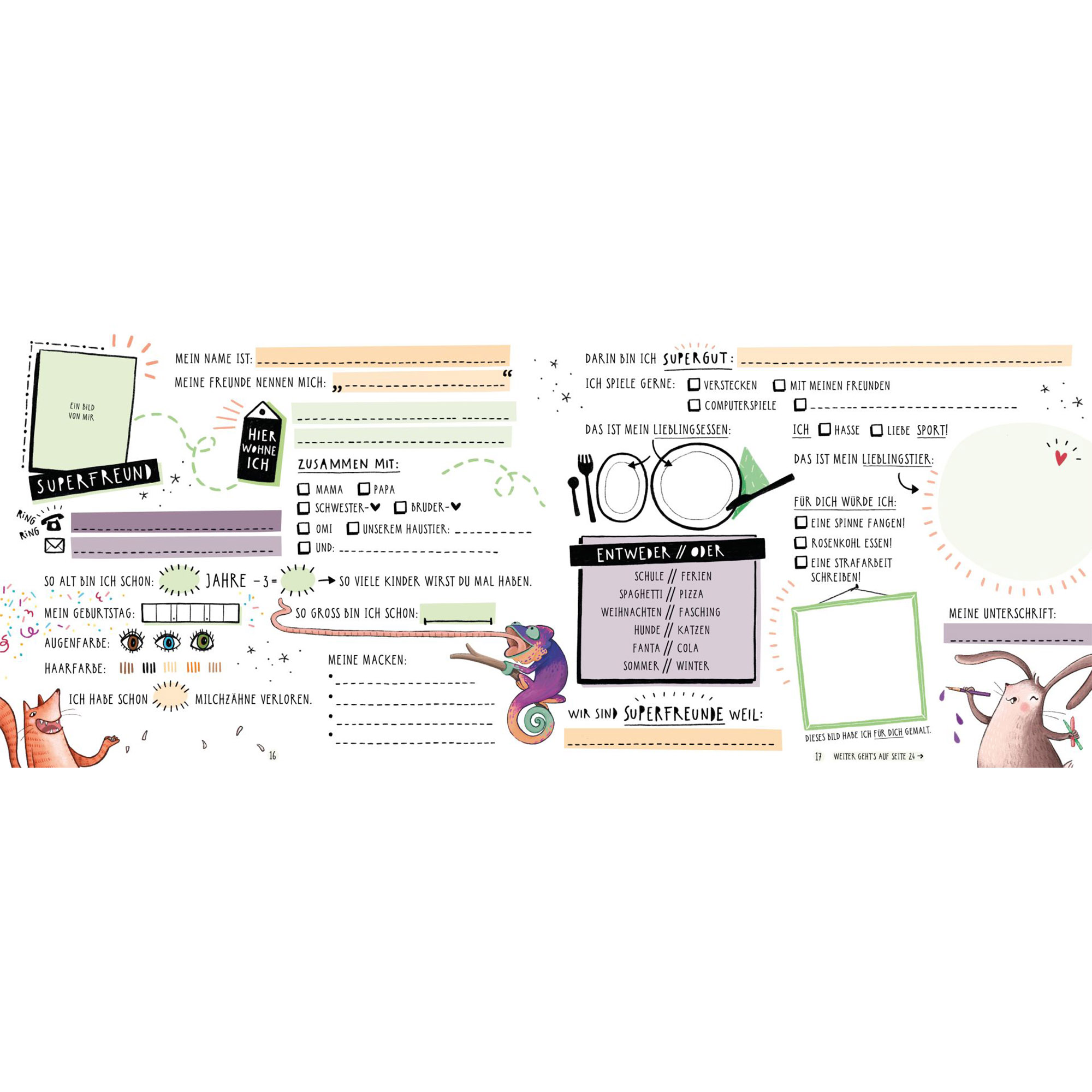 Ein Freundebuch für die Ewigkeit! Mit den vielfältigen Motiven eignet sich das originelle Erinnerungsalbum in der beliebten Kritzeloptik für Mädchen und Jungen gleichermassen. Alle Freunde bekommen ihre eigene Seite und bleiben somit ein Leben lang in Erinnerung. Die Fragen heben sich von anderen Freundebücher ab - kein langweiliges Ausfüllen mehr, auf jeder Seite gibt es viel Platz für persönliche Einträge, Entweder-Oder-Fragen und witzige Details zum Ankreuzen. Coole Illustrationen und knallige Farben - Superfreunde fürs Leben!