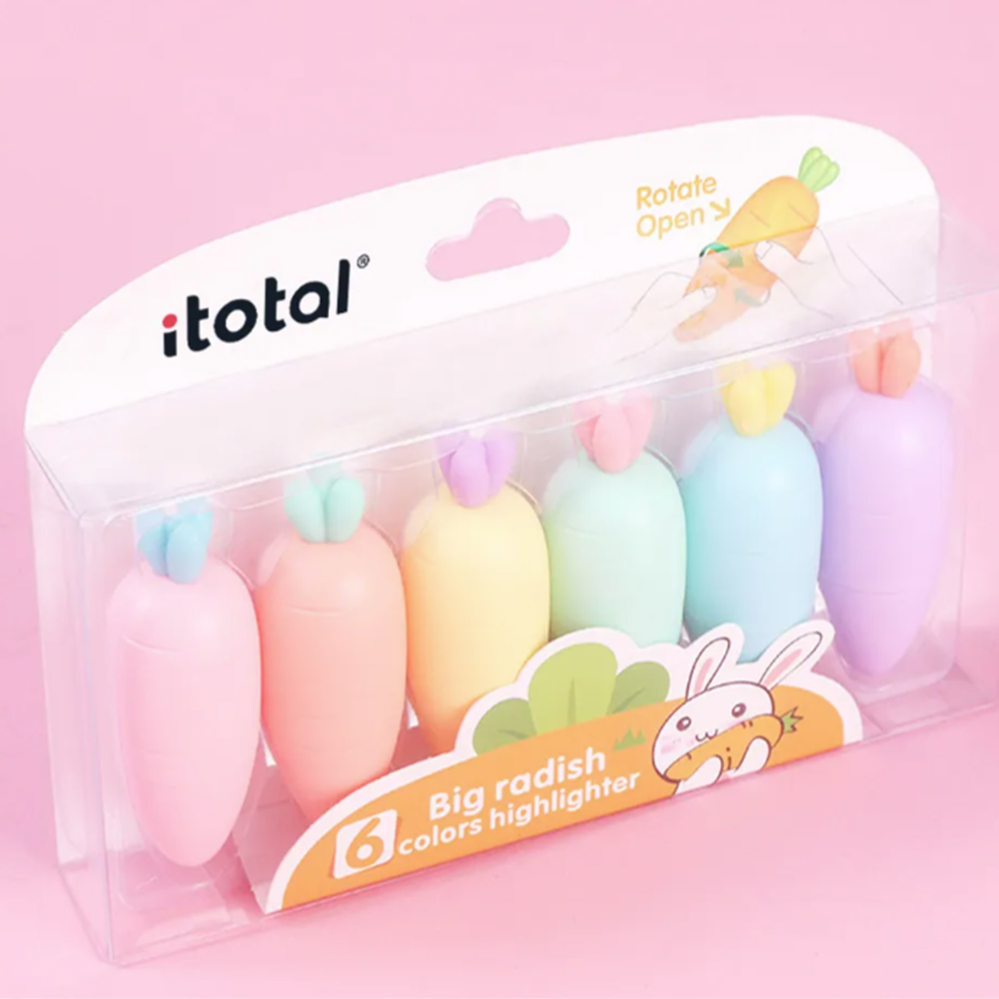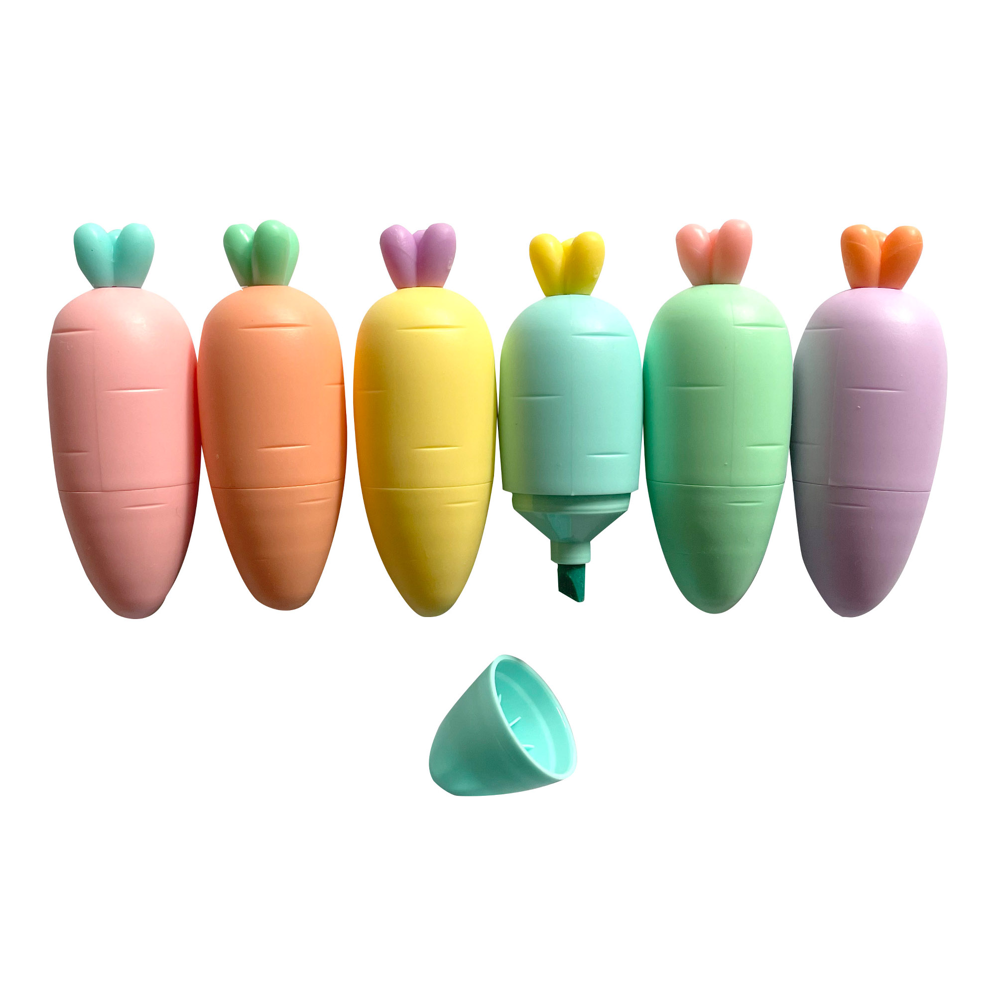 Für Farbe beim Arbeiten oder Lernen sorgen die sechs verschiedenfarbigen Textmarker in Karottenform.