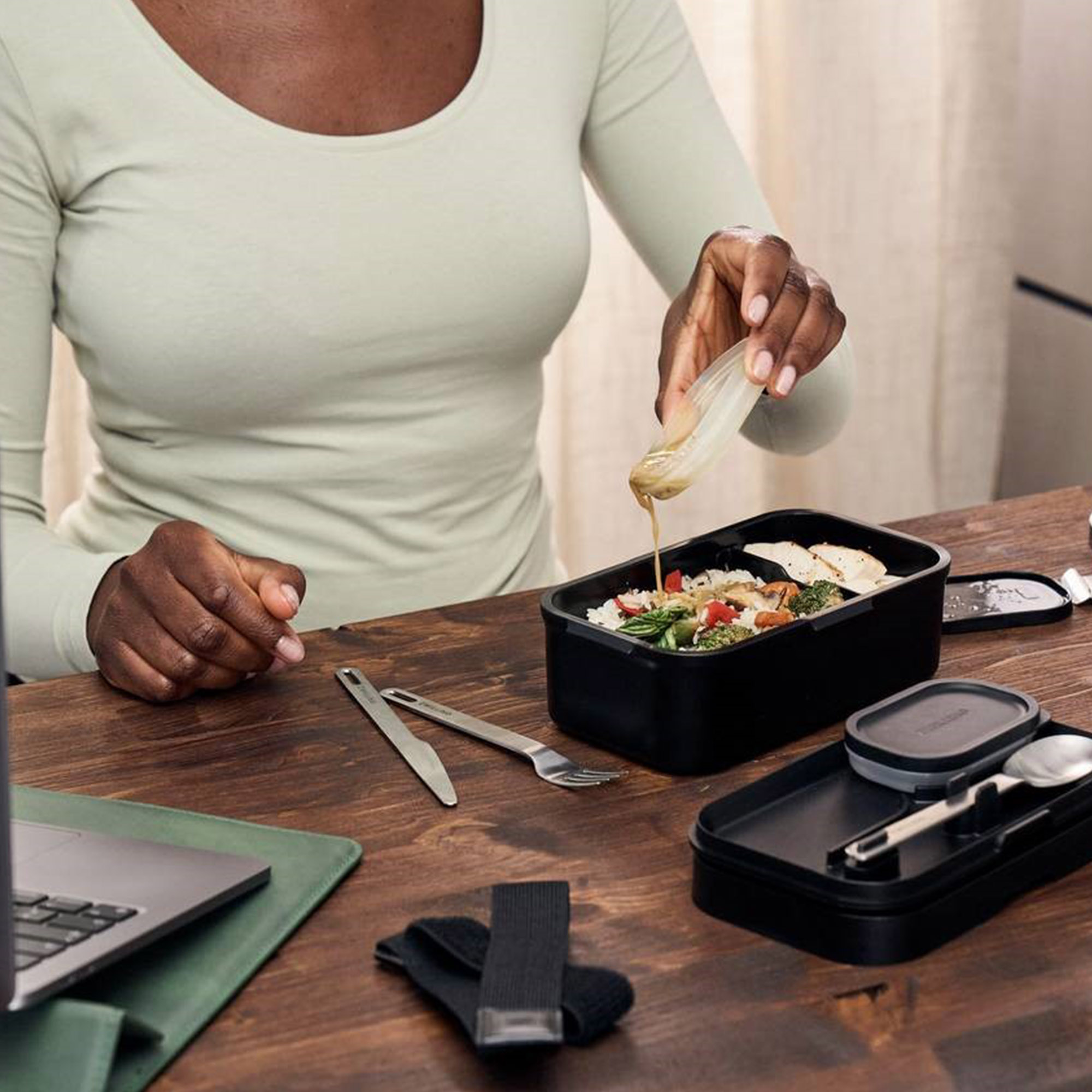 Das modulare System sorgt dafür, dass verschiedene Lebensmittel sauber getrennt bleiben. Dank elastischem Band bleibt alles sicher zusammen. Extra leicht, robust und platzsparend – perfekt für unterwegs.