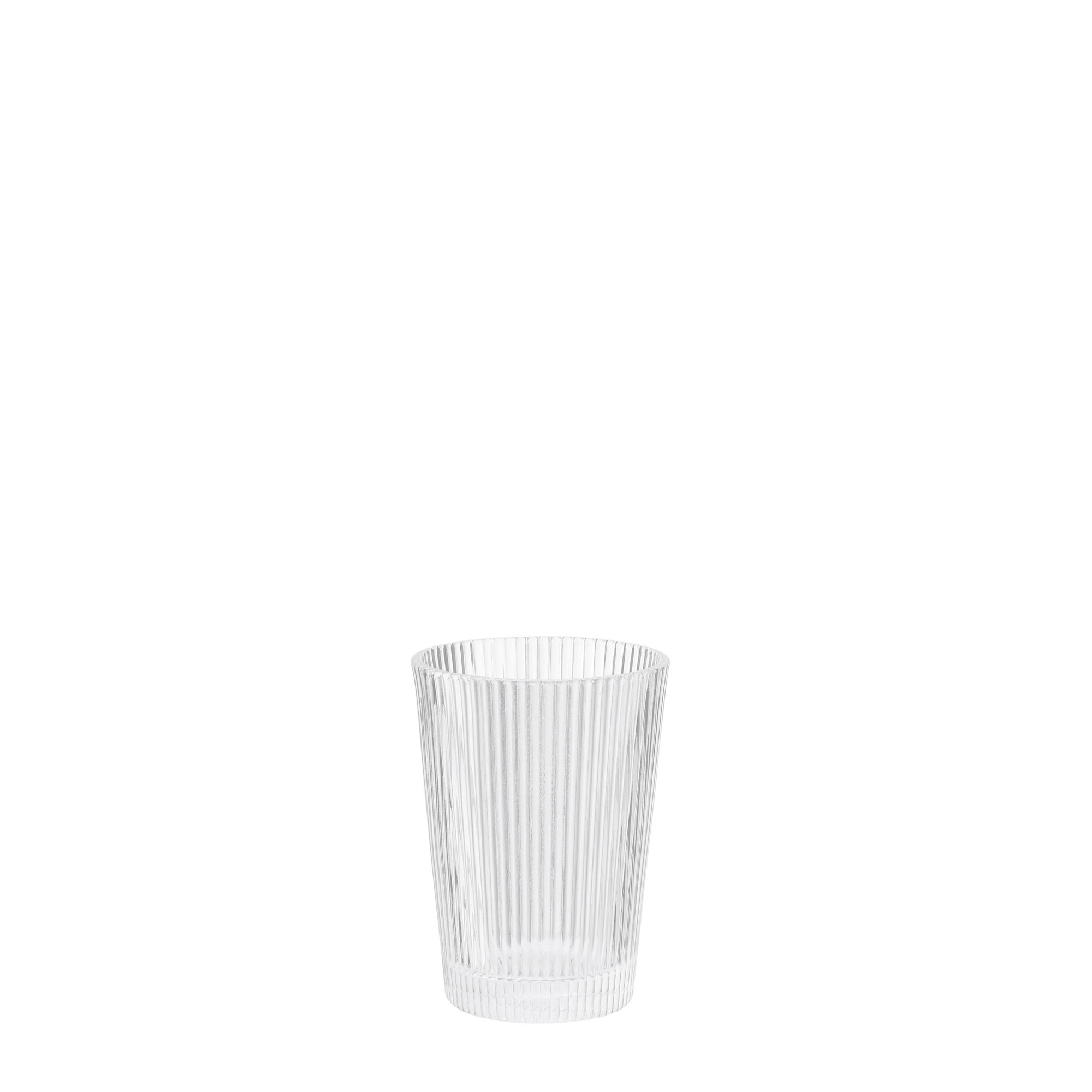Die fein geriffelte Oberfläche verleiht dem Glas ein minimalistisches und zugleich raffiniertes Aussehen.