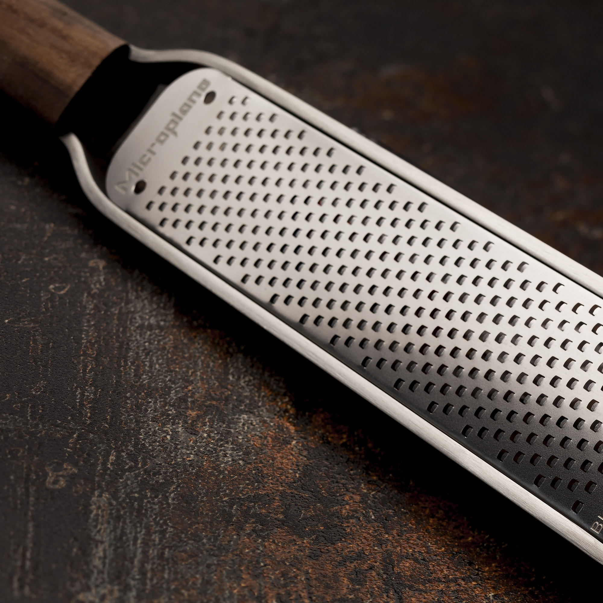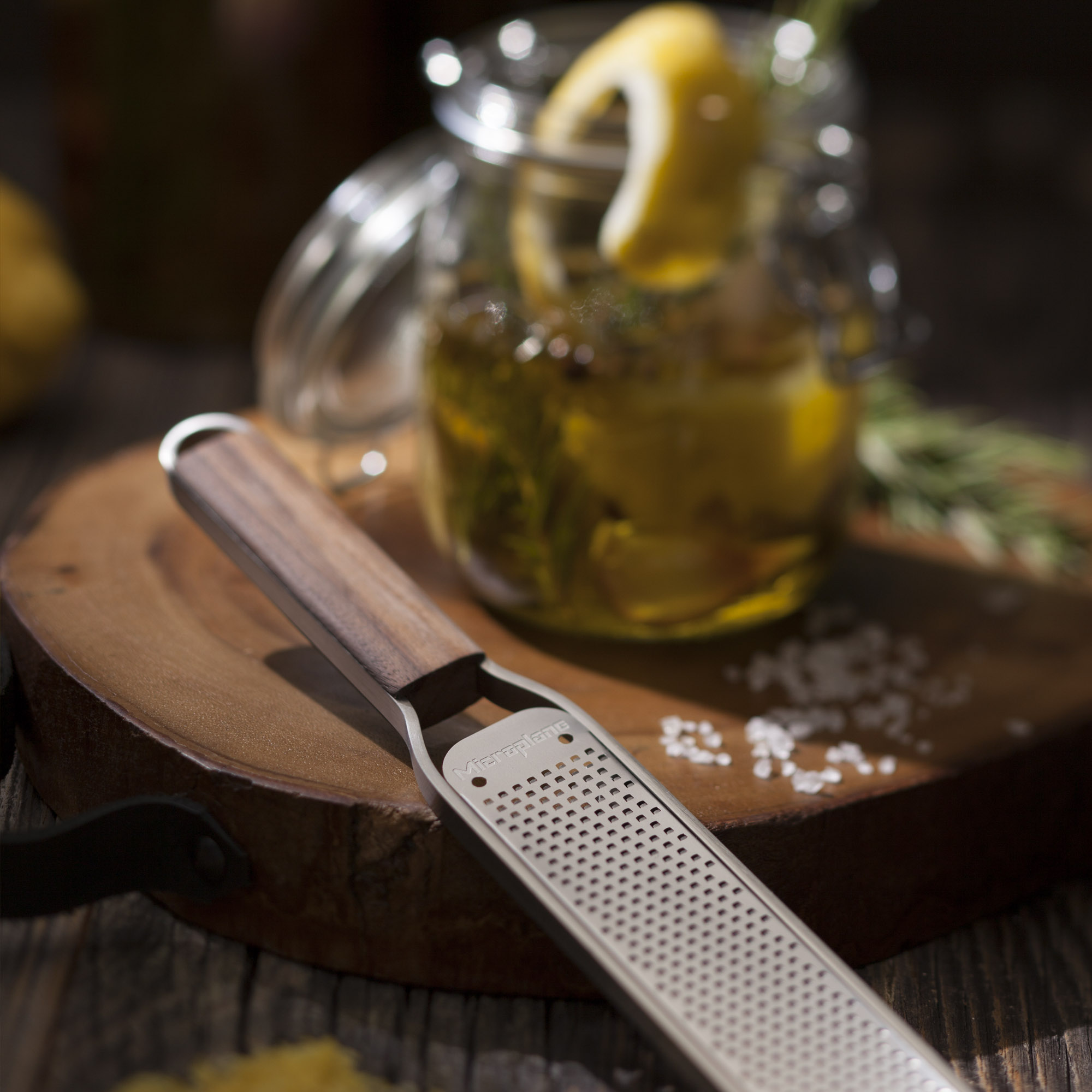 Die Klinge aus Edelstahl ist geformt wie eine Feile und ist besonders scharf und langlebig. Ein optimales Ergebnis wird fast ohne Kraftaufwand erreicht. Da die Klinge rasiermesserscharfe ist, werden die Lebensmittel präzise geschnitten und nicht zerrissen. Durch den präzisen Schnitt, können sich die Aromen besser entfalten und der Geschmack wird intensiver. Der edle Griff aus Walnussholz macht die Reibe zu einem eleganten Küchenhelfer.