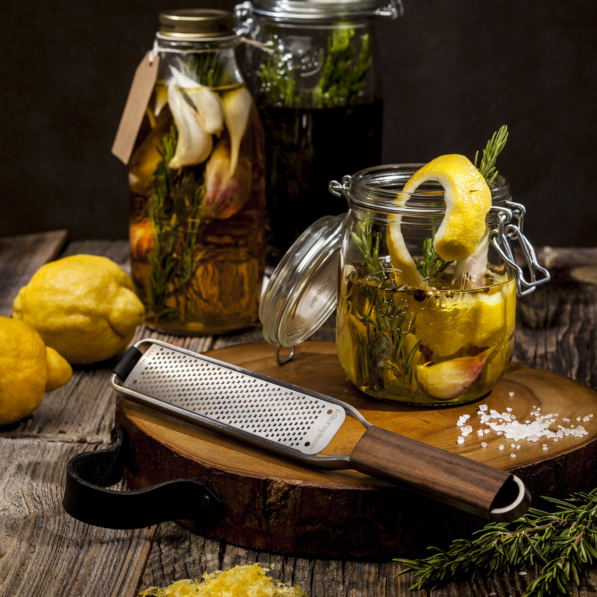 Mit der Master Zesterreibe schneidet man feine Zesten aus Käse, Zitrusfrüchten, Ingwer Muskatnuss etc.