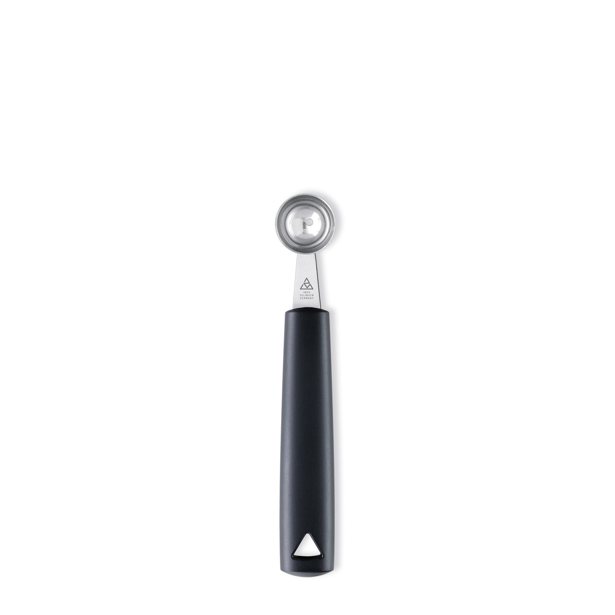 The working part of the 25 mm stainless steel ball former and the black plastic handle are dishwasher safe