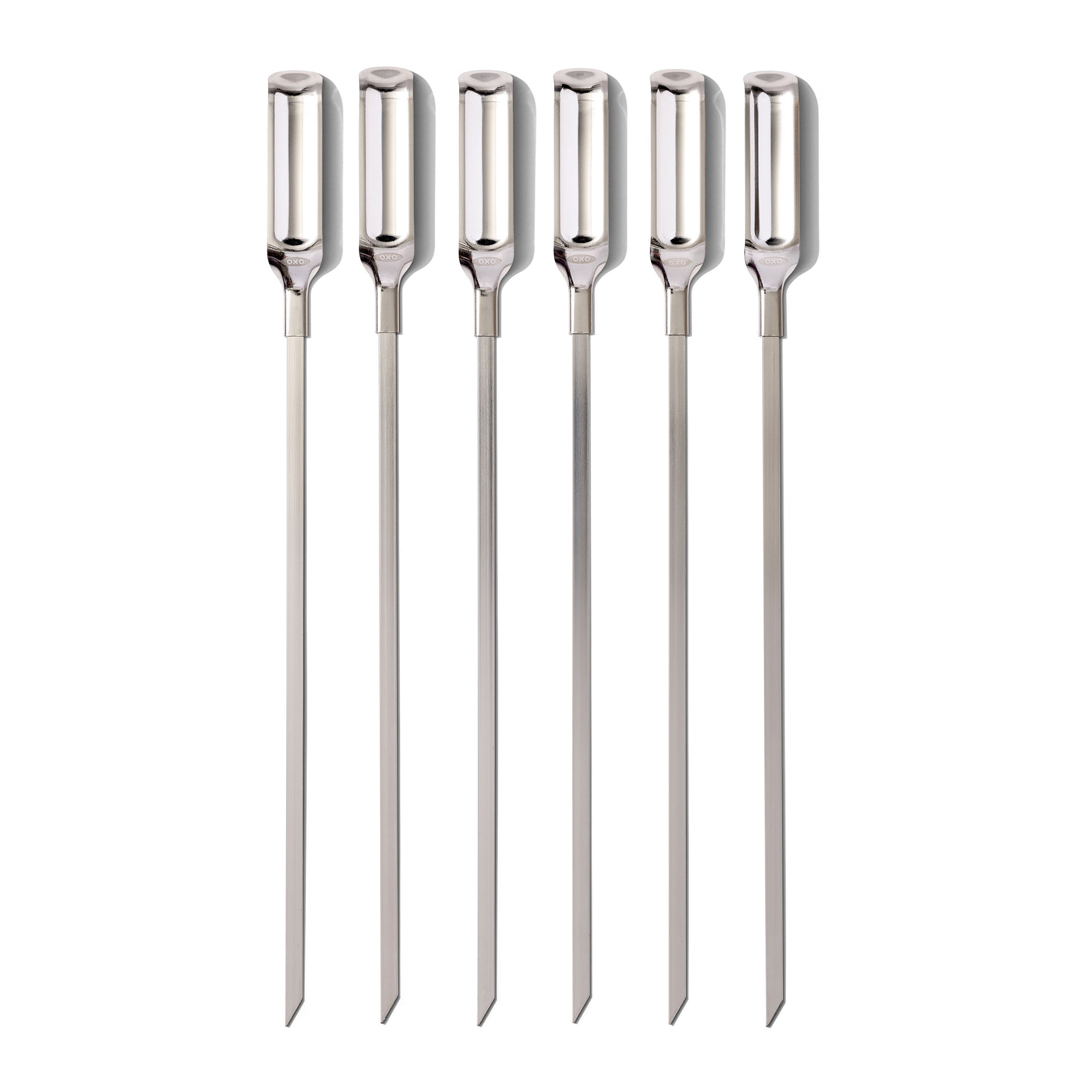Fine meat skewers, vegetable skewers or small kebabs on the grill - it's easy with the Oxo grill skewers. The ingredients glide effortlessly over the sharp tips of the barbecue skewers from the 6-piece set, and the flat design ensures that the meat does not slip during grilling. The skewers have wide handles for easy turning with tongs, and thanks to a thumb-sized indentation, the grilled food slides onto the plate as if by itself. Thanks to their flat shape, the handles can be placed next to each other to save space.
