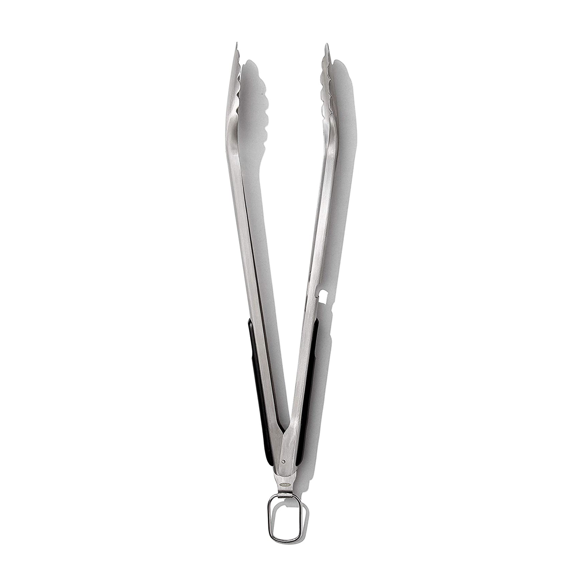 The Good Grips barbecue tongs are made of stainless steel and still look good even after many barbecues. The tongs have angled, serrated gripping surfaces and a soft, non-slip handle, making it easy to lift even heavy, hearty pieces from the barbecue. A practical bottle opener is integrated into the handle of the tongs. After use, pull the small tab to lock the metal tongs in the closed position. The tongs can be hung up for storage using the same tab.