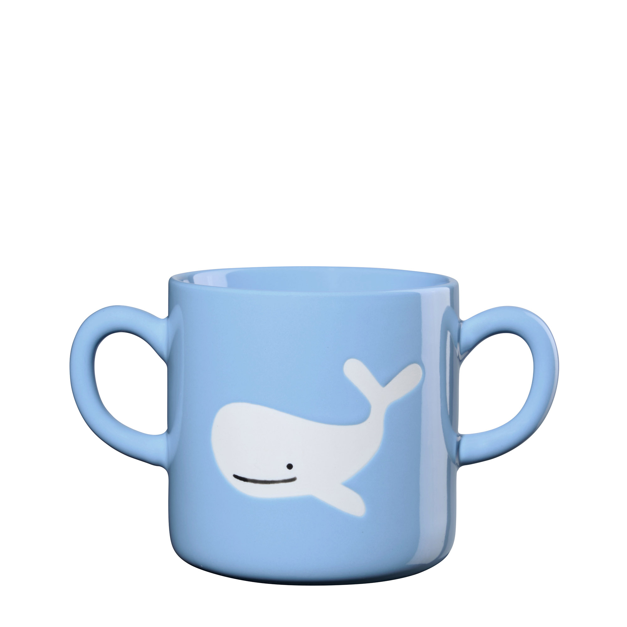 The mug has two handles so that even small hands can hold it comfortably. It is made of porcelain and is microwave, oven and dishwasher safe.