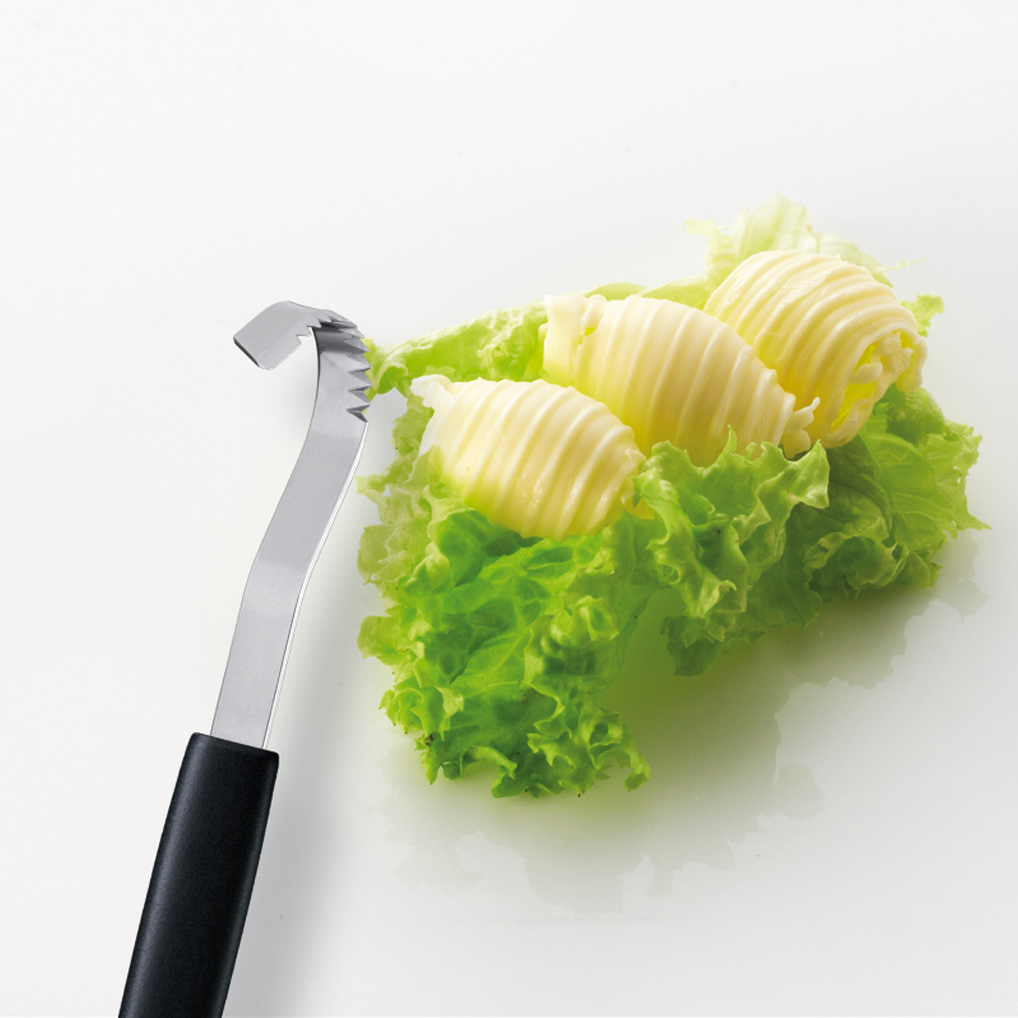 The butter roller forms curls or nocks for decorative single portions for buffets or plates. The butter roller made of plain butter is an attractive eye-catcher.
