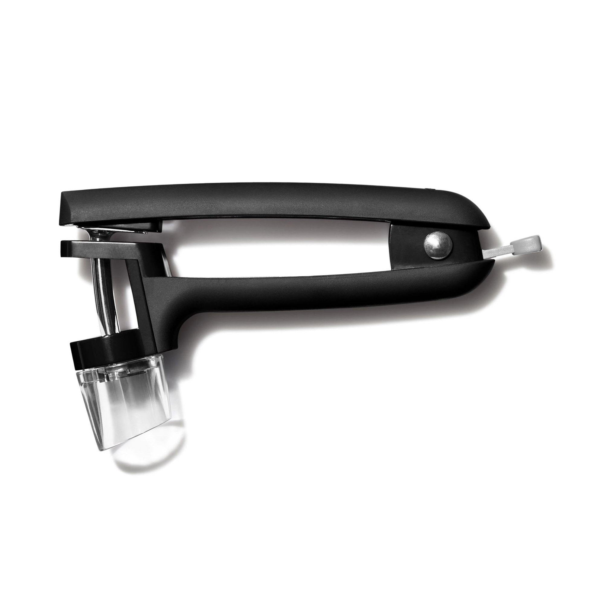 Thanks to the robust die-cast zinc construction, the pits of the cherries can be removed effortlessly. The corer has non-slip comfort grips and a removable splash guard that drains any escaping juice downwards to keep the work surface clean.