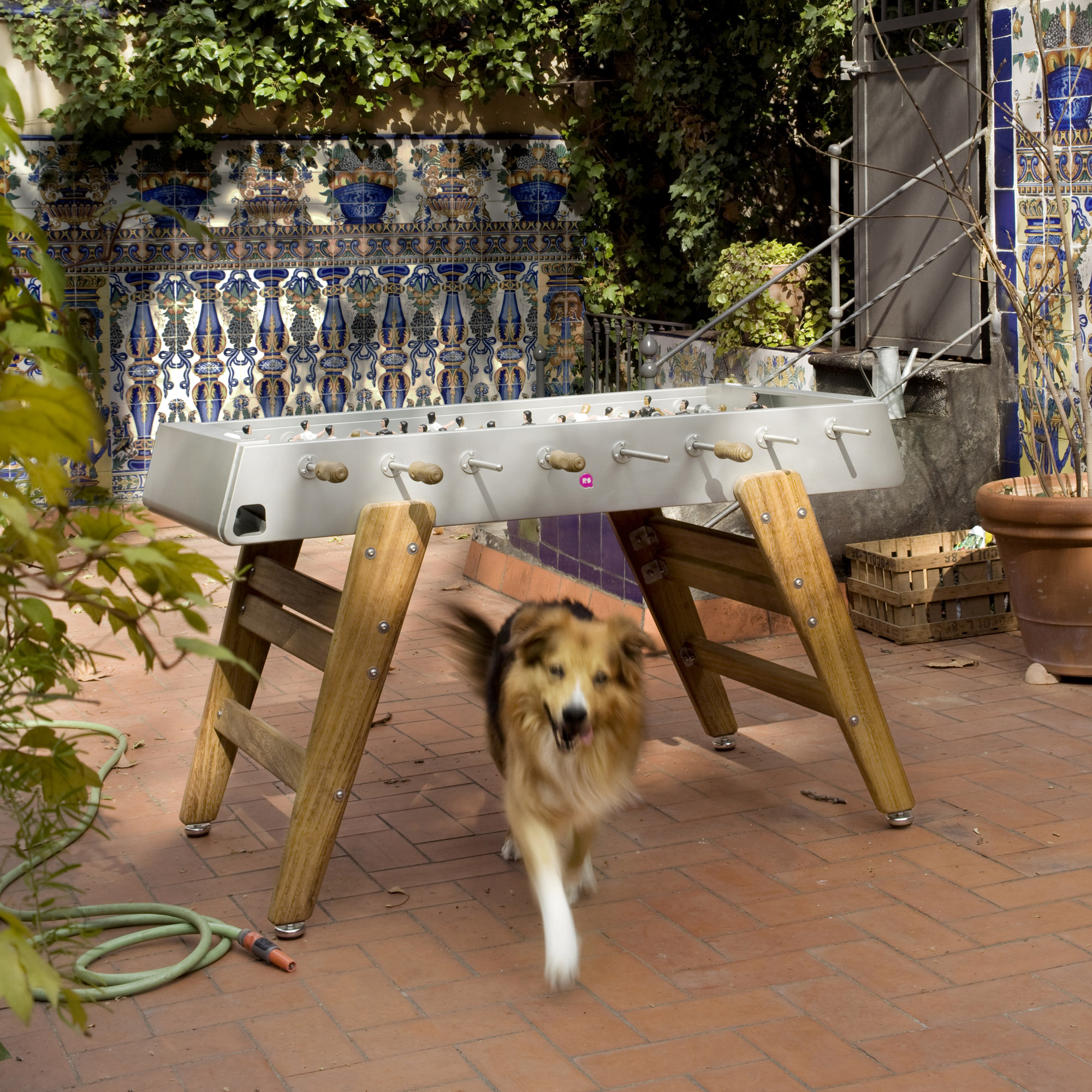 This soccer table is weatherproof and can be used indoors as well as outdoors. The figures made of solid cast aluminum are individually replaceable at any time - as all other individual parts, by the way.