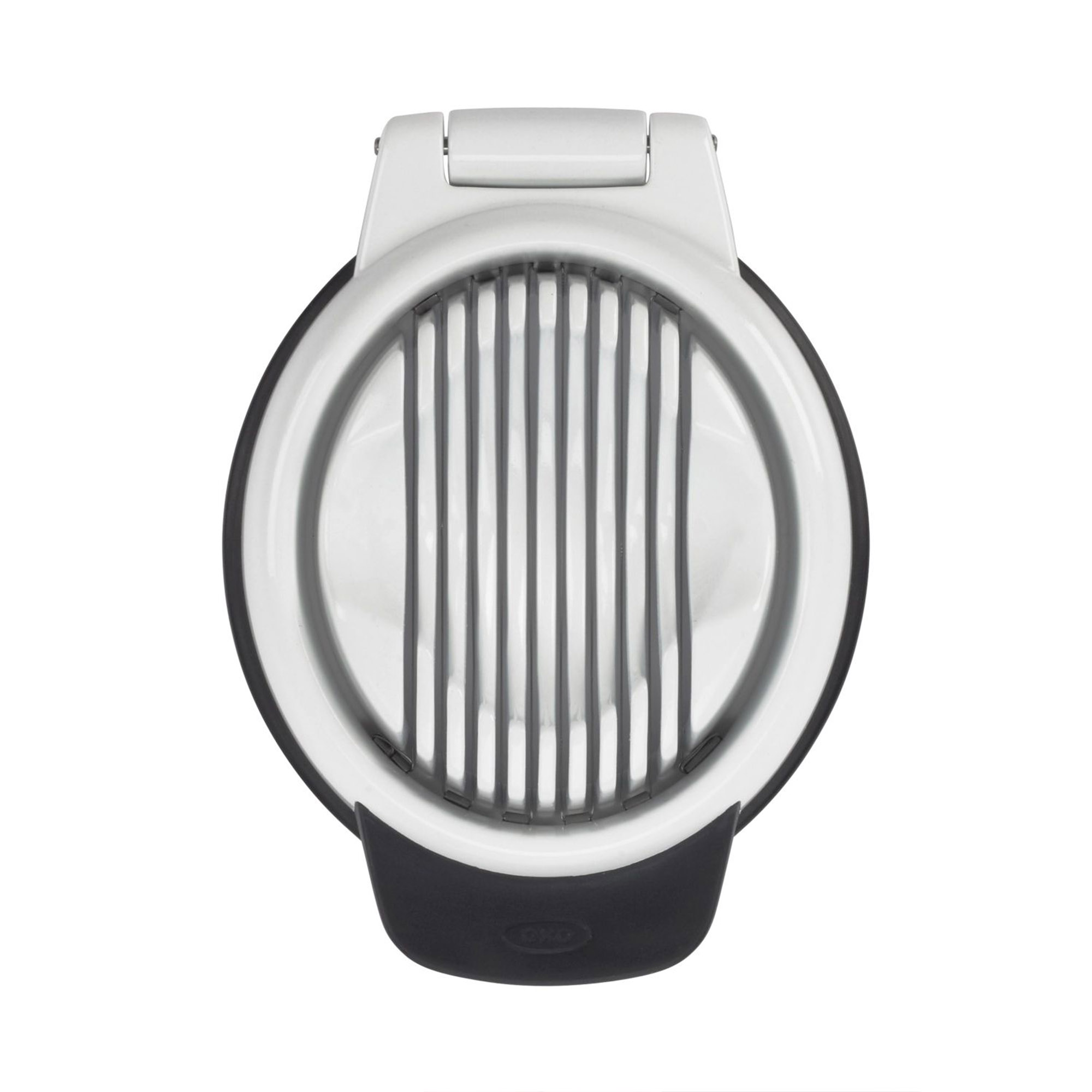 The OXO egg slicer cuts perfect 5 mm slices with a simple press. The egg can be placed on the tray in two directions to obtain round or oval slices. Turn the sliced egg and press a second time to chop it for salad. The non-slip base ensures stable use.