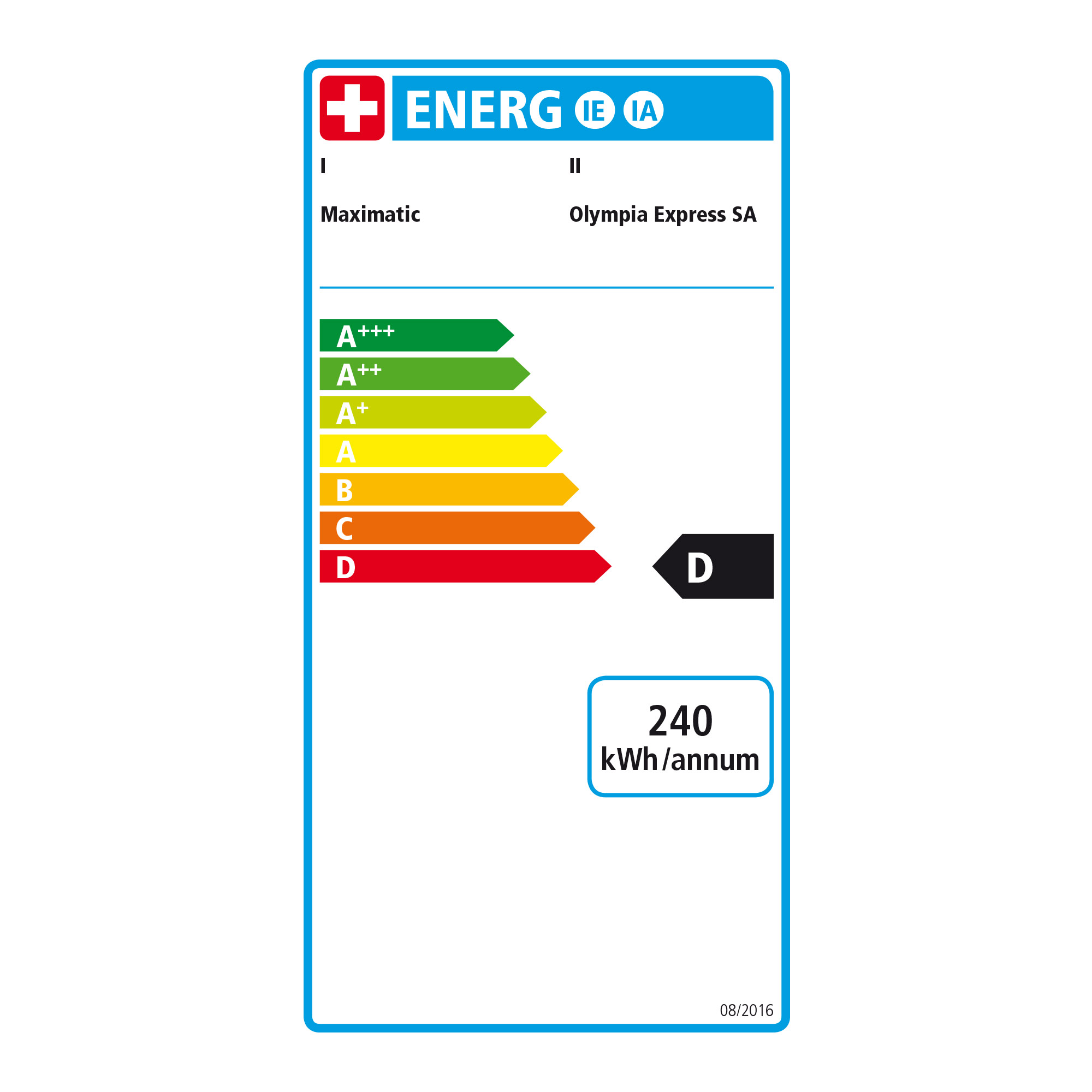 The front panel is made of highly polished stainless steel, frame and cladding are painted in high-quality and particularly resistant powder technology. The cover of the Maximatic can be used to preheat the cups. The drip tray and drip tray are removable and therefore easy to keep clean. The thermal overload protection of the heating element and the mechanical safety valve of the boiler ensure the appropriate safety. All high-tech seals are made of Teflon and Gore-Tex. An illuminated Olympia Express logo adorns the extraction button