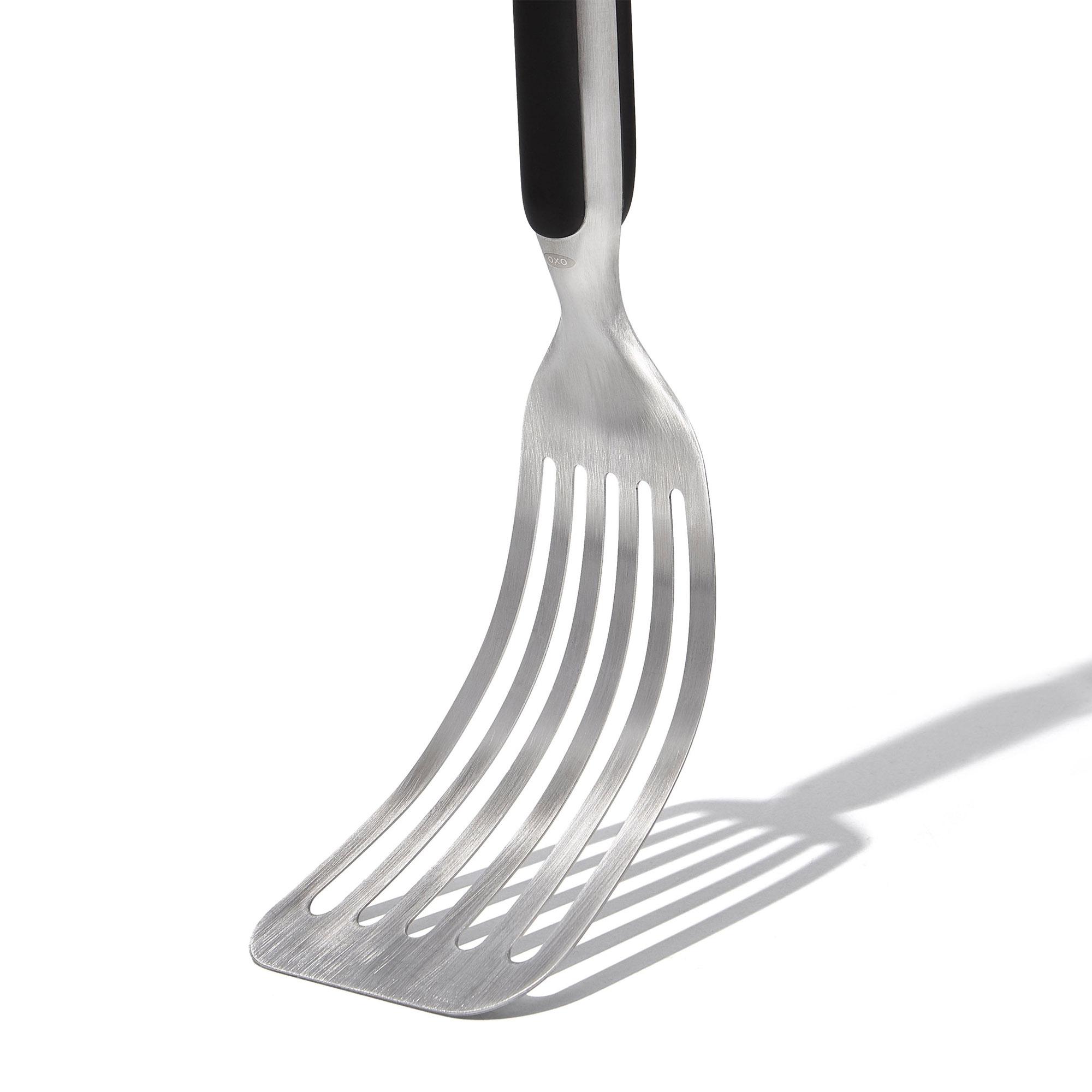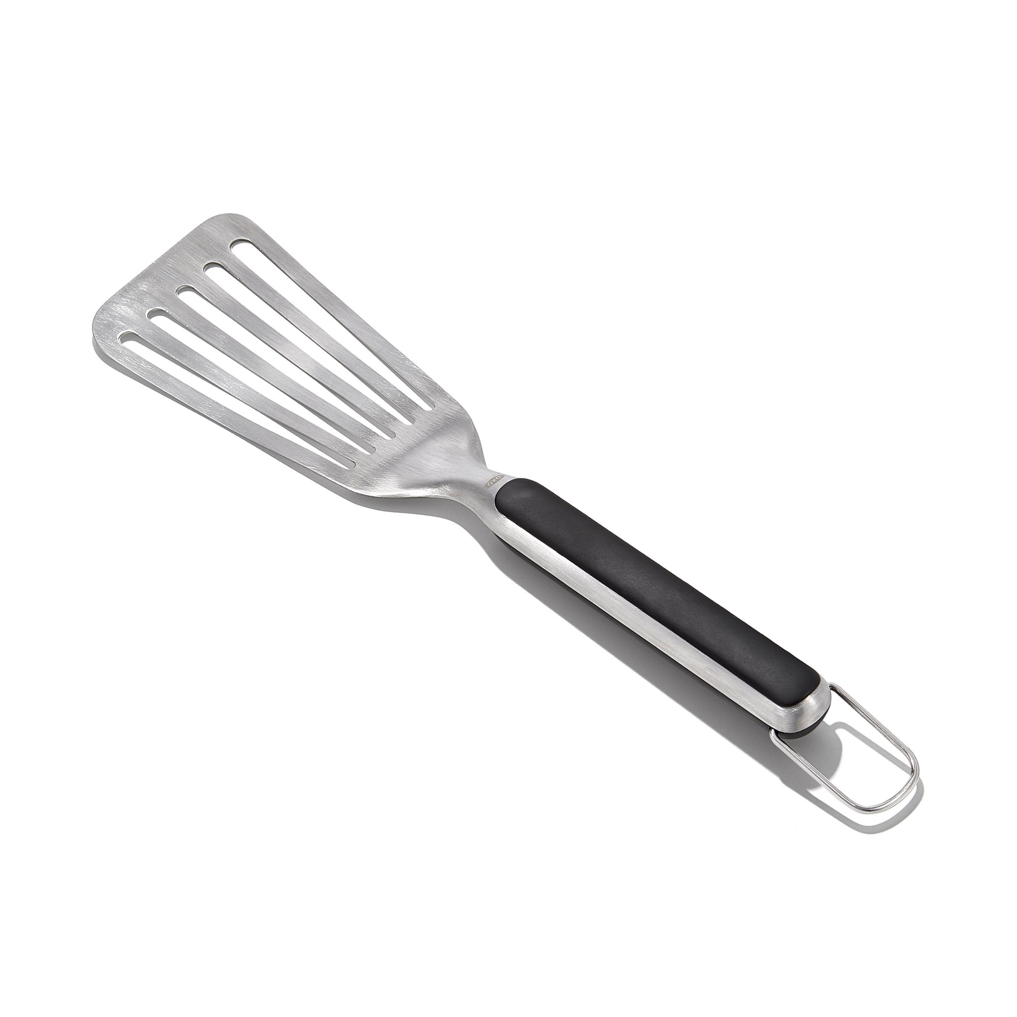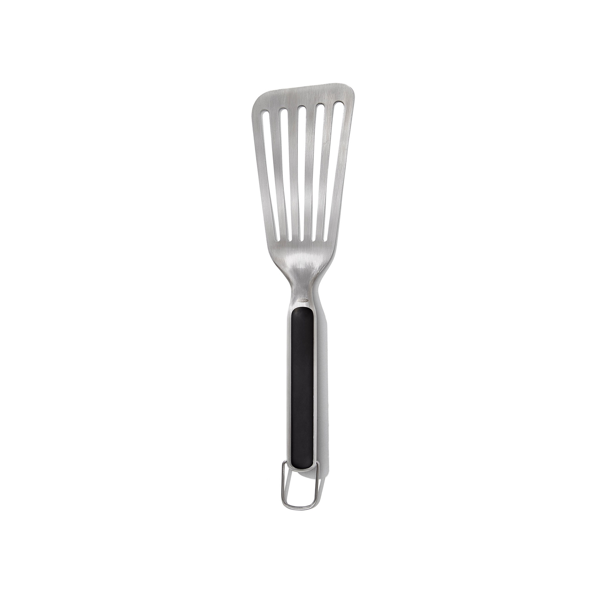 The Oxo barbecue turner allows you to turn and flip barbecue food such as salmon fillets, juicy burgers or even pork tenderloin. The slim, beveled head allows for effortless flipping, while the sturdy stainless steel construction makes it easy to transport. The handle is comfortable and non-slip, and features a convenient hanging tab to hang the turner on the grill after use. So nothing stands in the way of your grilling pleasure.
