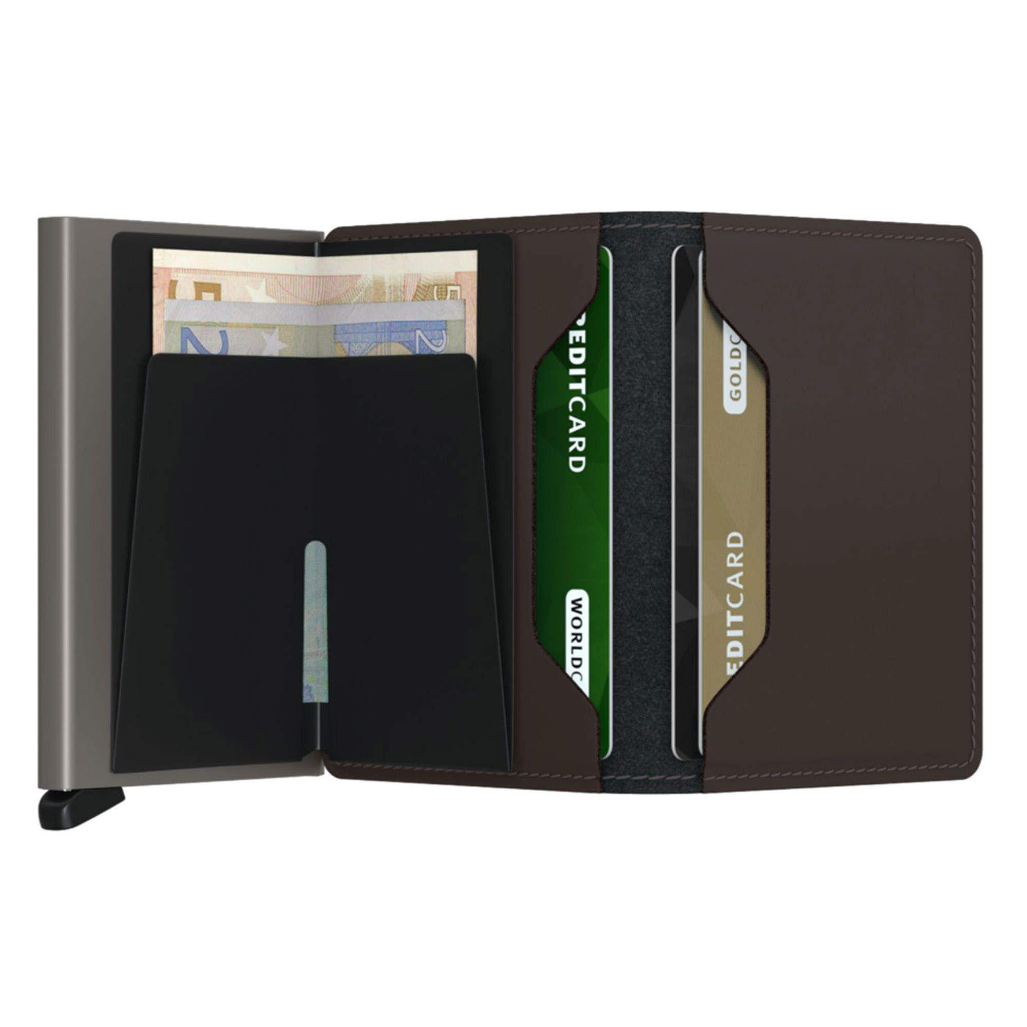 The Slimwallet is small and fits easily into any pocket. Thanks to its ingenious design, however, you will be surprised at what it can hold. The Cardprotector offers space for a maximum of six cards, one of which can have a relief (thickened letters) or a maximum of five cards, three of which have such a relief. The leather interior offers enough space for at least four more cards, business cards, banknotes or coins.