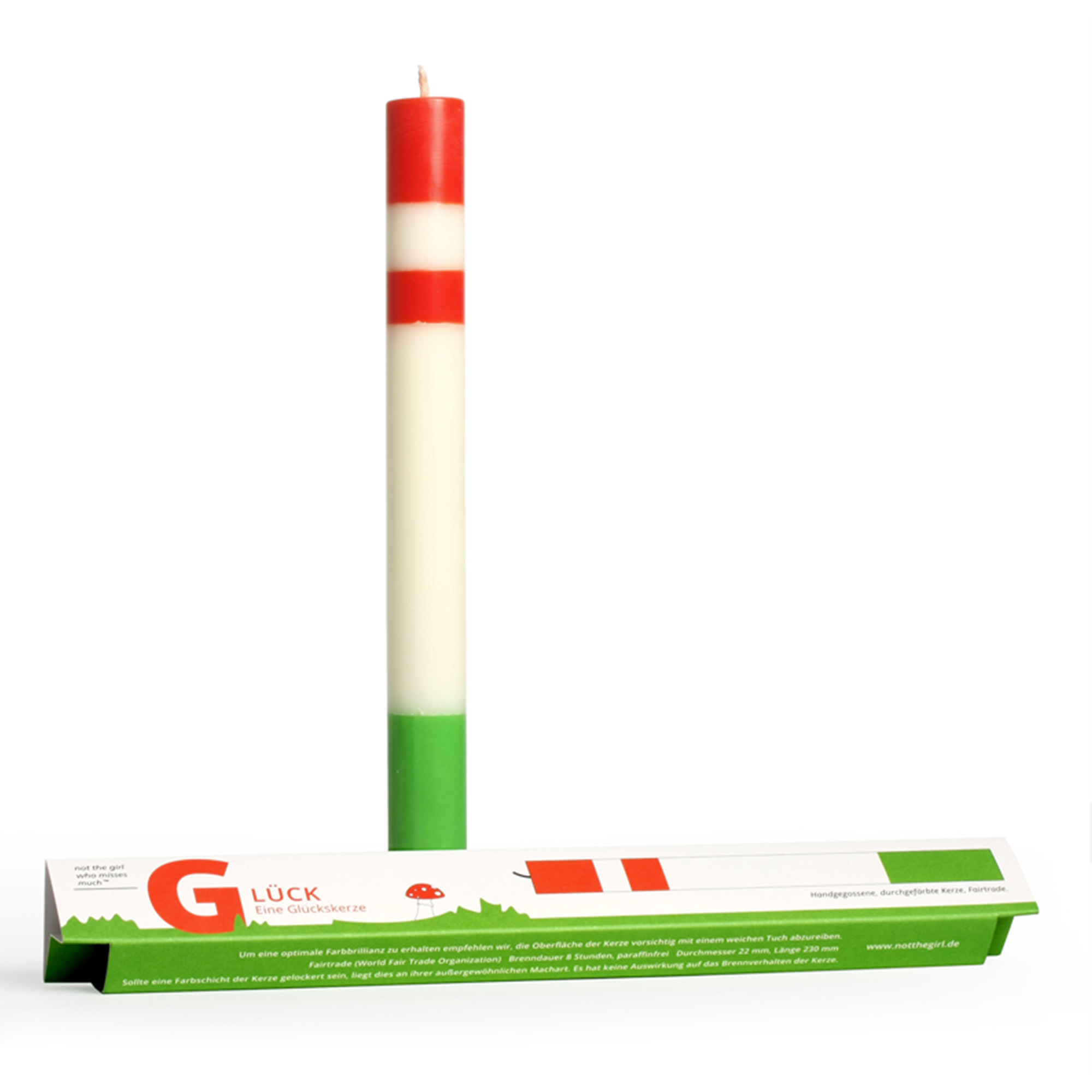 The lucky candle is ideal as a gift for someone who needs a bit of luck, whether for an upcoming exam or as a birthday greeting. With its color scheme, the stick candle is visually reminiscent of a toadstool and sends a loving greeting to the recipient.