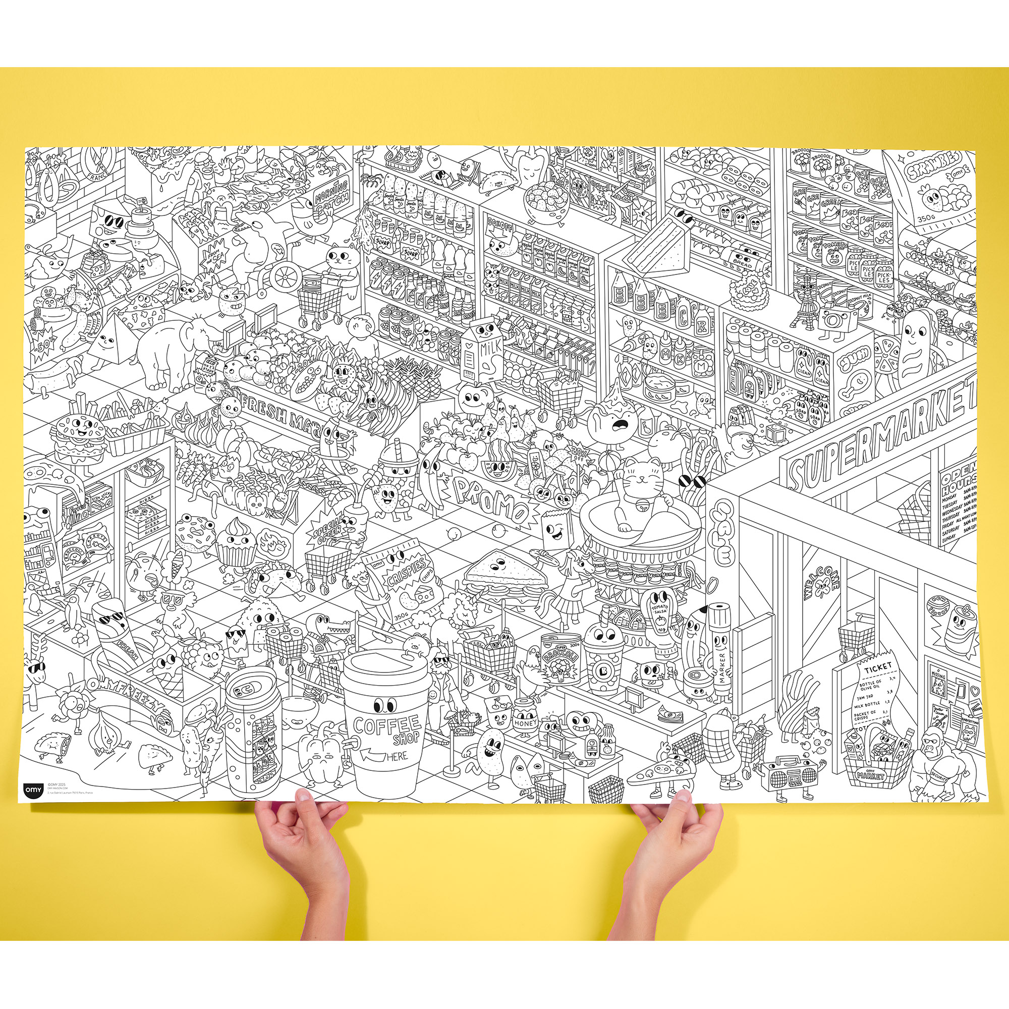 This large coloring poster shows a lively scene in the supermarket: different foods come to life, have their very own characters, jump around and talk wildly - a real hidden object picture full of imagination and movement. Hidden among the cheerful figures are many lovingly designed details that are just waiting to be discovered and colored in. Spread out on the floor or on the table, the poster invites children to color together or on their own.