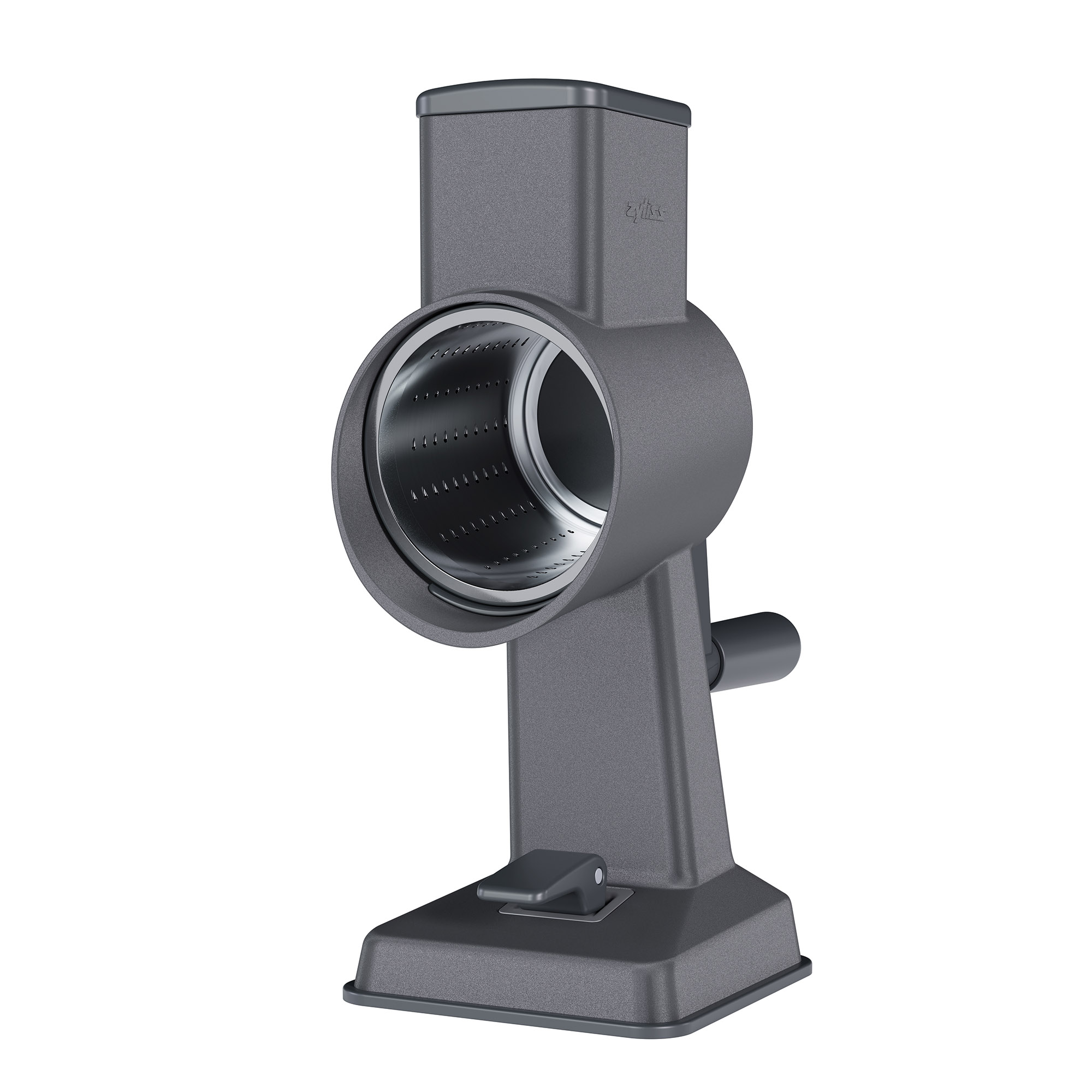 The drum grater, one of Zyliss' best-known products, has been redesigned to provide even more pleasure in the kitchen. The new Gourmet drum grater is characterized by improved user-friendliness. It is slightly higher and has a different inclination, making it more compatible with standard mixing bowls. The centered plunger is easier to guide and more ergonomically shaped. The housing is made of solid cast aluminum, the drums are made of high-quality stainless steel and the base guarantees a secure footing thanks to the suction cup. For more porous surfaces, the drum grater can alternatively be attached to worktops or table tops using the table clamp.