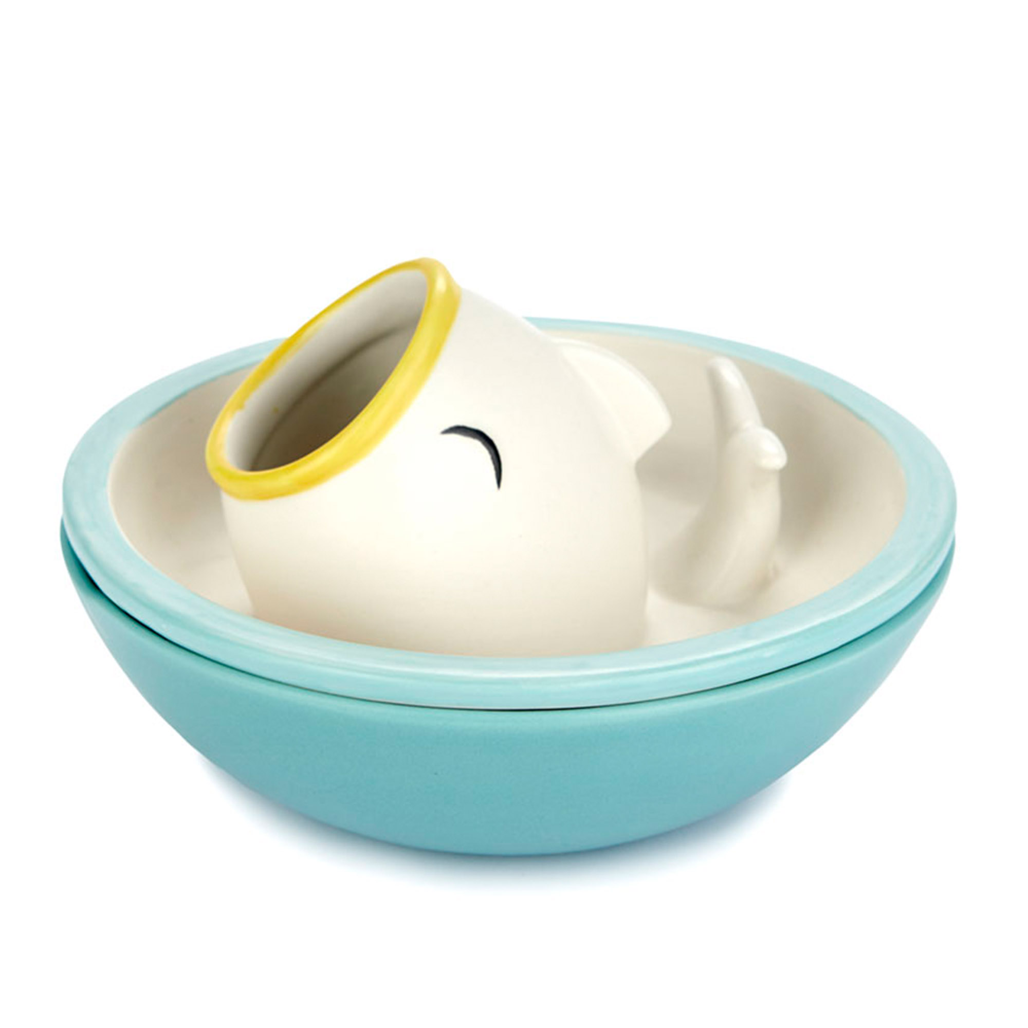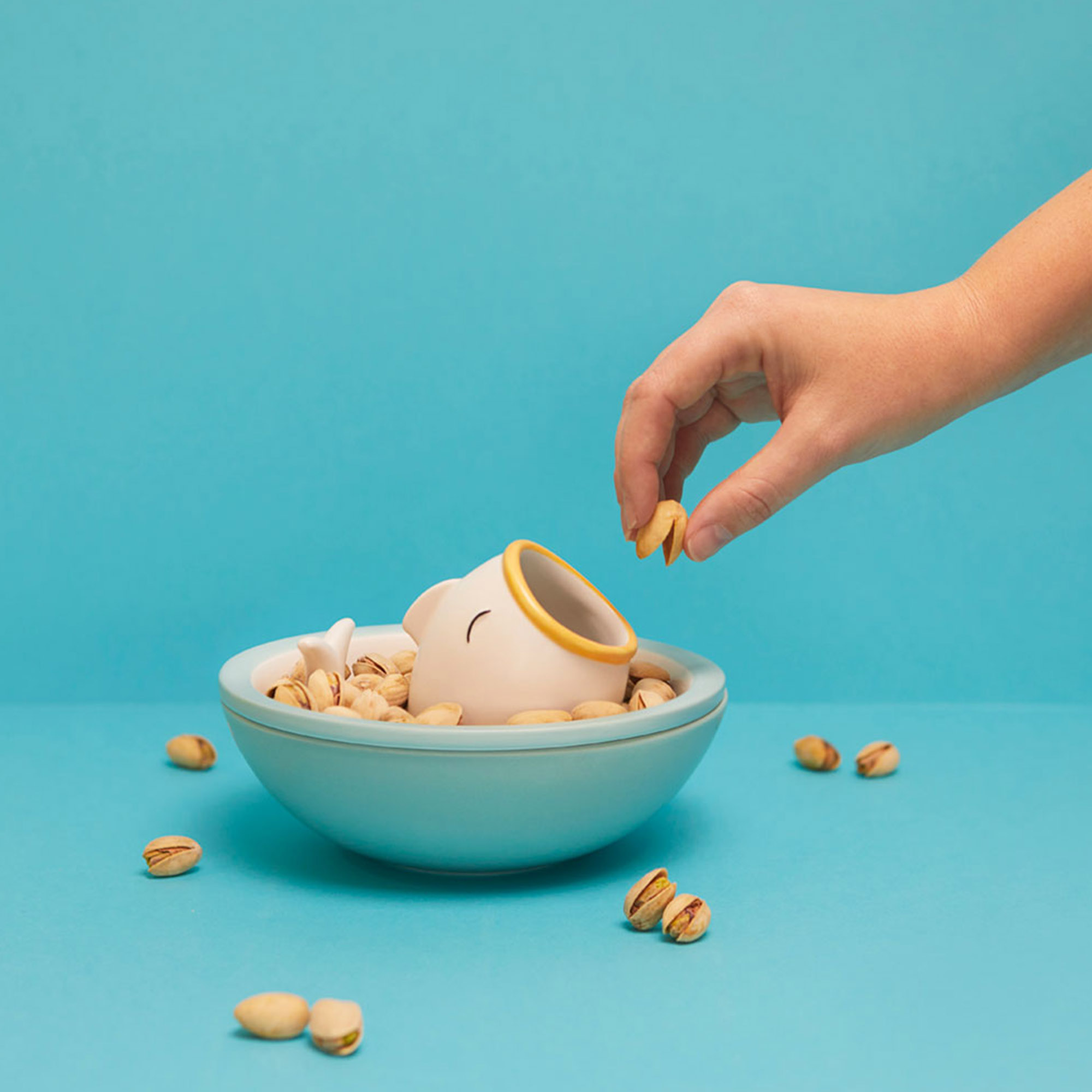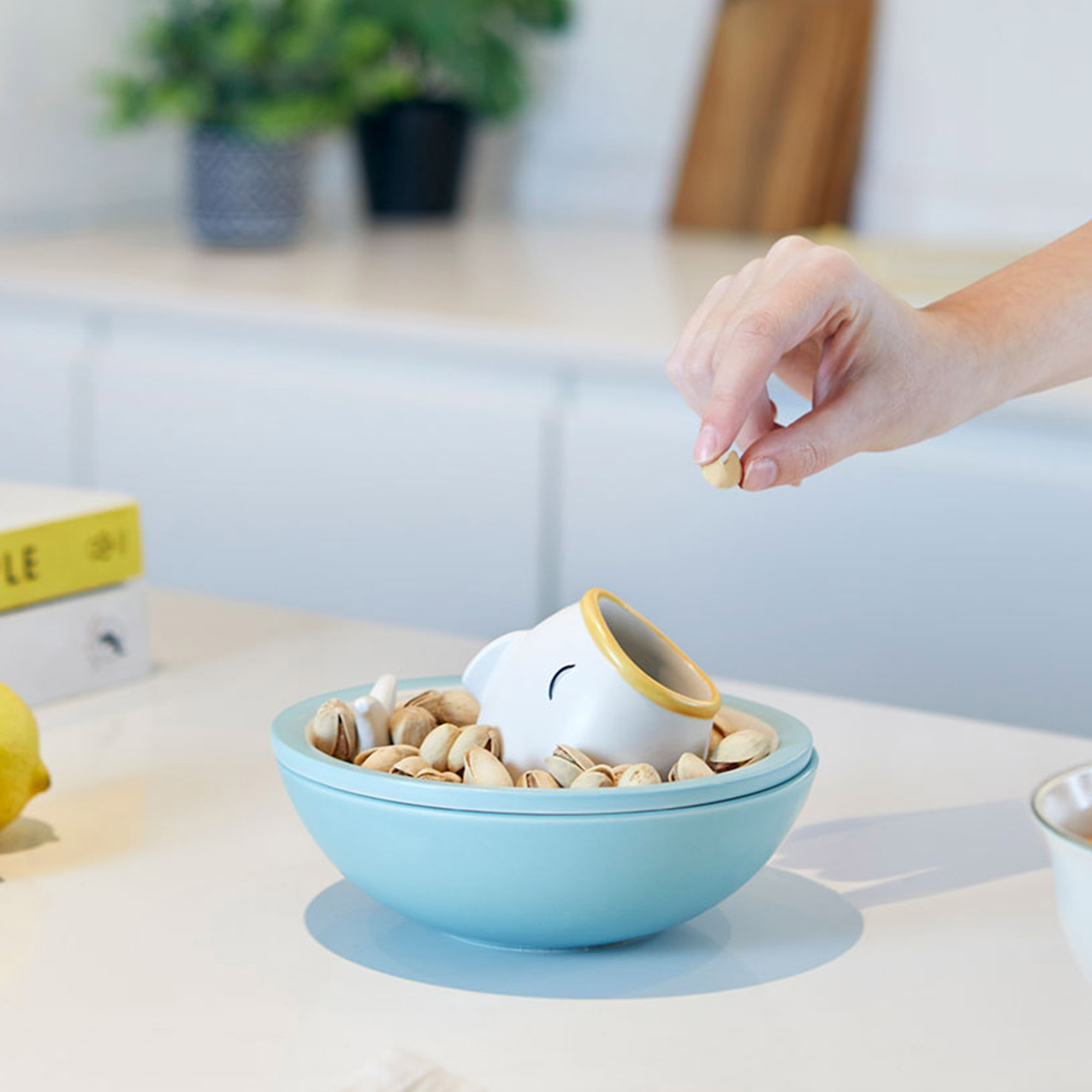 La coupe à apéritif "Poisson affamé" n'attire pas seulement le regard, elle est surtout très pratique. En effet, le poisson est impatient de manger les noyaux d'olives ou les coquilles de pistaches. Si les restes de snack disgracieux lui sont jetés dans la gueule, ils dégringolent vers l'intérieur et tombent dans la coquille cachée. Le bol est en effet composé de deux récipients, l'un visible et l'autre caché en dessous.