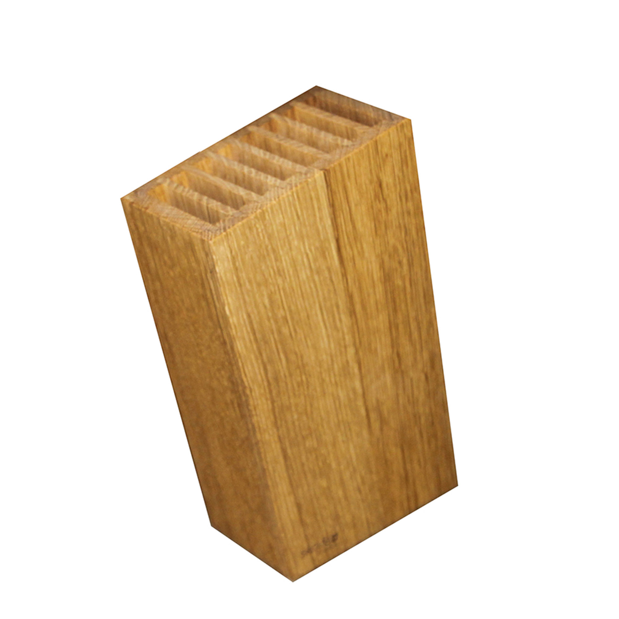 Le bloc à couteaux multifonctionnel sknife en bois de chêne local convient pour 8 couteaux, ce qui permet de gagner de la place. La lamelle inférieure est amovible pour la fourchette à viande ou les ciseaux.