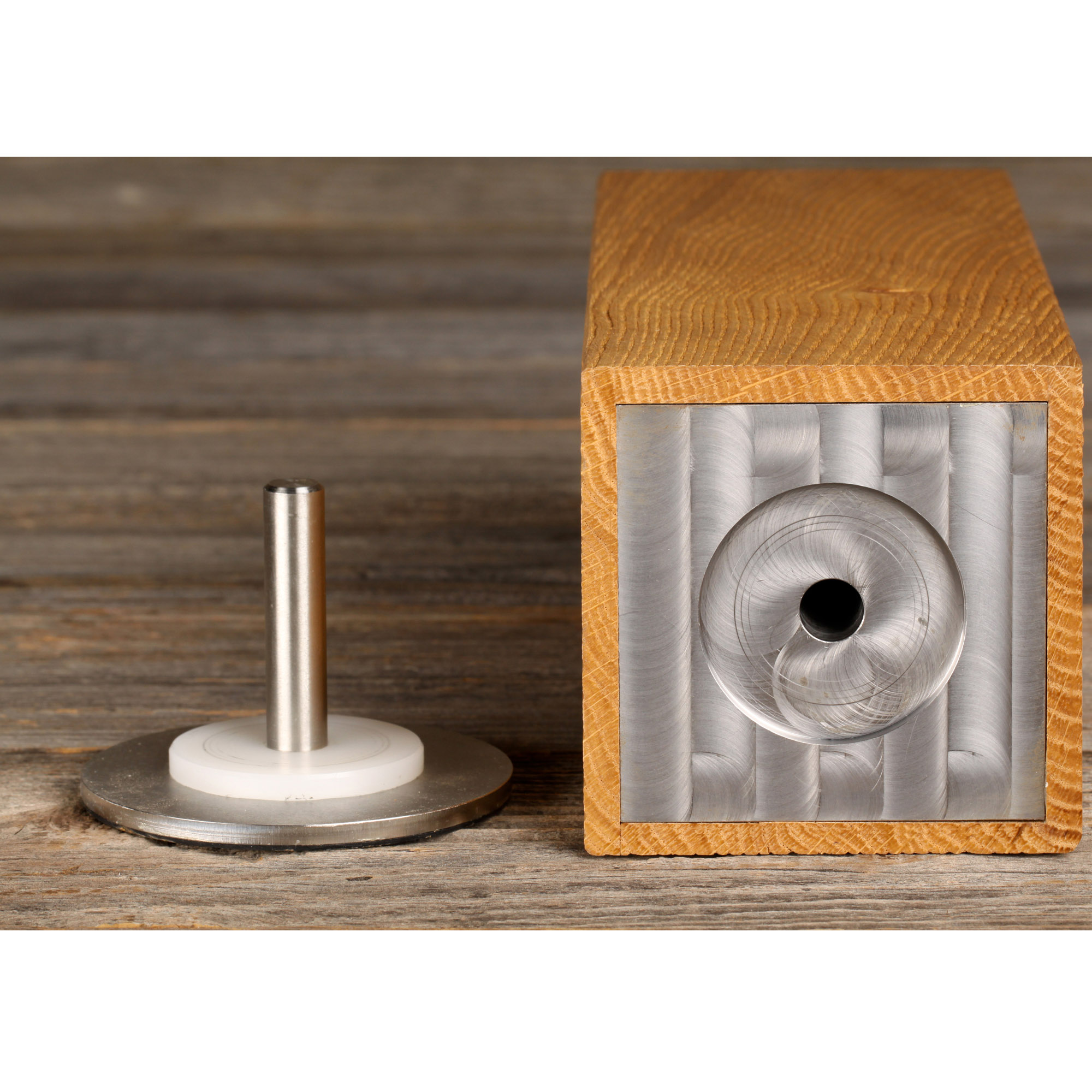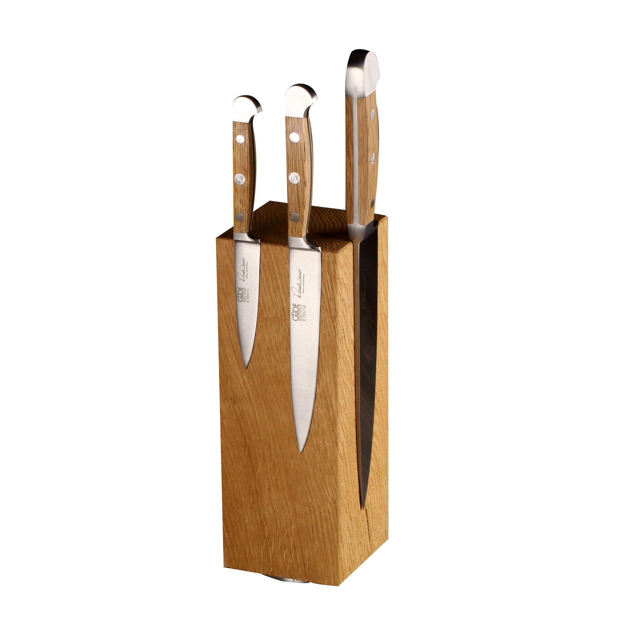 Le porte-couteaux est fabriqué en chêne indigène en Suisse et peut accueillir jusqu'à 5 couteaux grâce à des aimants intégrés. la base métallique assure la stabilité et la rotation du porte-couteaux.