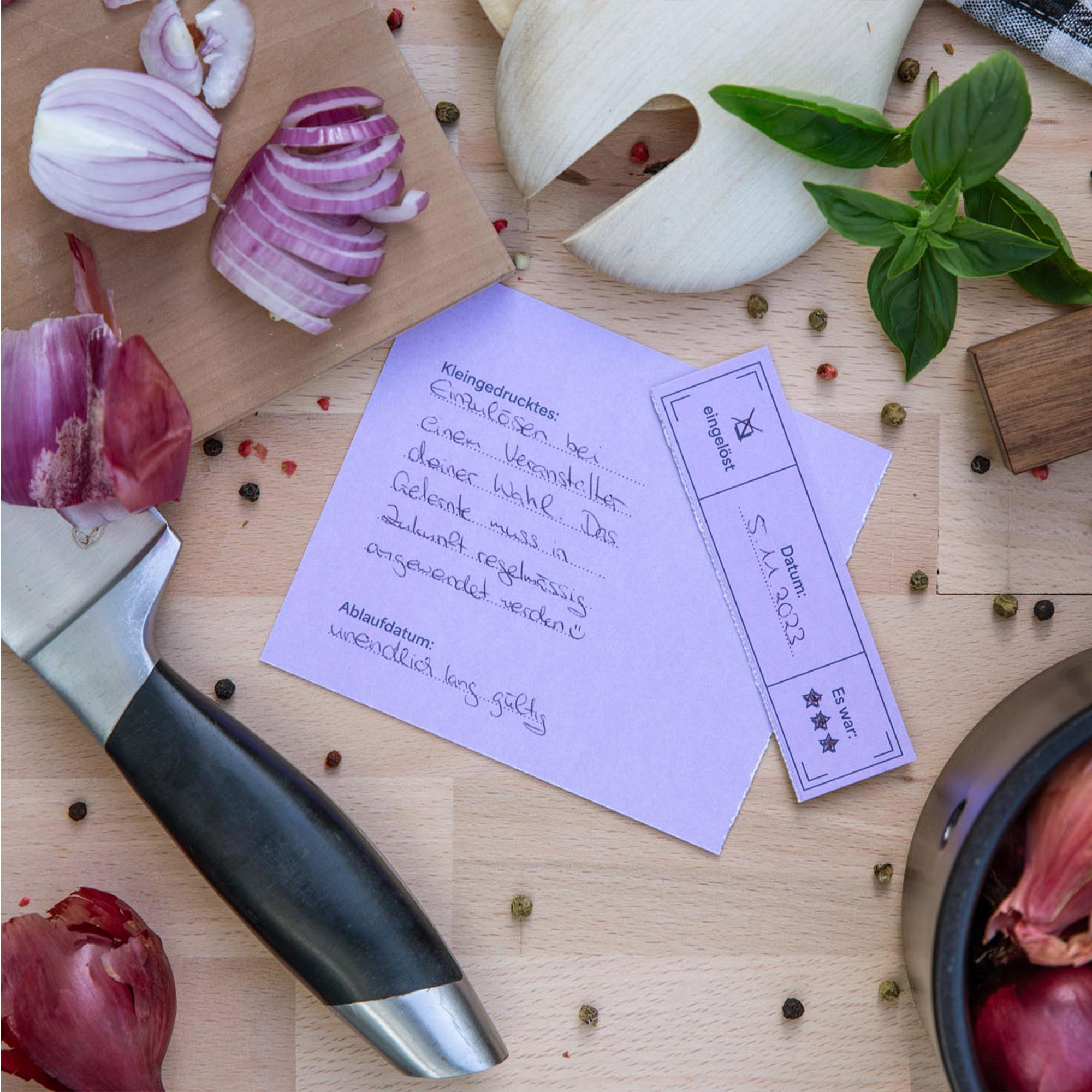 Le temps passé ensemble est le plus beau des cadeaux - surtout si tu peux ainsi réaliser des souhaits de longue date pour tes proches. Le set "Bon à Diescretion" t'offre le modèle parfait pour offrir des bons avec style. Une fois utilisé, il te suffit de détacher le billet correspondant - comme autrefois au cirque ou au cinéma (bonnes idées d'excursions au demeurant).