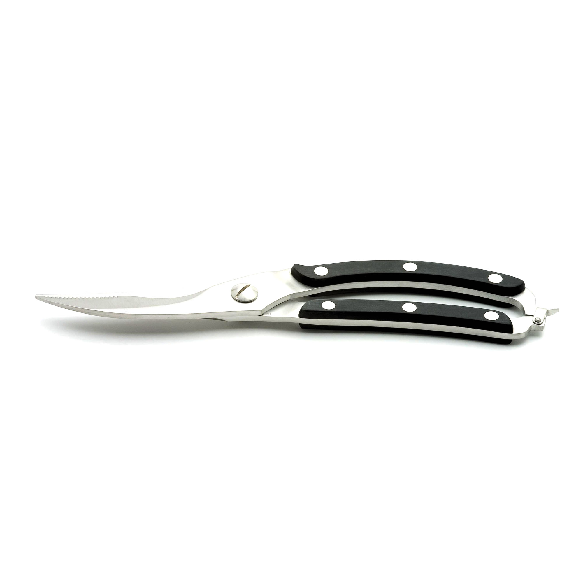 Ciseaux à volaille en acier inoxydable avec ressort interne et mécanisme de verrouillage.