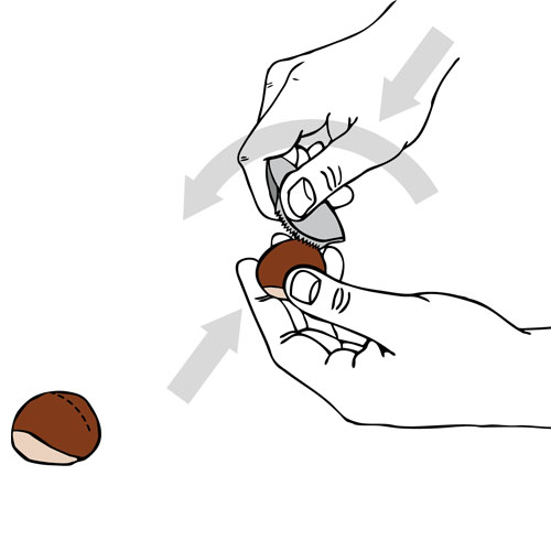 Guidez soigneusement la lame en dents de scie de Jack sur la courbure de la châtaigne, en appliquant une pression douce à forte. La noix reste indemne et le bol de châtaigne éclate au puits perforé dès qu'il est chauffé au four, sur une plaque chauffante ou sur un feu ouvert.