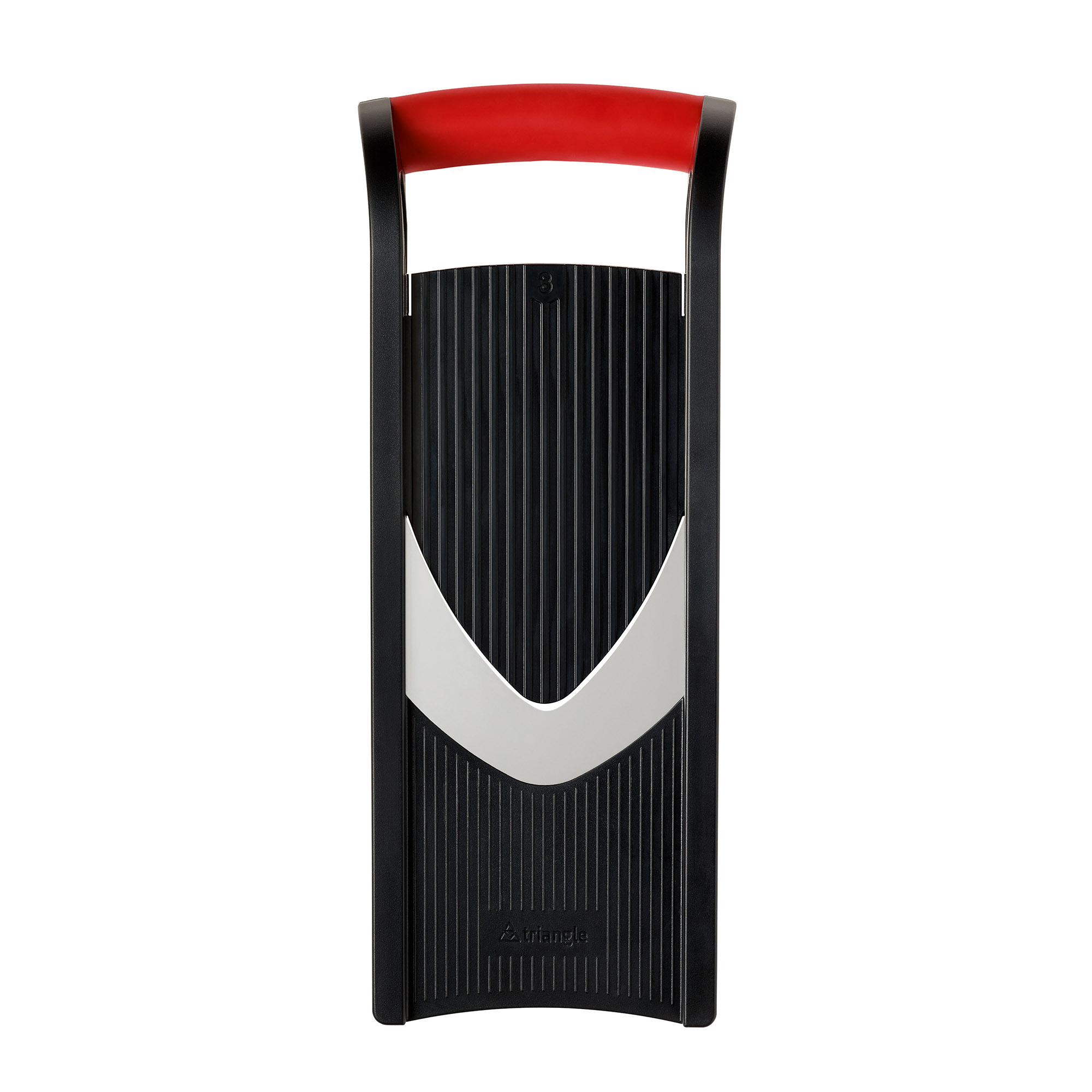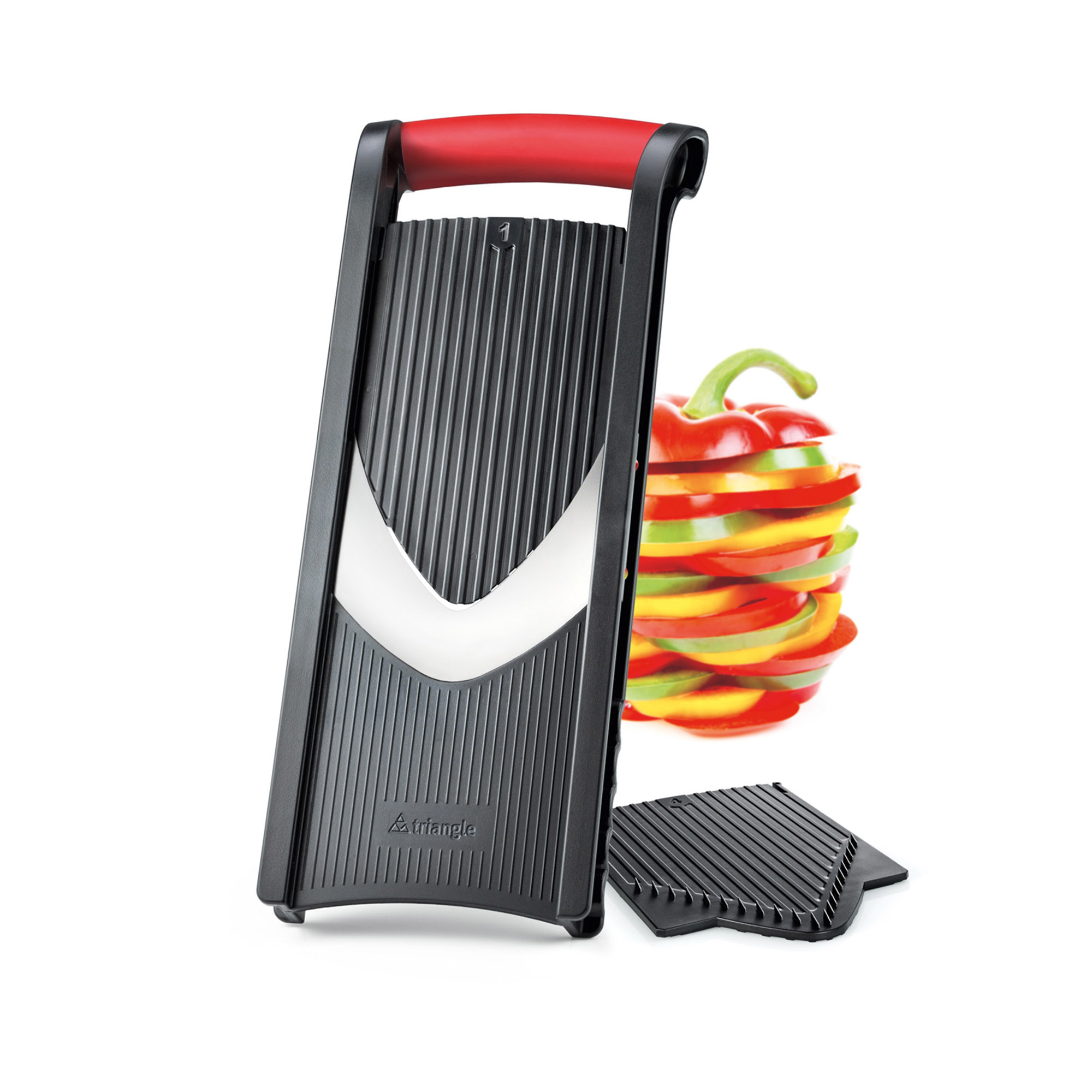 Avec support pour restes et deux inserts utilisables des deux côtés pour disques de 1 mm, 3 mm et 5 mm d'épaisseur ainsi que pour disques Julienne de 4 mm de largeur